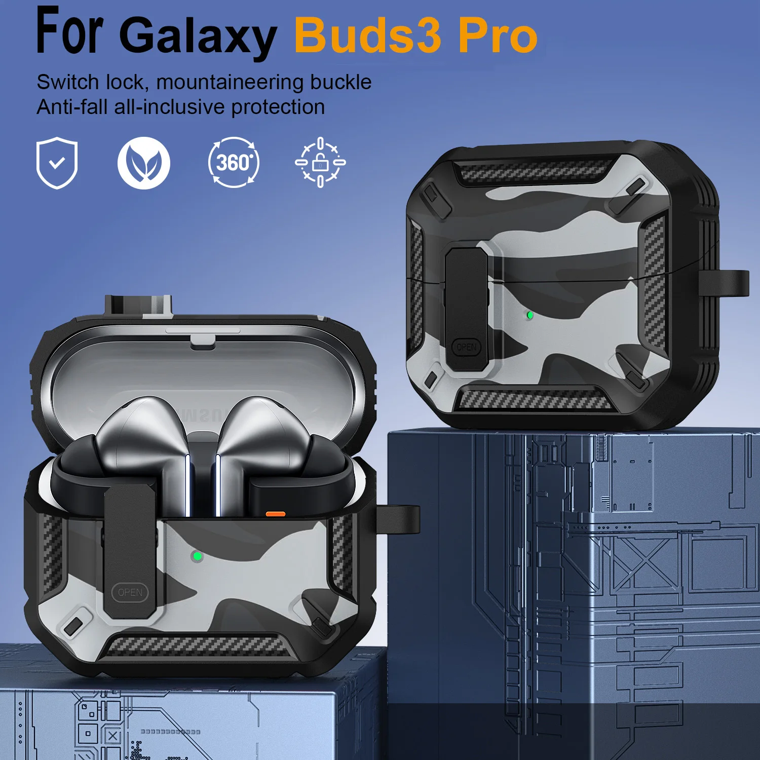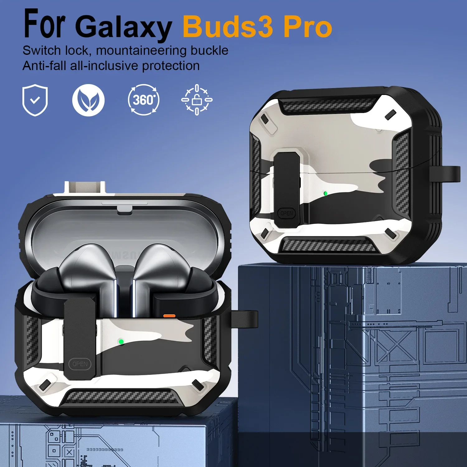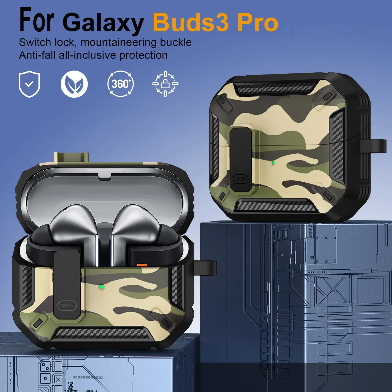 Funda de camuflaje elegante para Samsung Galaxy Buds 3 Pro Buds3 Pro Buzz 3 Pro, funda con cerradura, armadura de carcasa robusta, funda a prueba de golpes