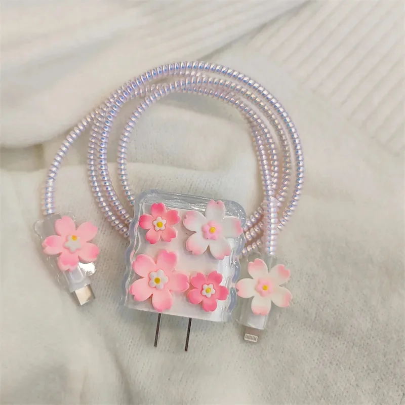 Funda de cargador de silicona transparente para IPhone, cubierta de protección de carga, color rosa, flor de cambio Gradual, 18W-20W, 11, 12, 13, 14, 15