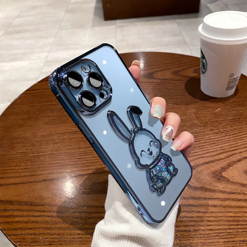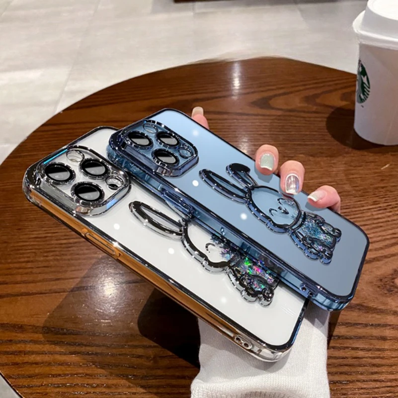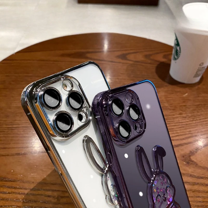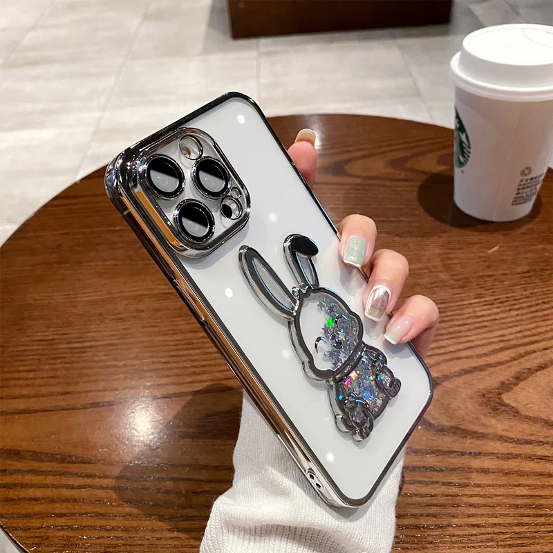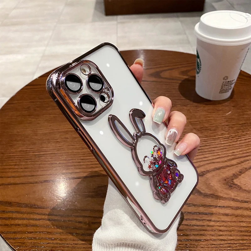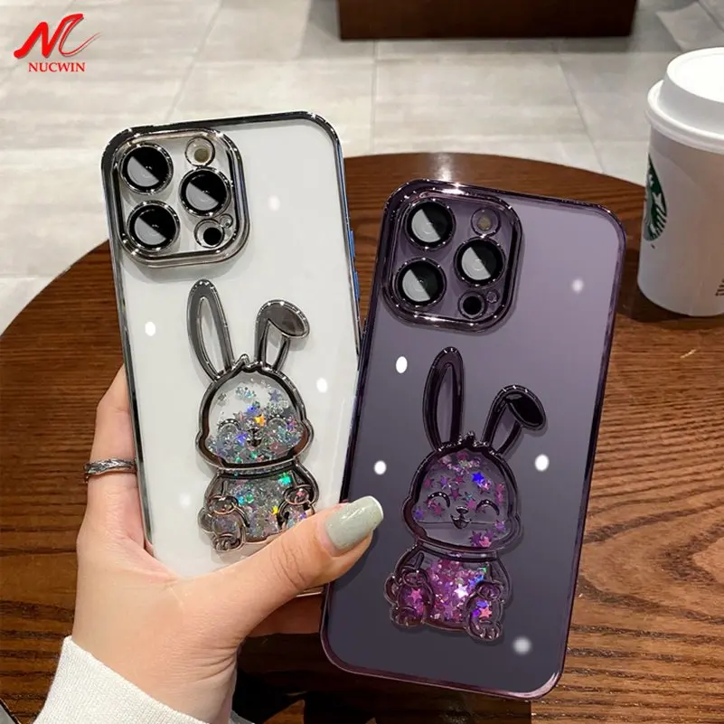 Funda de conejo de arena movediza con purpurina de lujo para iPhone 11, 12, 13, 14, 15 Pro Max, 14, 15 Plus, cubierta de silicona suave chapada transparente