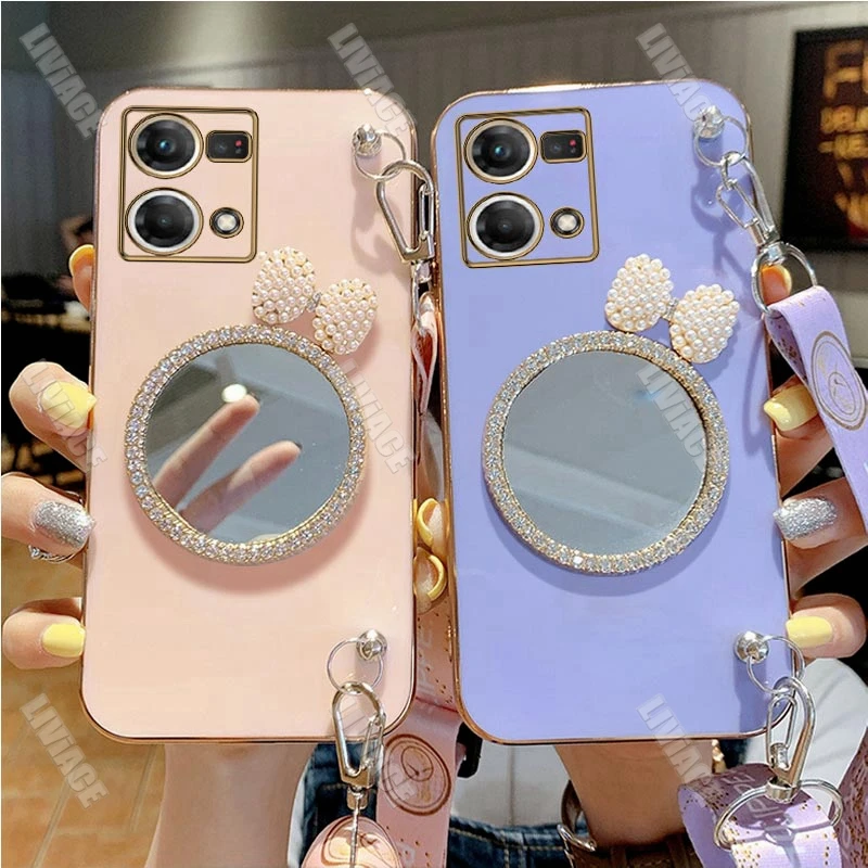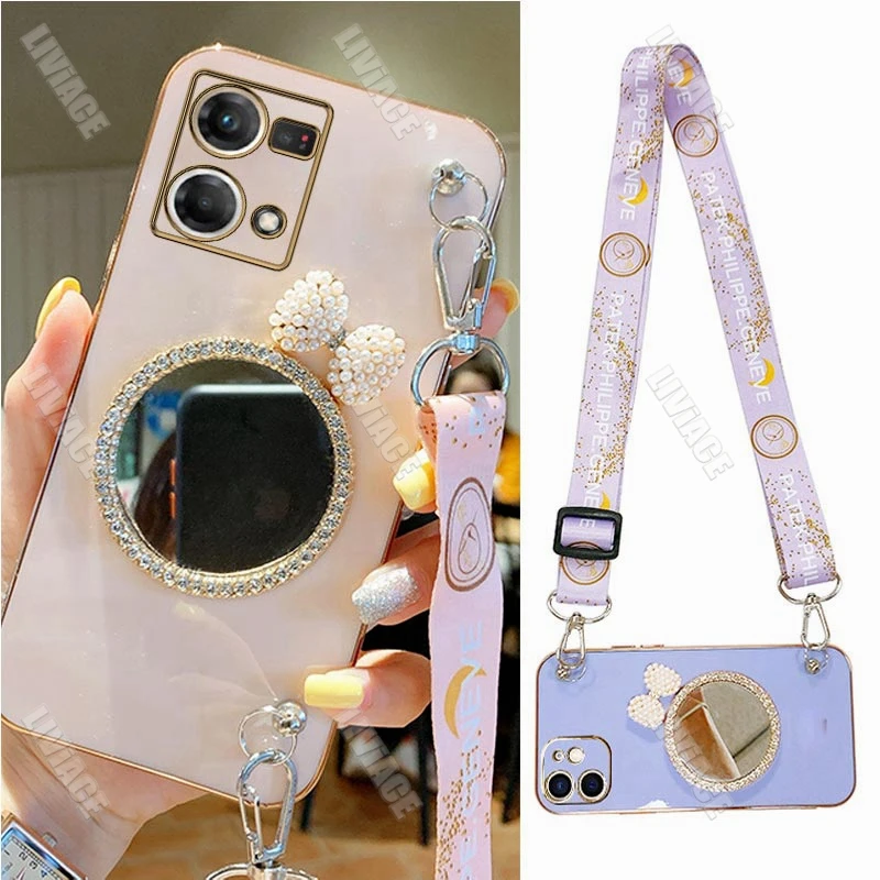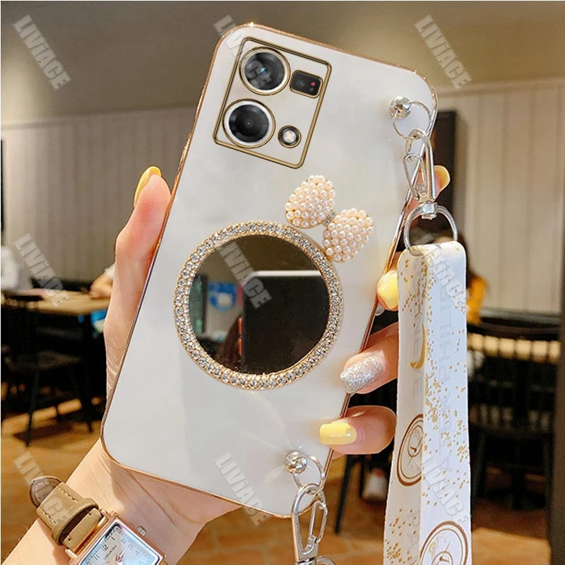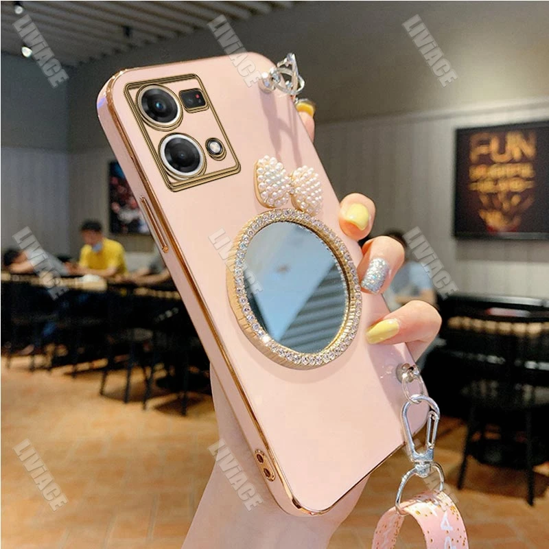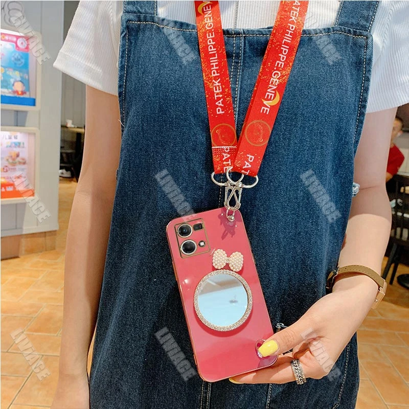 Comprar Funda con cordón para Oppo, carcasa con purpurina, arco, perla, espejo, para Reno 8, Reno 7, 8, 9 Pro Plus, 8T, 4G, 5G, 5F, 2Z, 2F, 3, 5, 6, 6Z, 4G, 5G