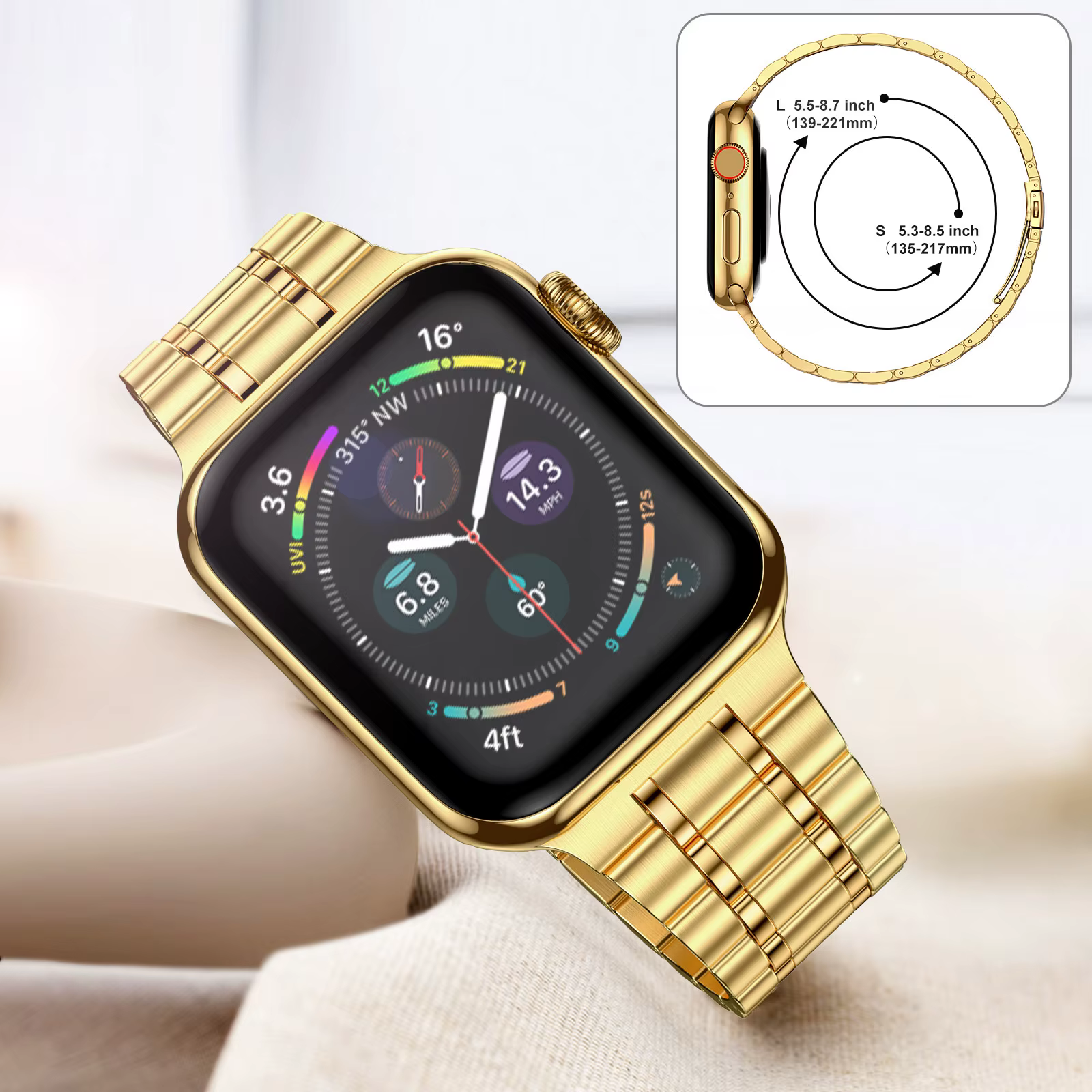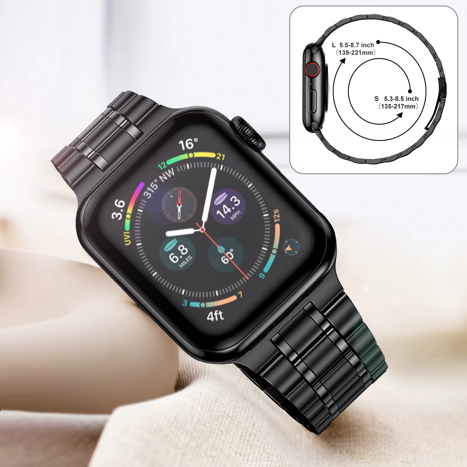 ⌚ Correa totalmente metálica para Apple Watch Band: compatible con Apple Watch 45 mm (serie 7), 44 mm (serie SE/6/5/4), 42 mm (serie 3/2/1), identifique el tamaño de su reloj y elija el correcto..Las bandas se ajustan a muñecas de 5,3"-8,7".