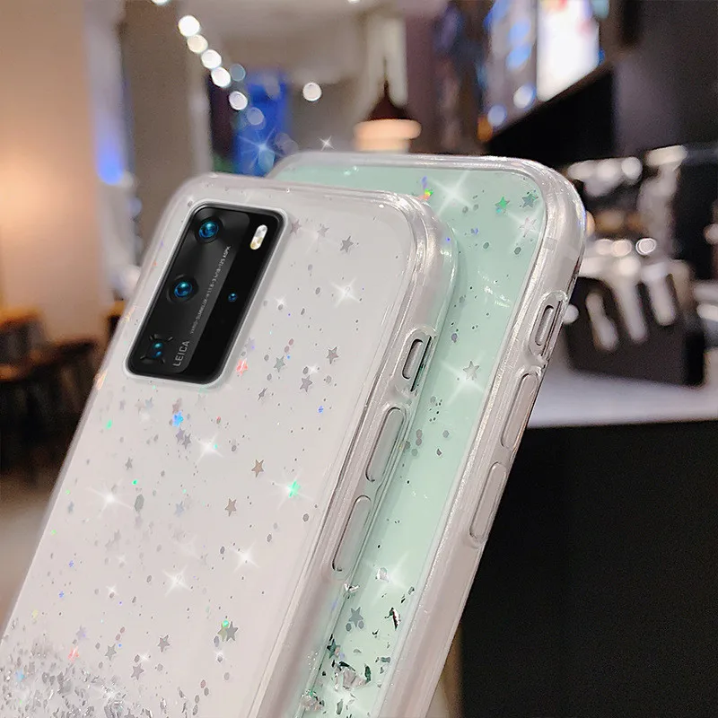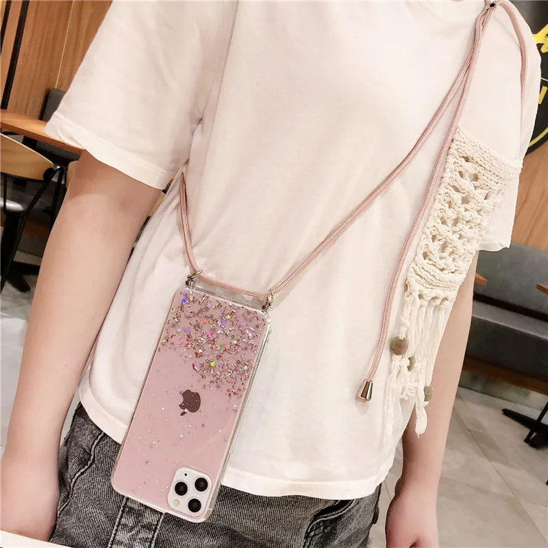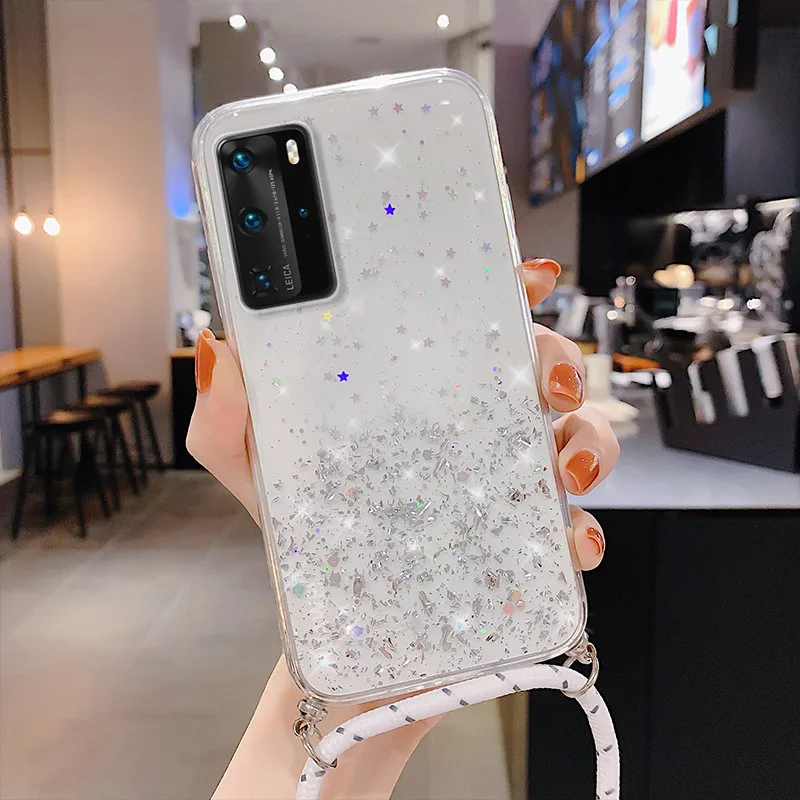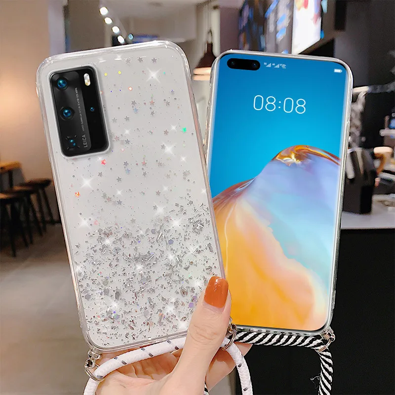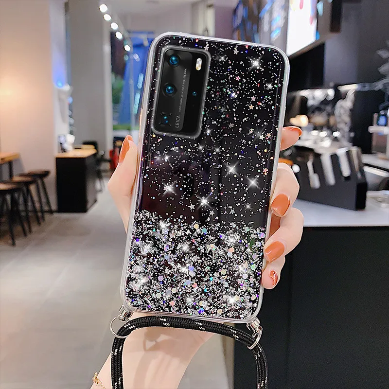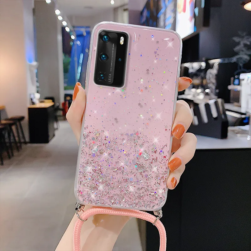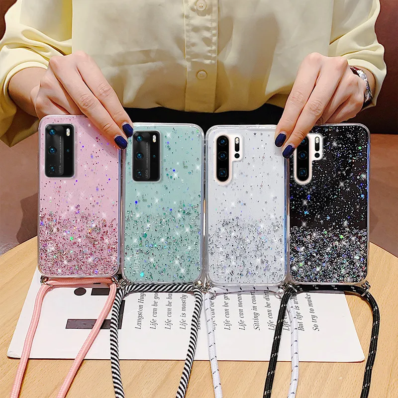Funda con correa de purpurina para Huawei, funda de epoxi con purpurina, collar, cadena, para Huawei P40, P30, P20, Mate 20, 30 Lite, Honor 20 Pro, 8X, 10, 10i, Nova 5T