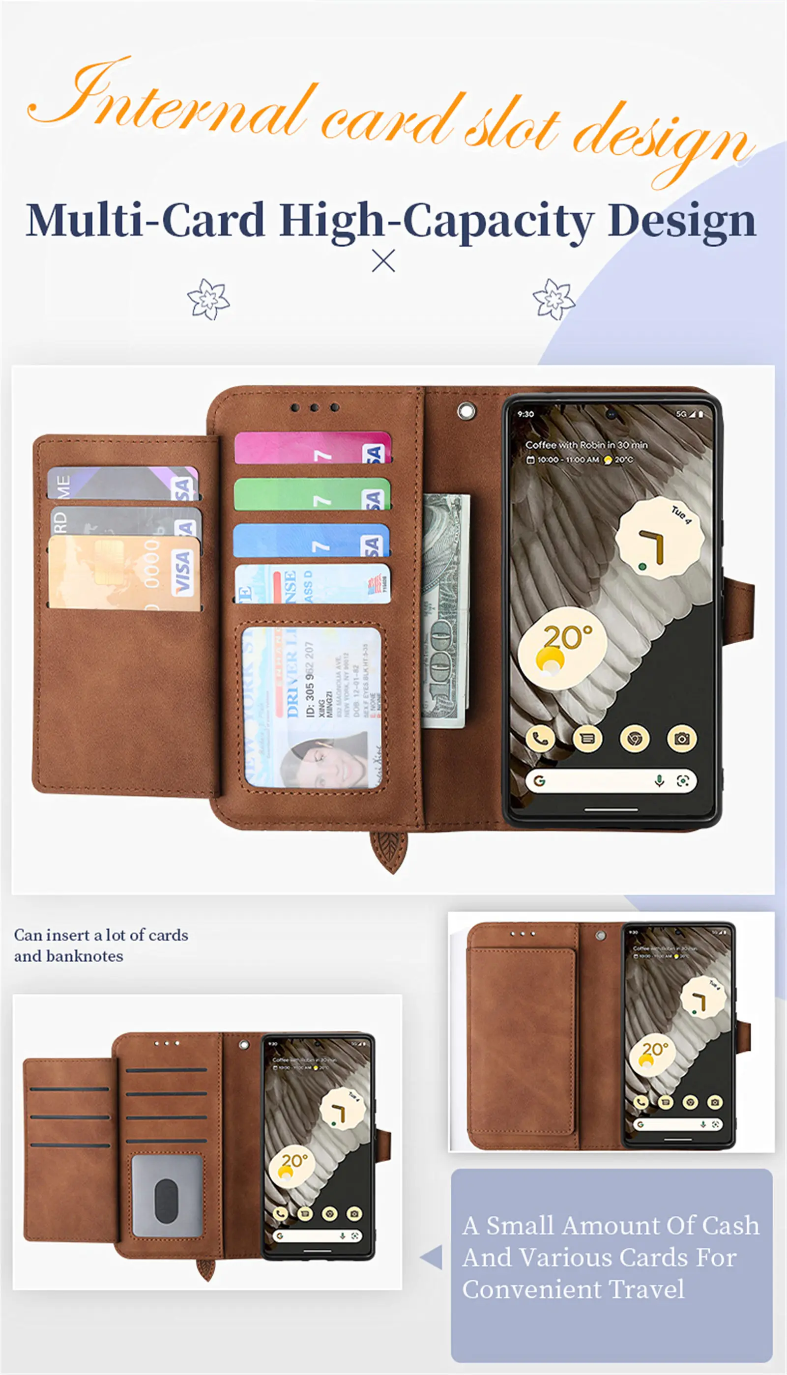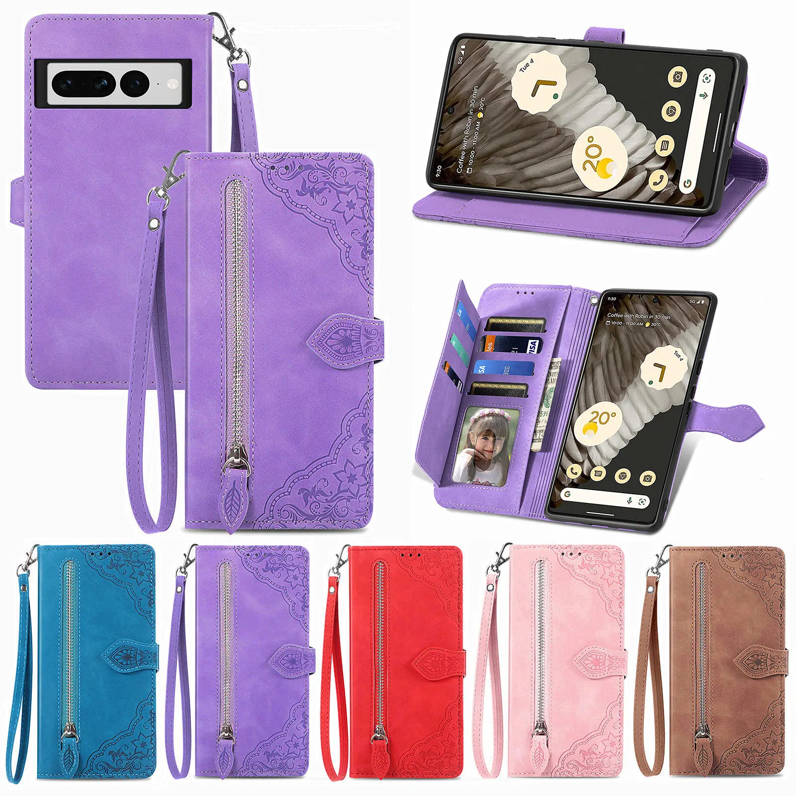 Zipper Wallet Cards Solt Case For Google Pixel 7 7 Pro 7A 5A 6A 6 8 5G 360 Protect Coin Purse Hand Strap Book Funda Flip Cover
