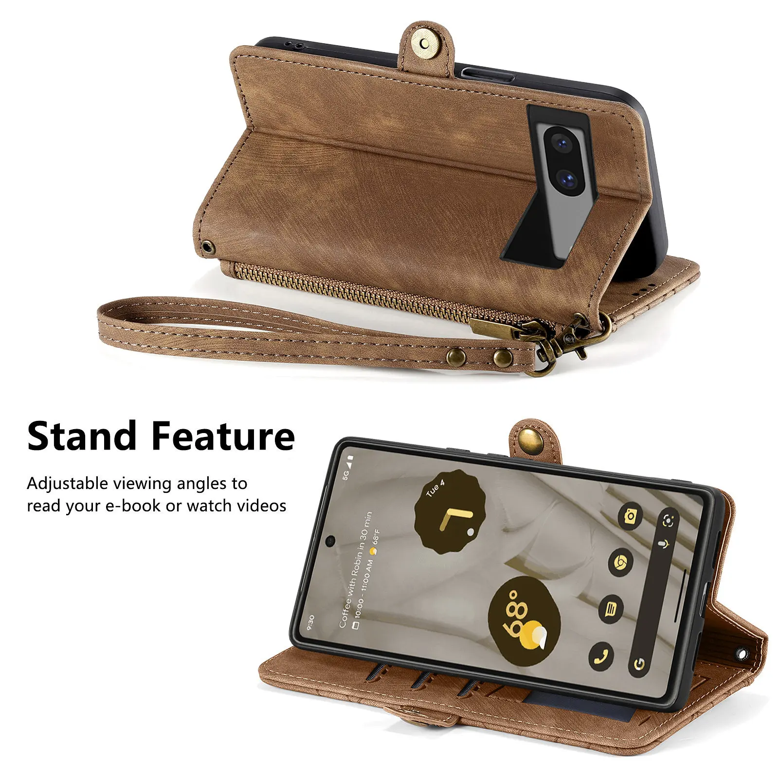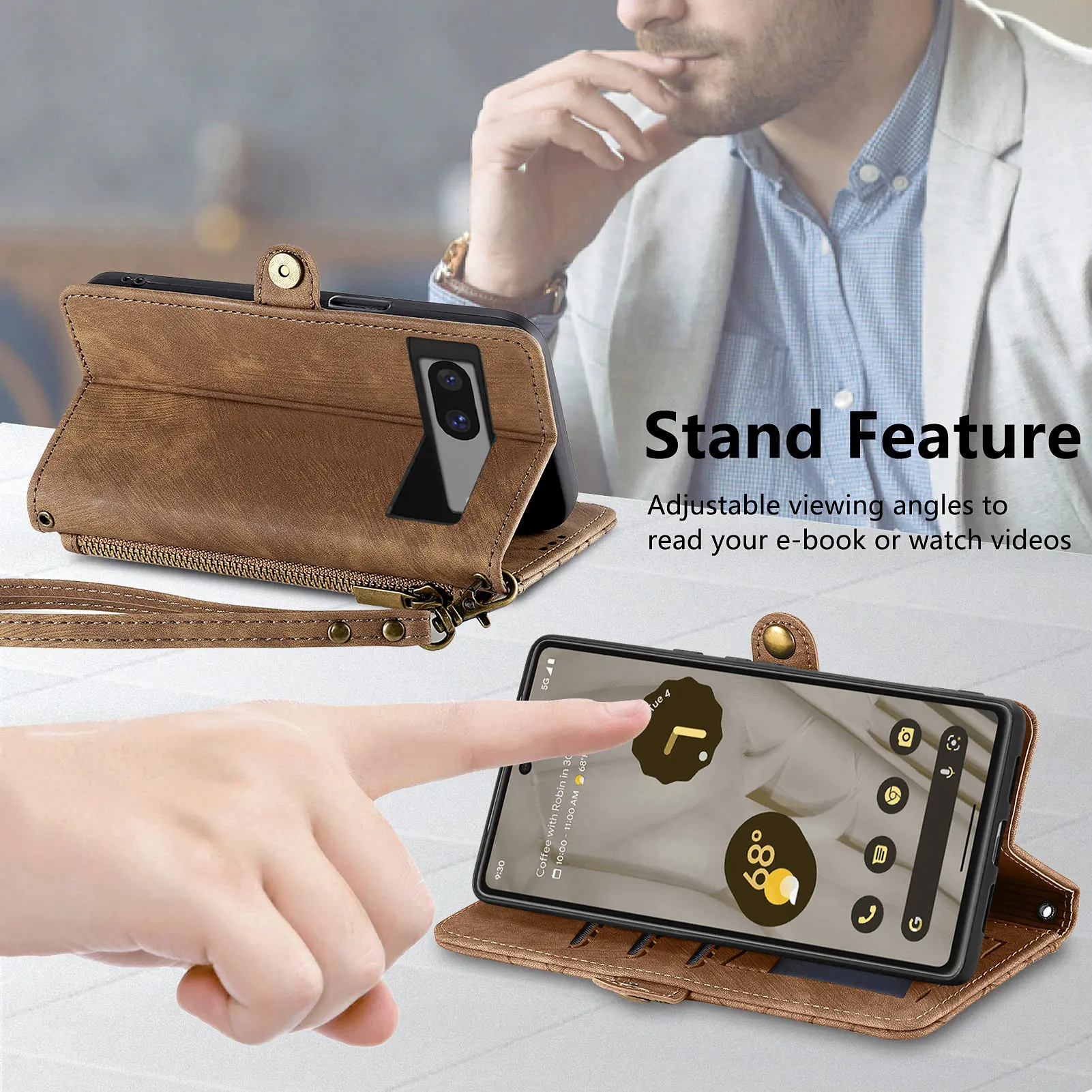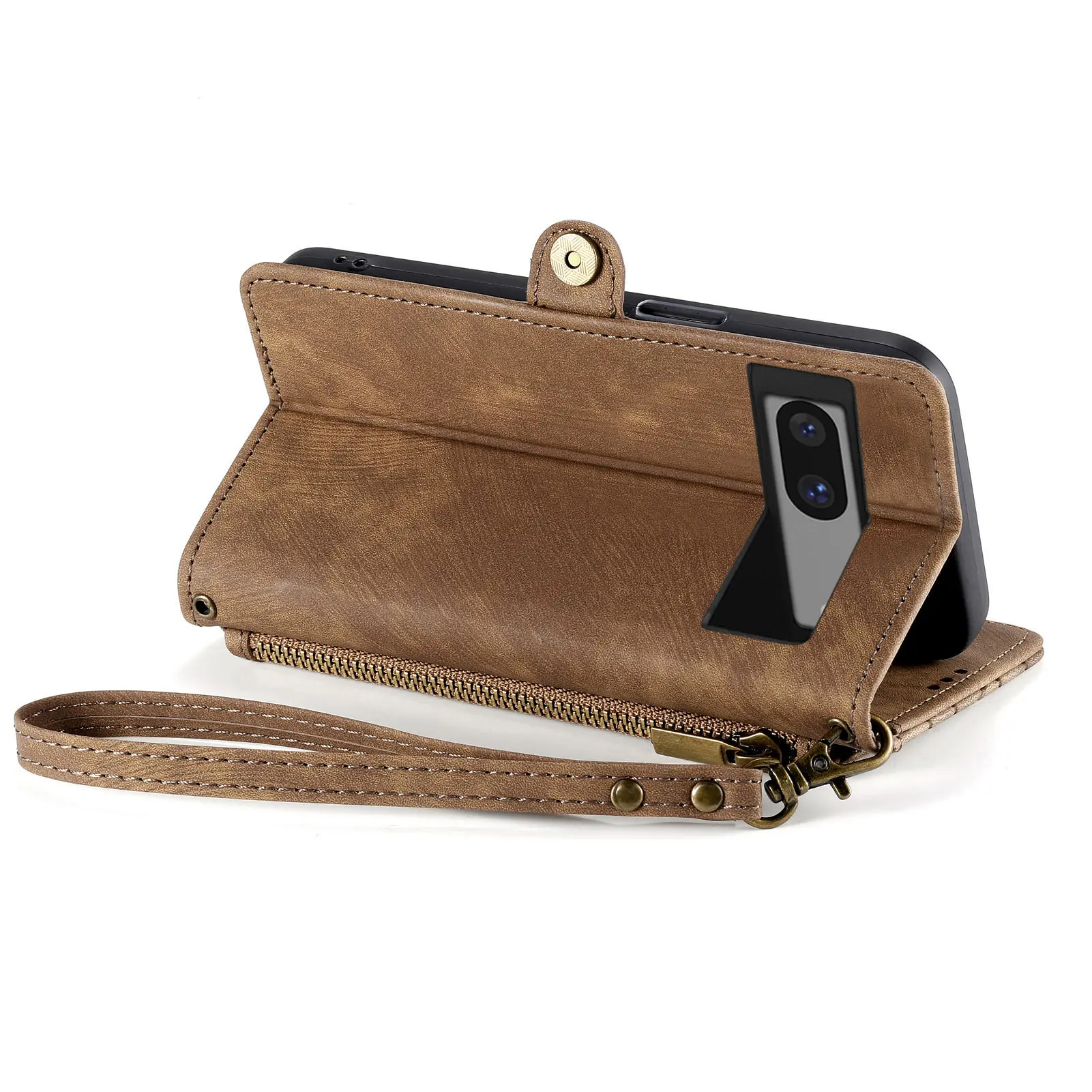 Comprar Funda de cuero con cremallera para Google Pixel 7 Pro 7A 6A 6 8 5G, cartera con bolsa para tarjetas, protección completa, monedero, correa de mano, funda de bolsillo con tapa para libro