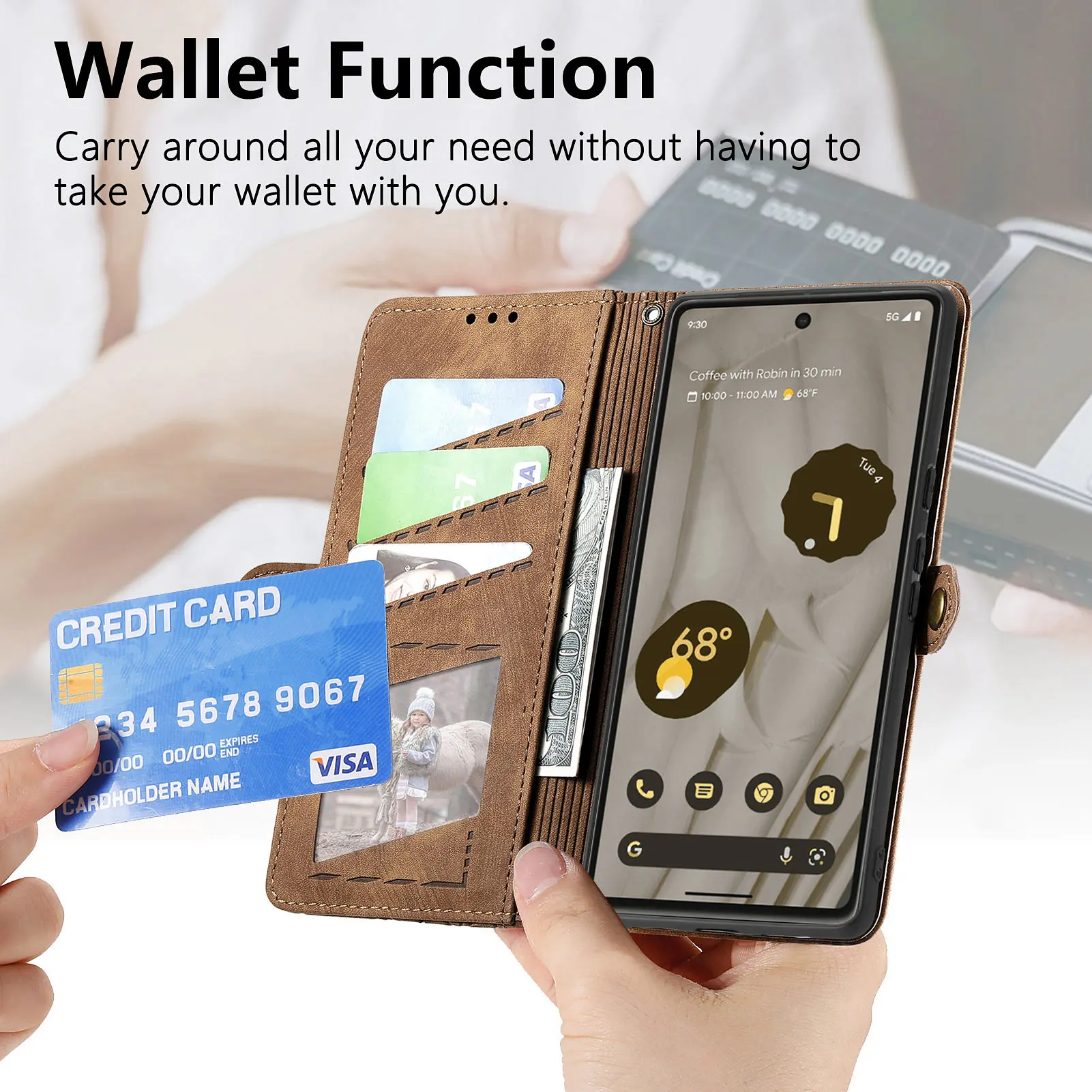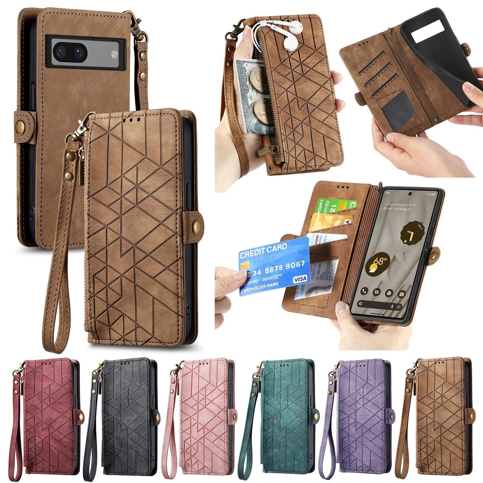 Comprar Funda de cuero con cremallera para Google Pixel 7 Pro 7A 6A 6 8 5G, cartera con bolsa para tarjetas, protección completa, monedero, correa de mano, funda de bolsillo con tapa para libro