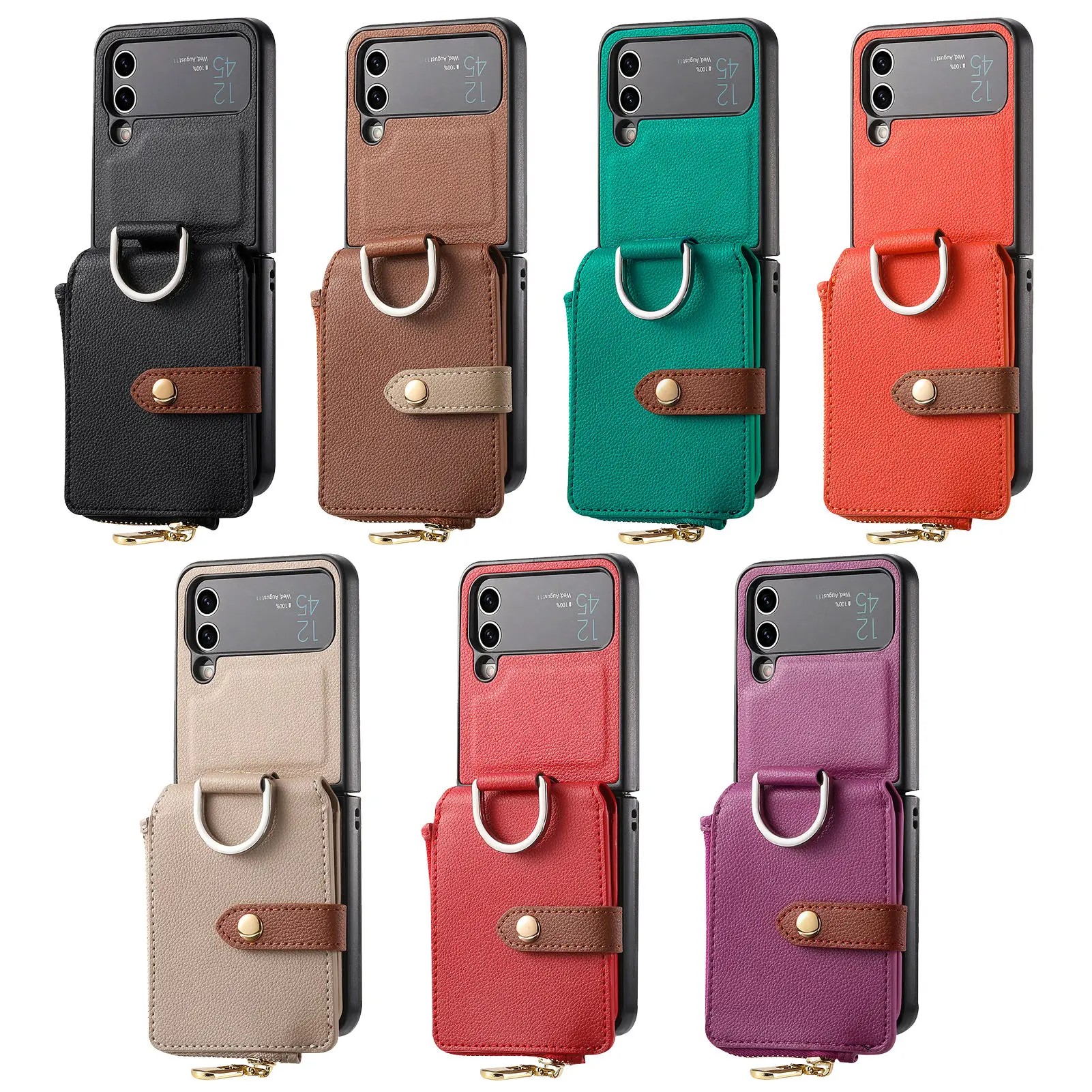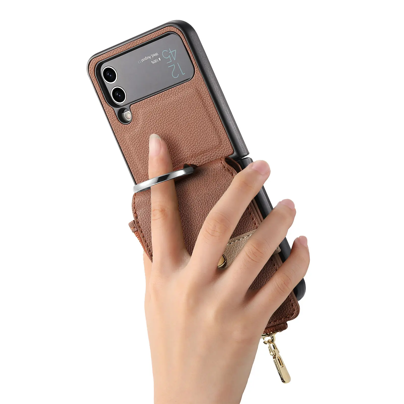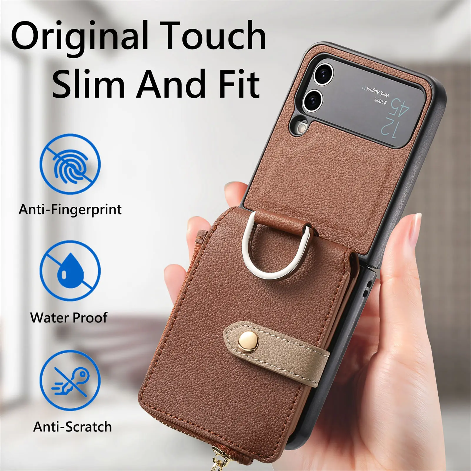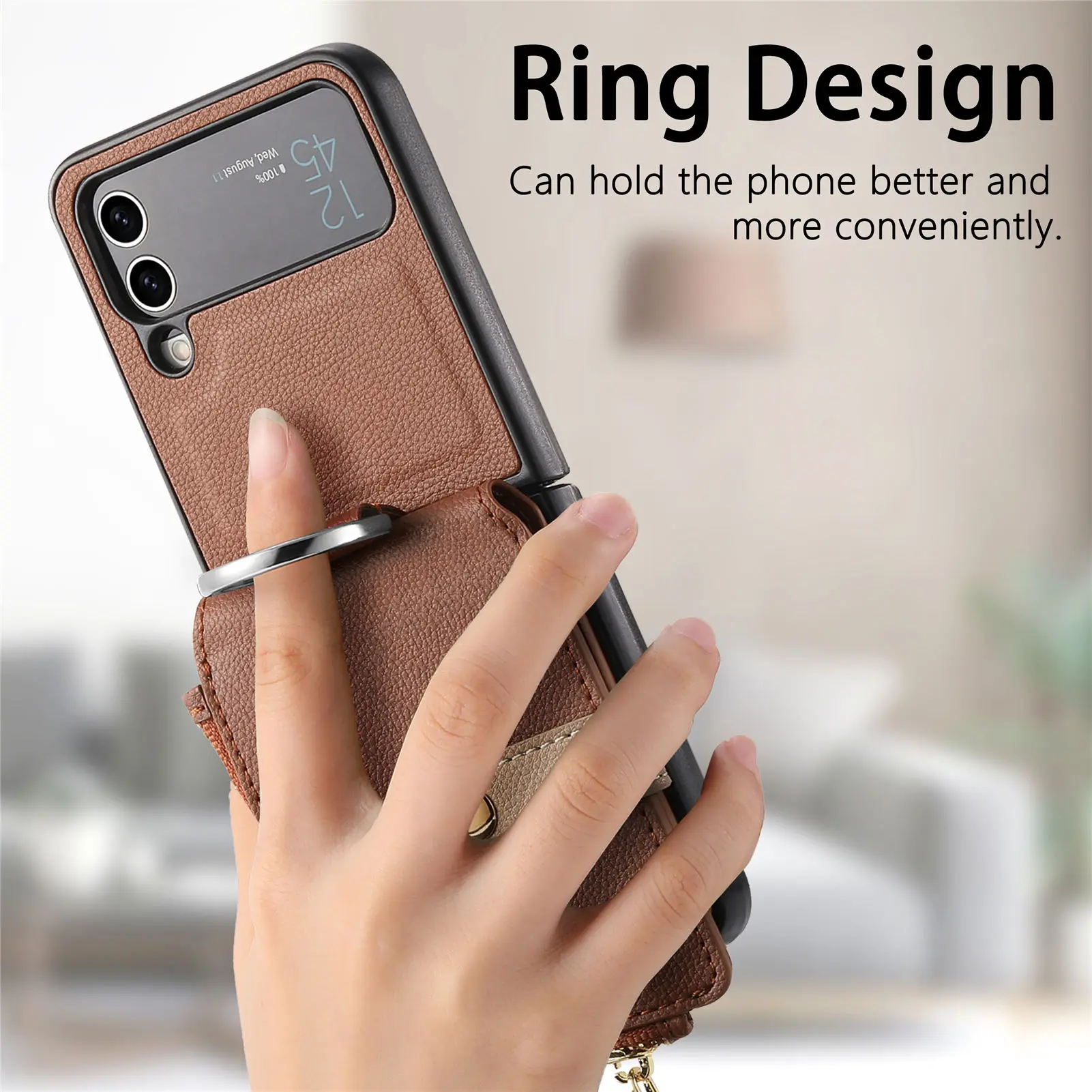 Funda de cuero con cremallera vertical para tarjetas Solt Wallet para Samsung Z Flip 5 4 3 5G Stand a prueba de golpes Flip5 Purse Ring Holder Pocket Cover