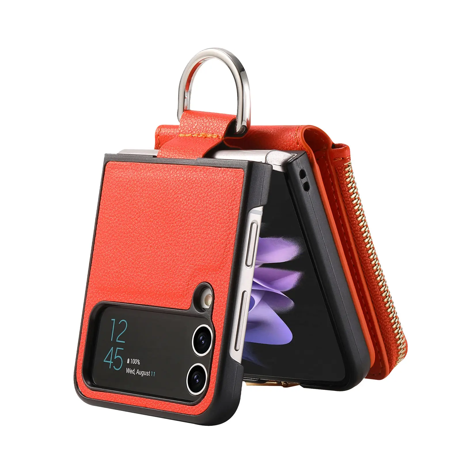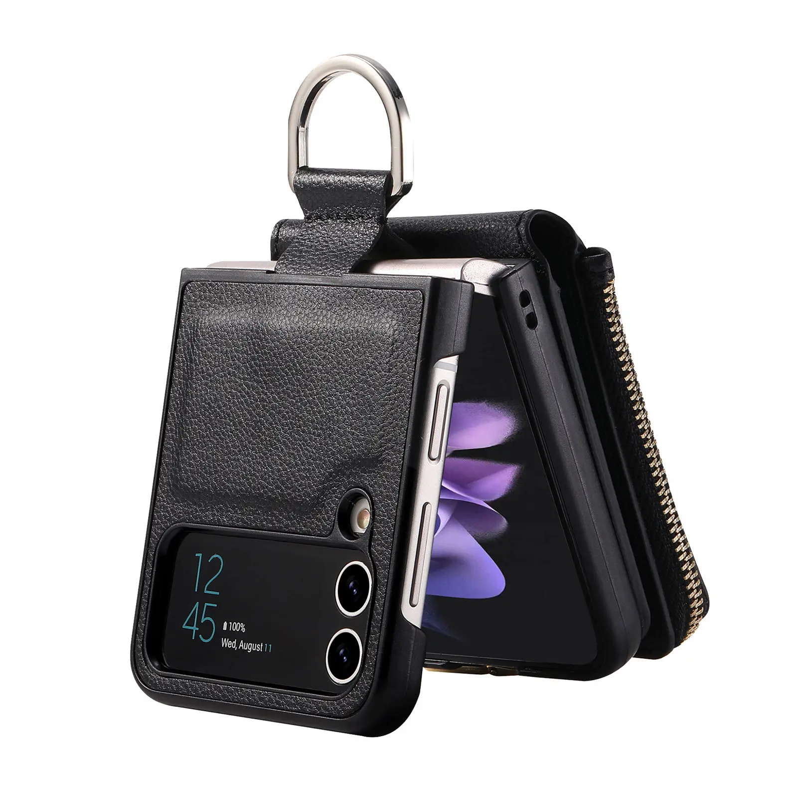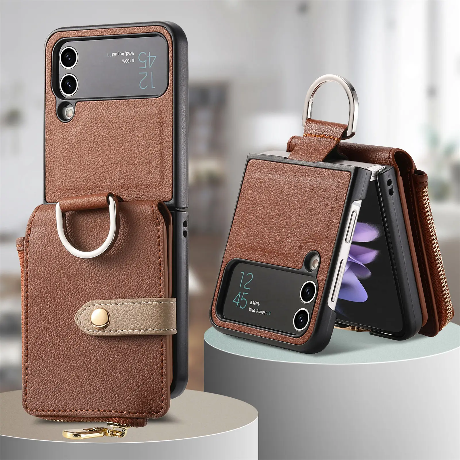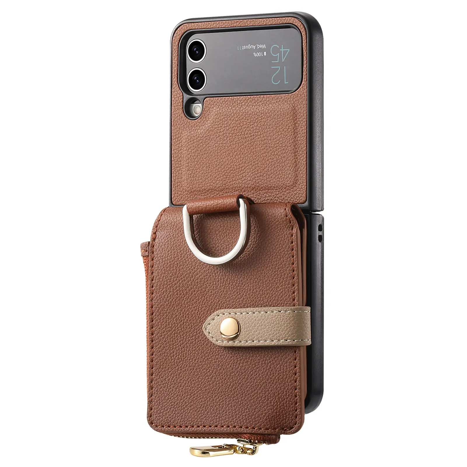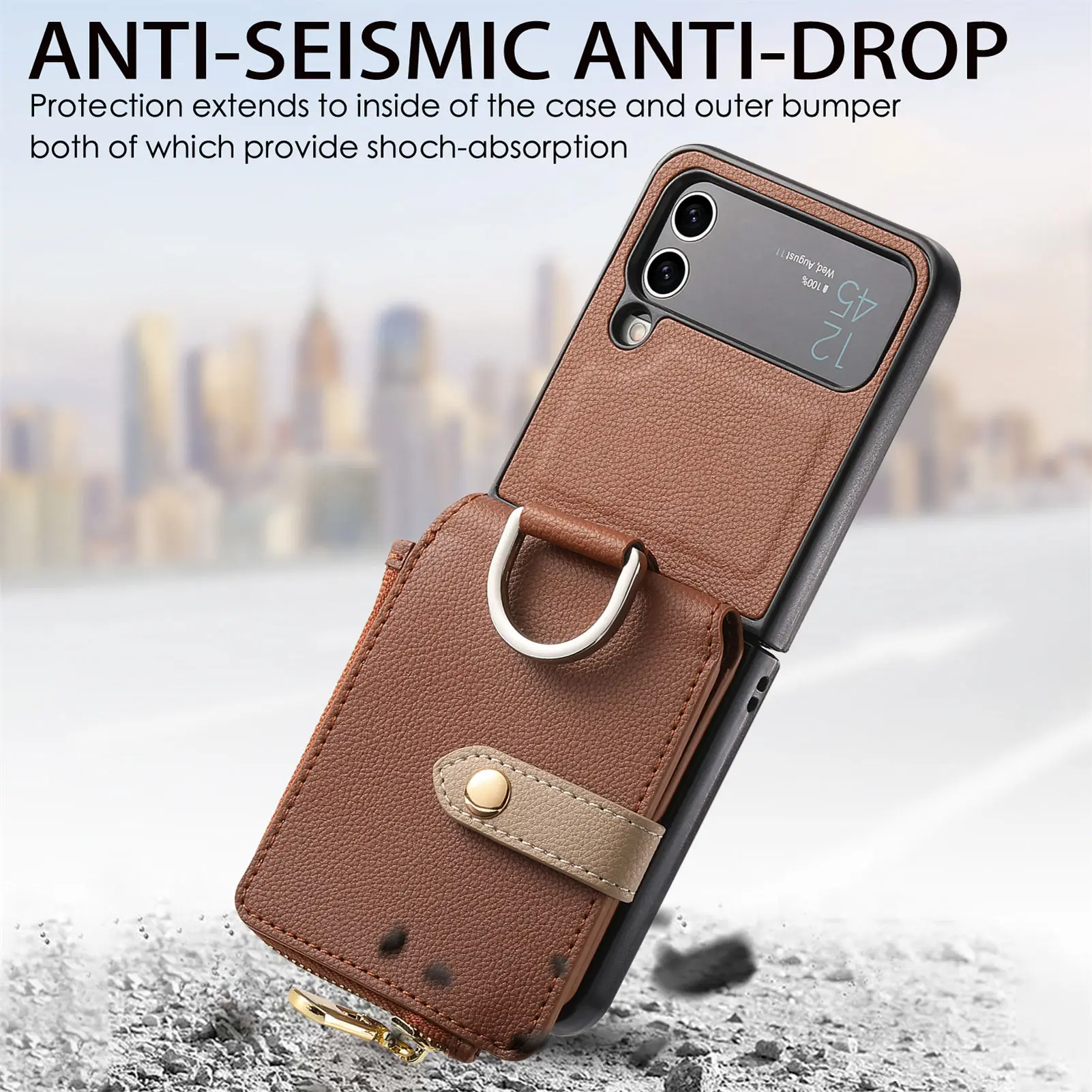 Funda de cuero con cremallera vertical para tarjetas Solt Wallet para Samsung Z Flip 5 4 3 5G Stand a prueba de golpes Flip5 Purse Ring Holder Pocket Cover