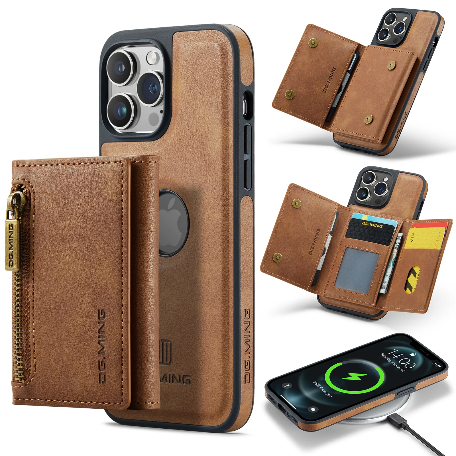 Funda de cuero con cremallera para tarjetas desmontable 2 en 1 para iPhone 15 13 12 11 Pro Max 14 Plus, funda magnética de carga inalámbrica