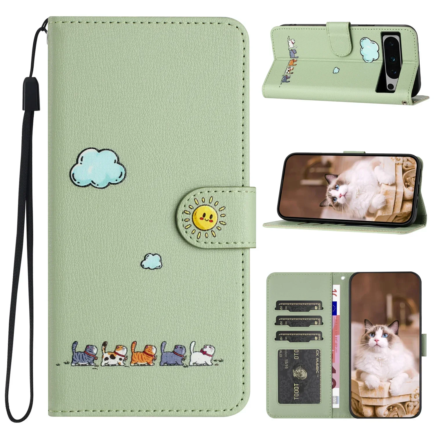 Lindo gato tarjetas de cuero Solt cartera funda de teléfono para Google Pixel 8 9 Pro XL 7 7A 6A soporte libro Flip bolsa cubierta bolsillo Delgado Fundas