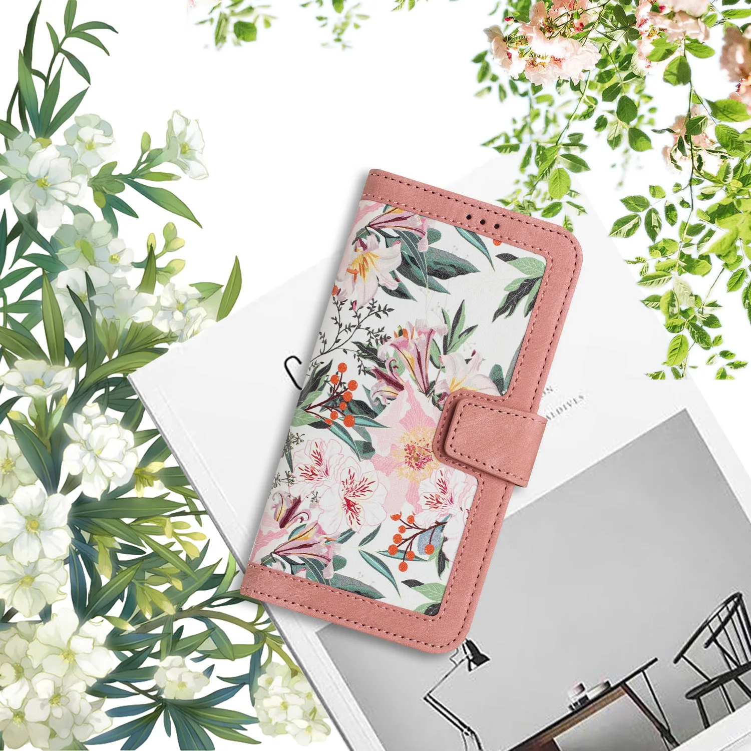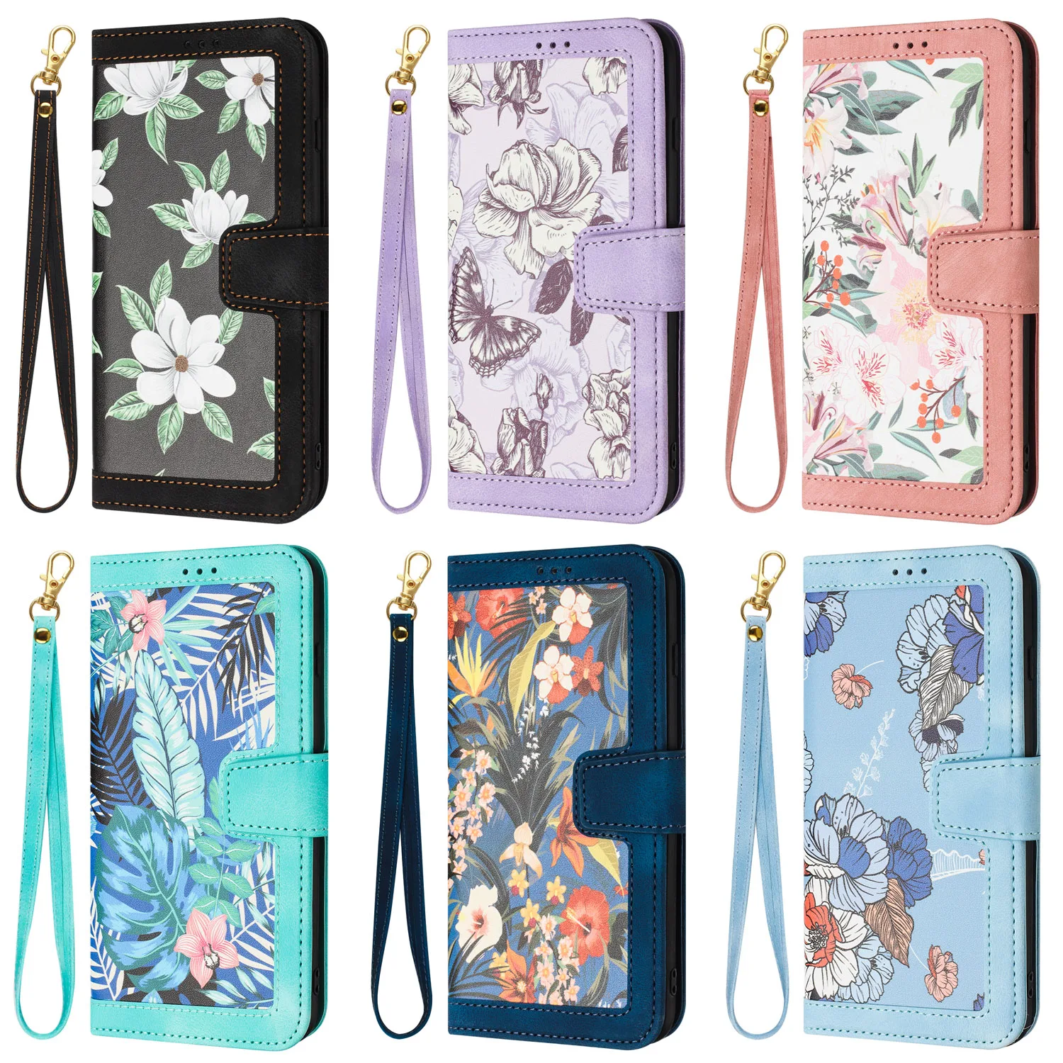 Funda de cuero con patrón de flores para IPhone, carcasa con correa de mano para tarjetas, compatible con modelos 14 Pro Max, 15, 13, 12, 11, X, XS, XR, 7, 8 Plus, SE2022