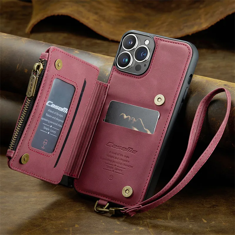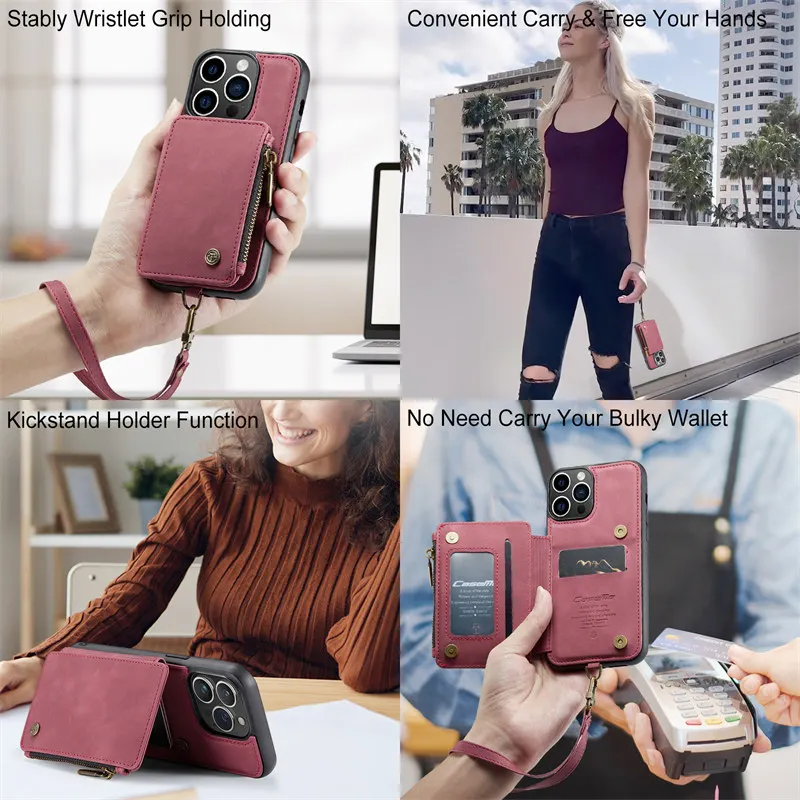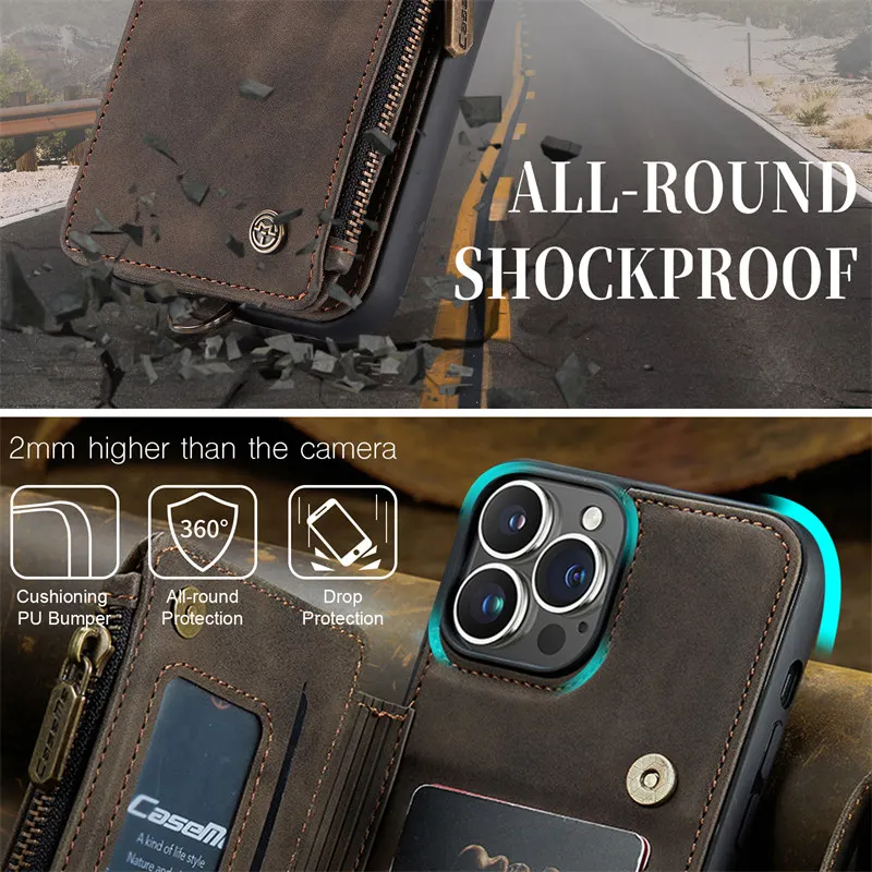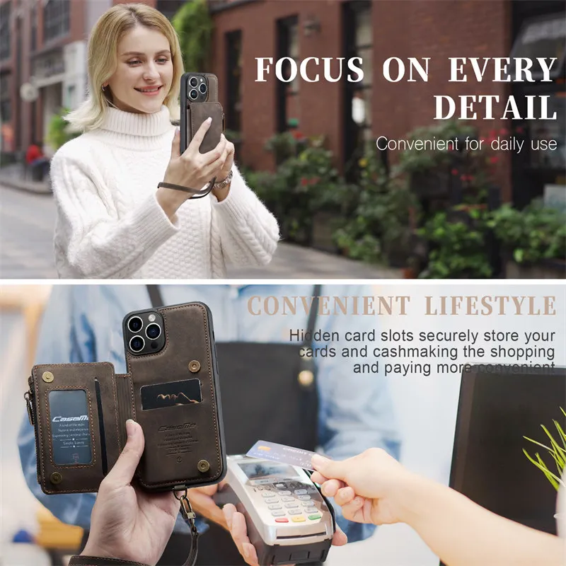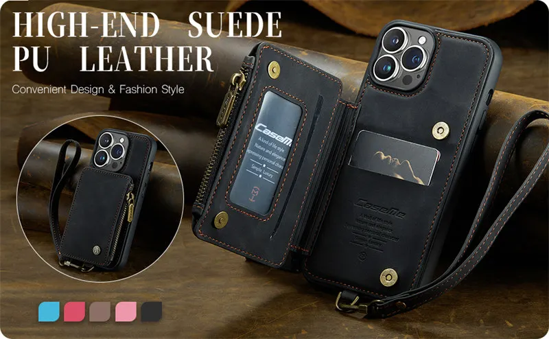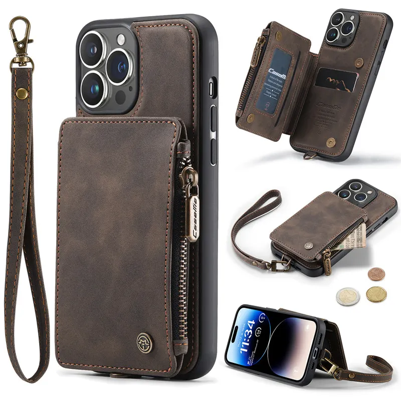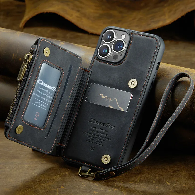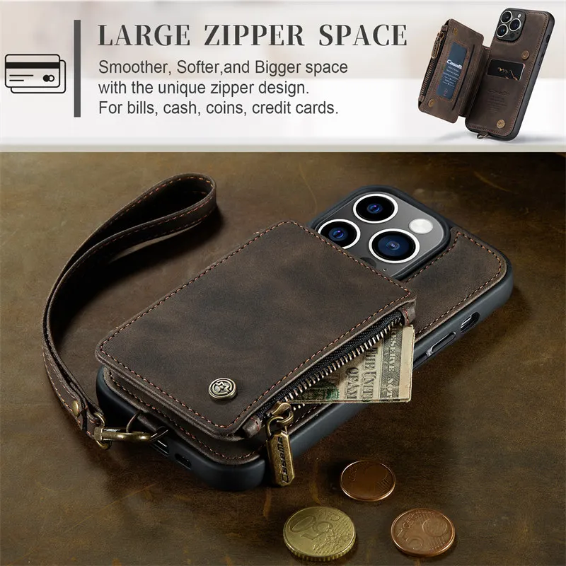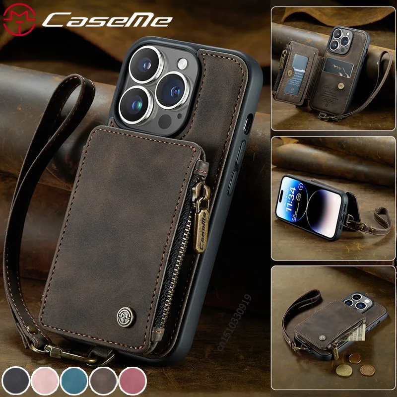 Comprar Funda de cuero PU con tapa para iPhone 14 Pro Max 13 12 11 XS XR X 7 8 Plus, cartera con cremallera, funda trasera para tarjeta para Samsung S23 S22 S21