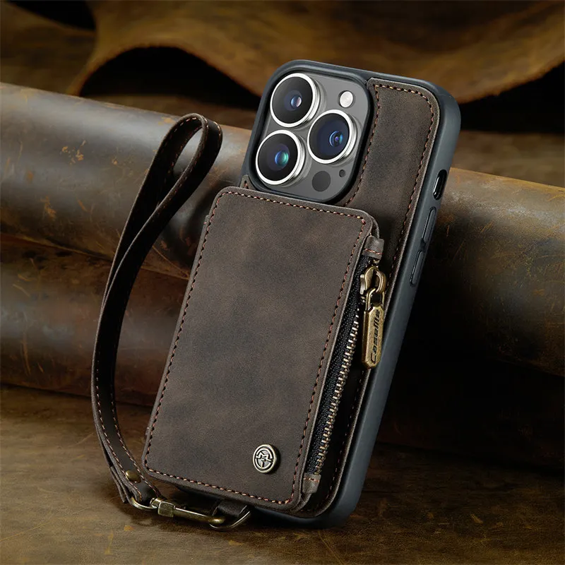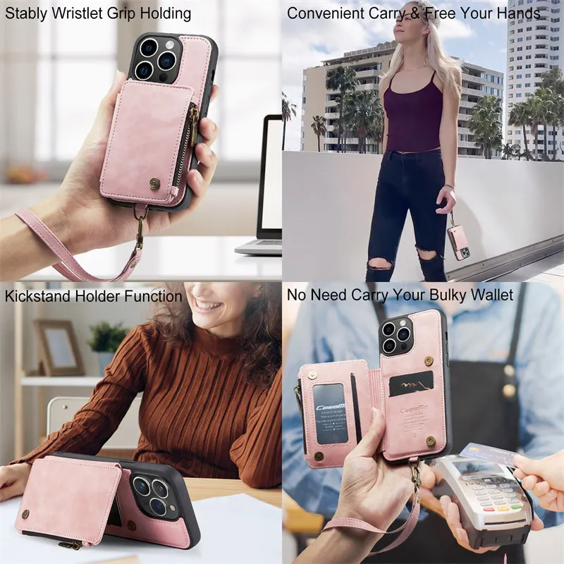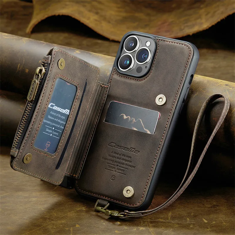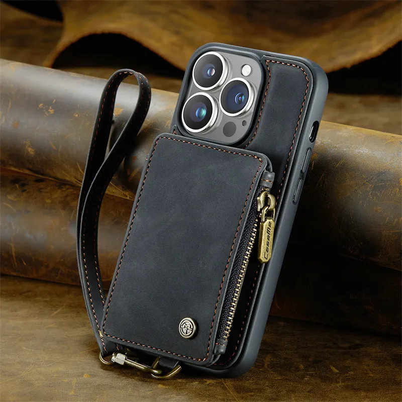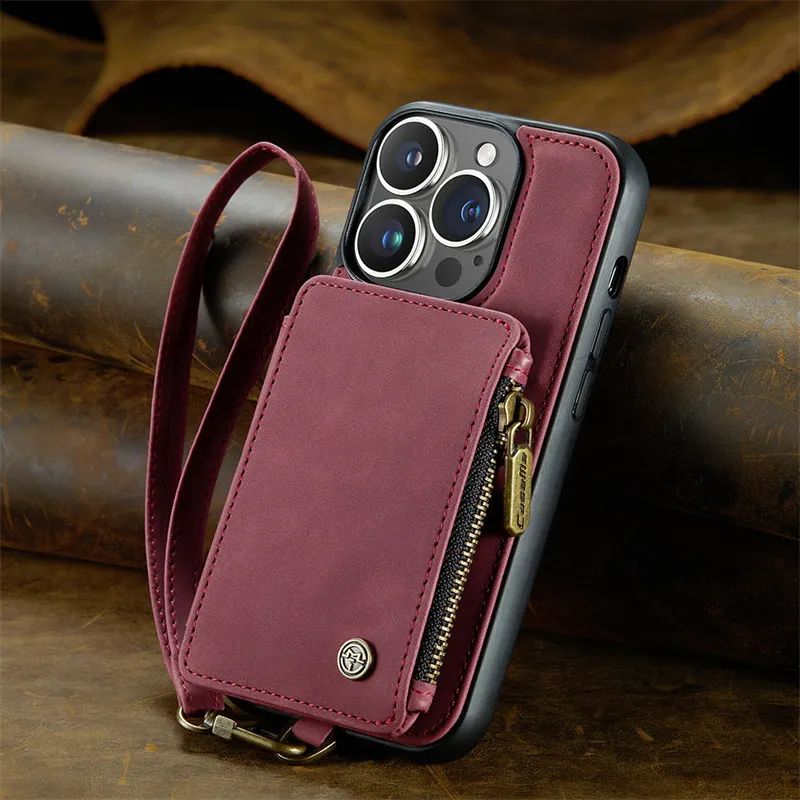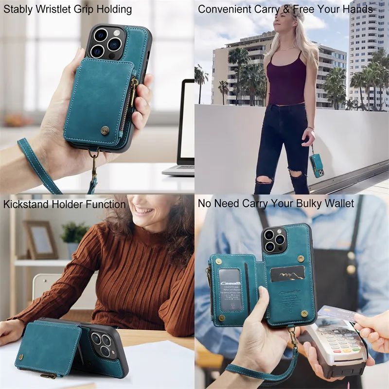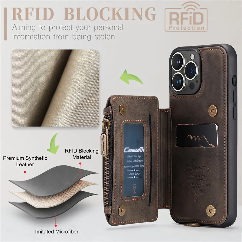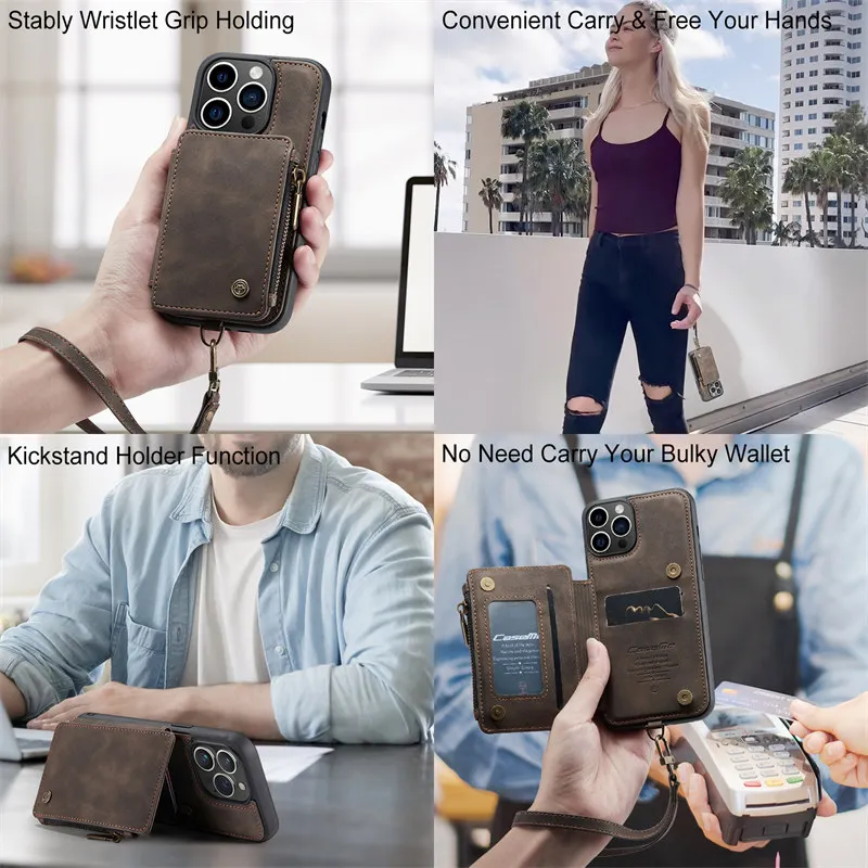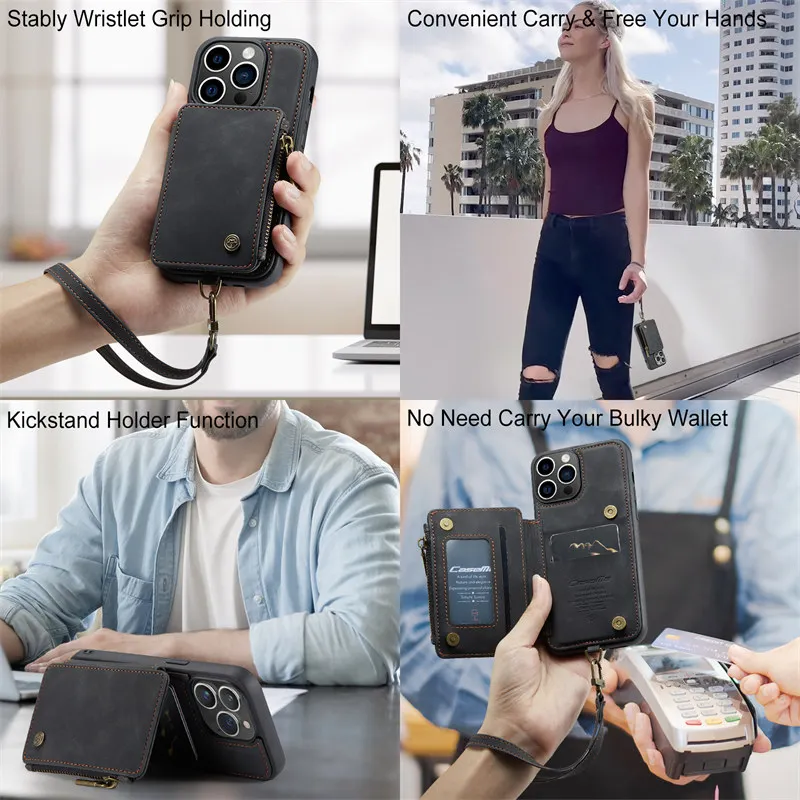 Comprar Funda de cuero PU con tapa para iPhone 14 Pro Max 13 12 11 XS XR X 7 8 Plus, cartera con cremallera, funda trasera para tarjeta para Samsung S23 S22 S21