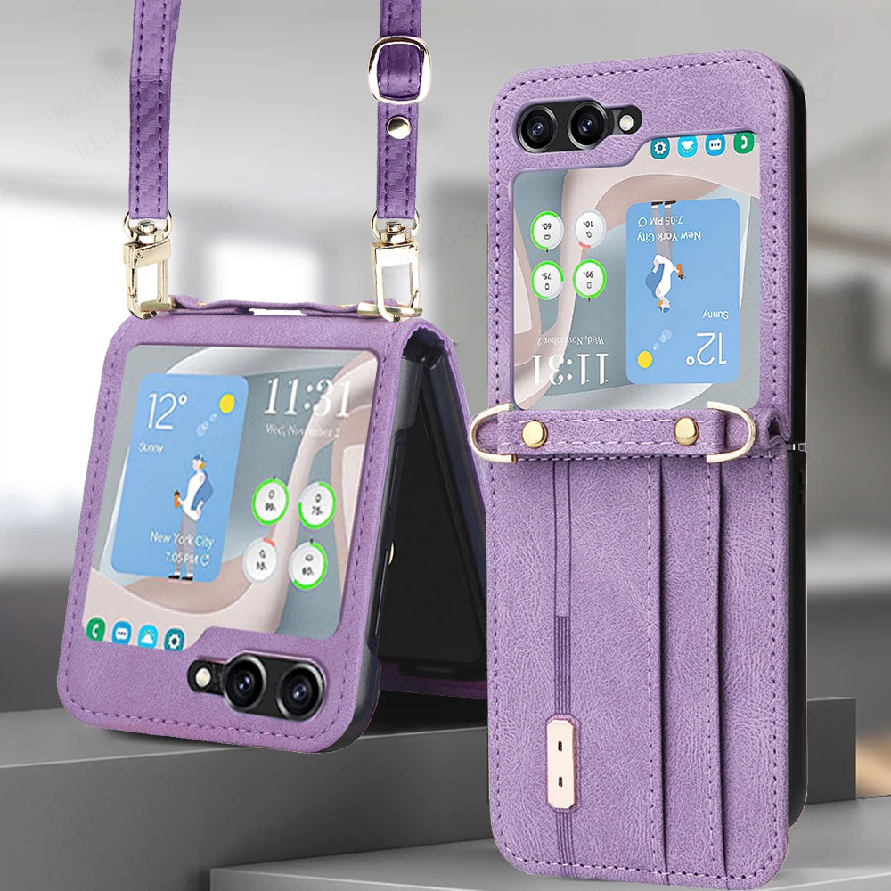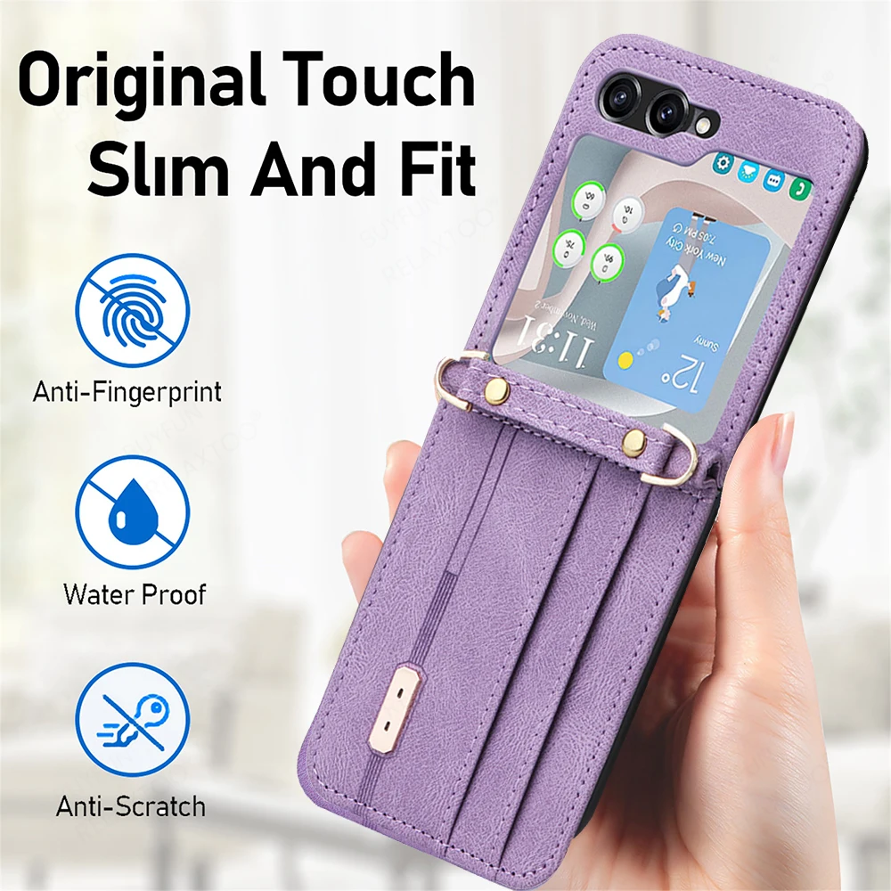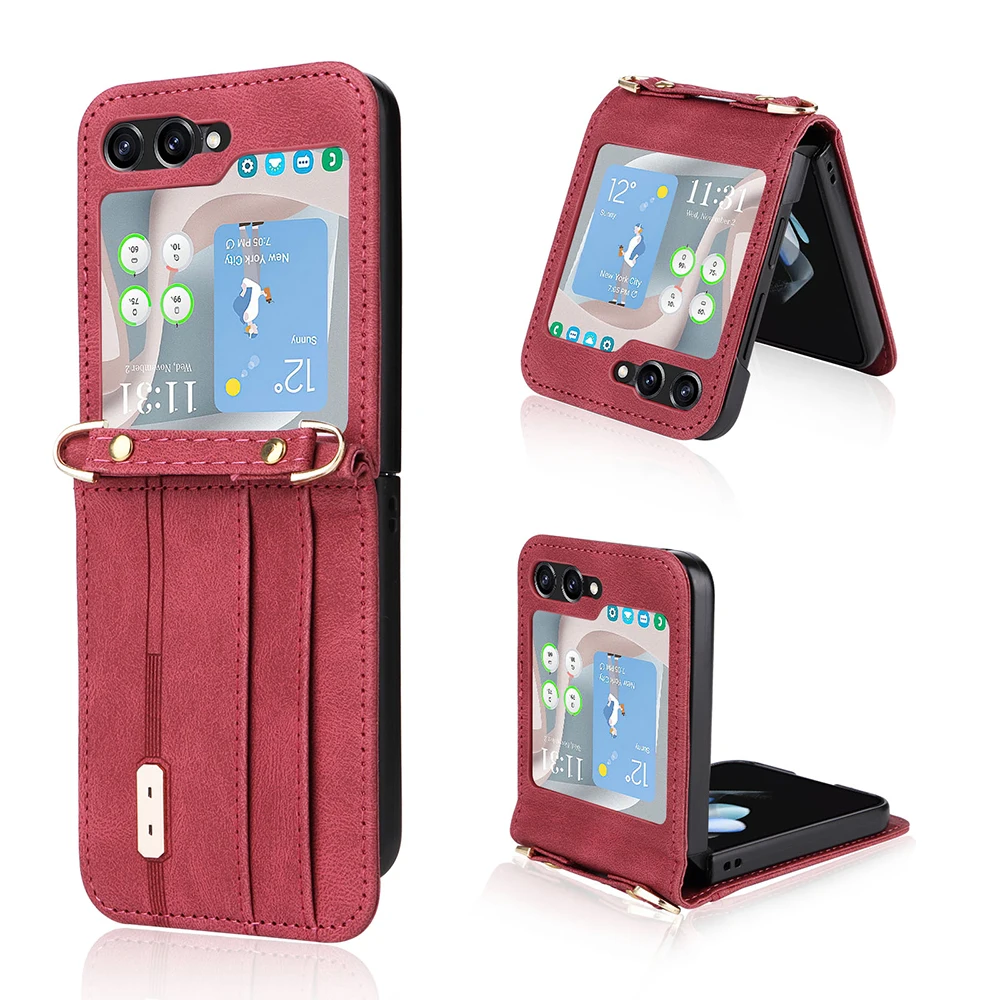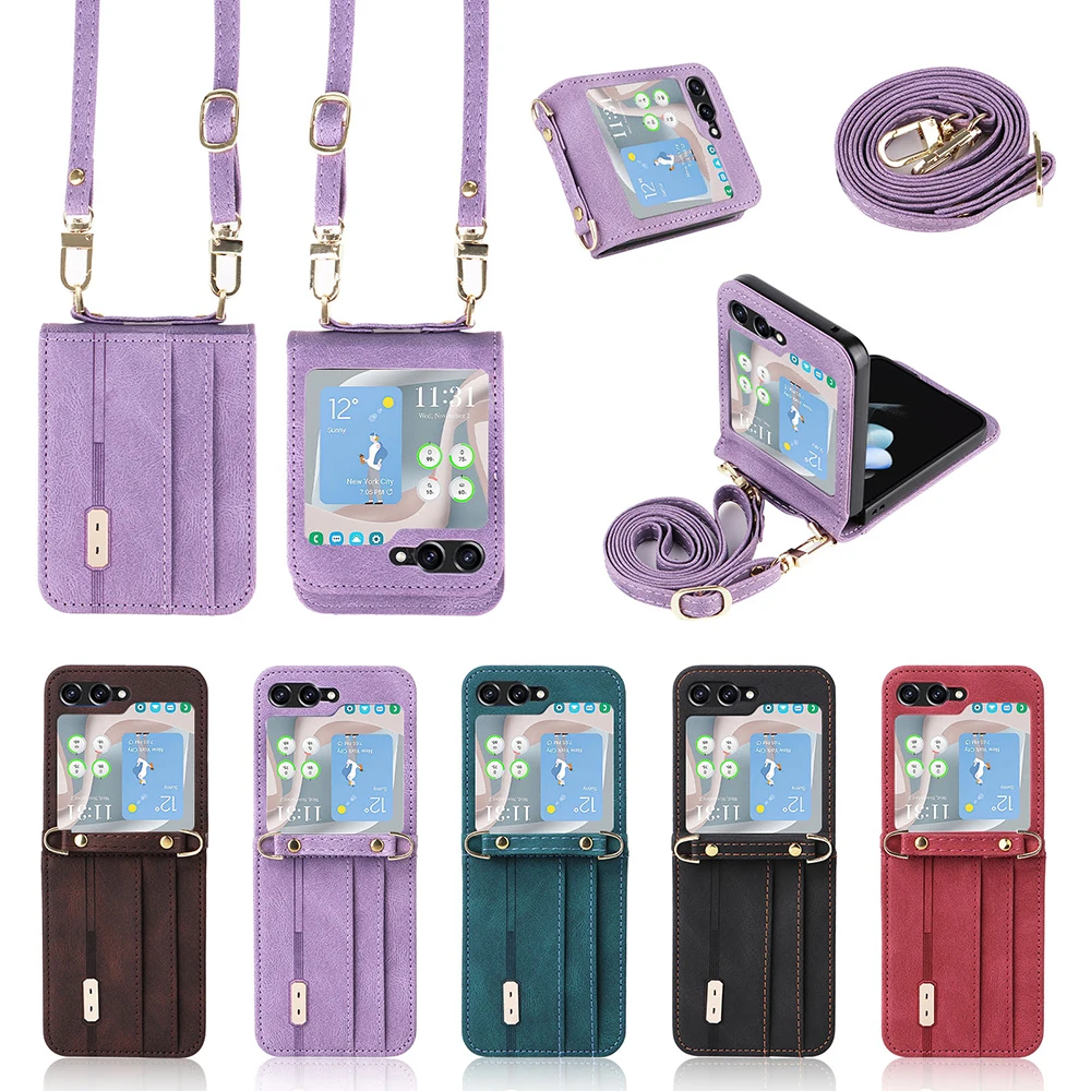 Comprar Funda de cuero con ranura para tarjeta para Samsung Galaxy Z Flip5, bolso cruzado para Samsung ZFlip5, ZFlip 5, 5G, 6,7 pulgadas, cordón