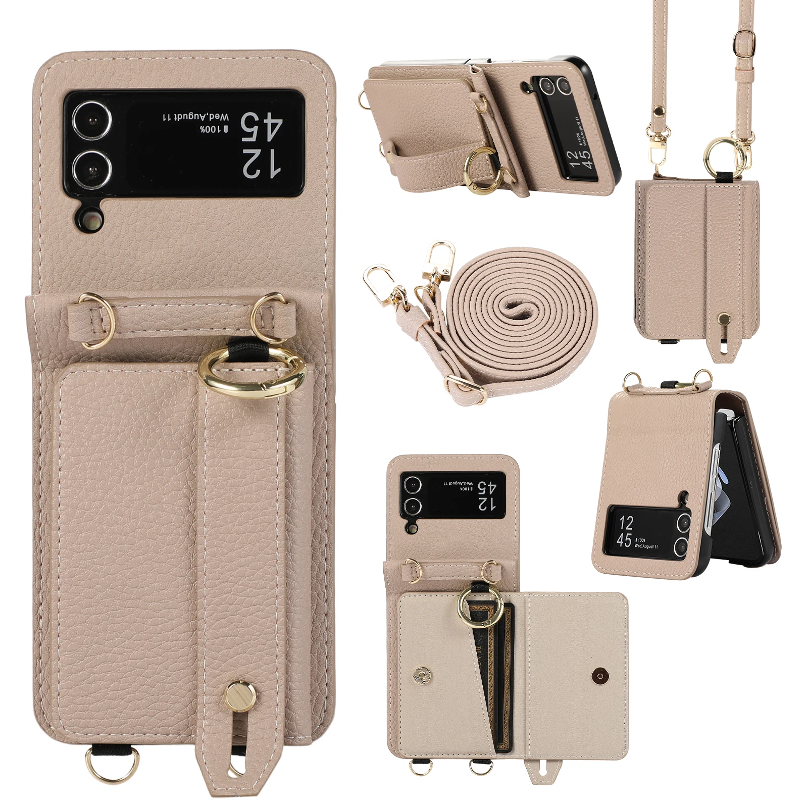 Bandolera pulsera tarjetas Solt cartera Funda de cuero para Samsung Galaxy Z Flip 5 4 3 5G cordón largo bolsa bolsillo anillo soporte cubierta