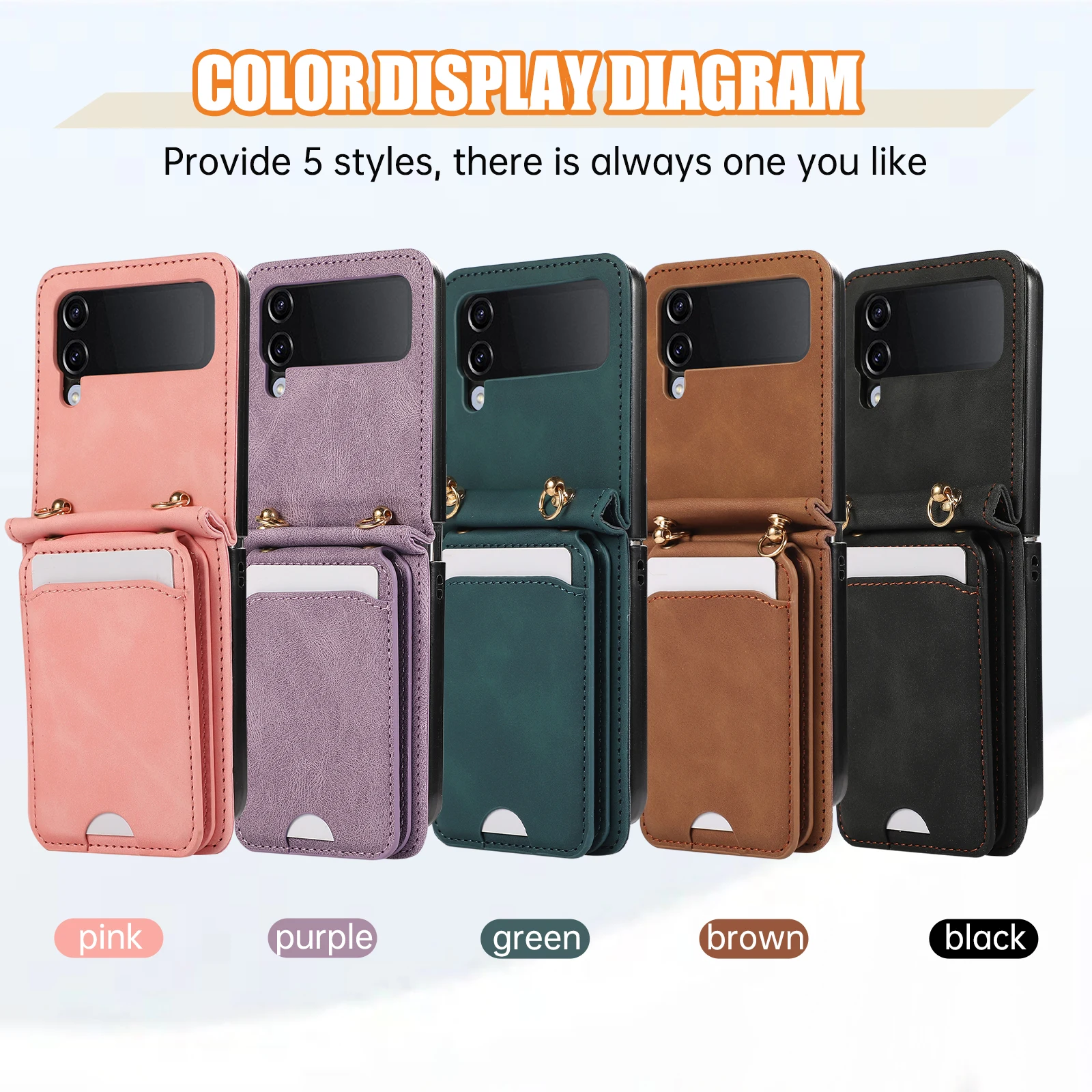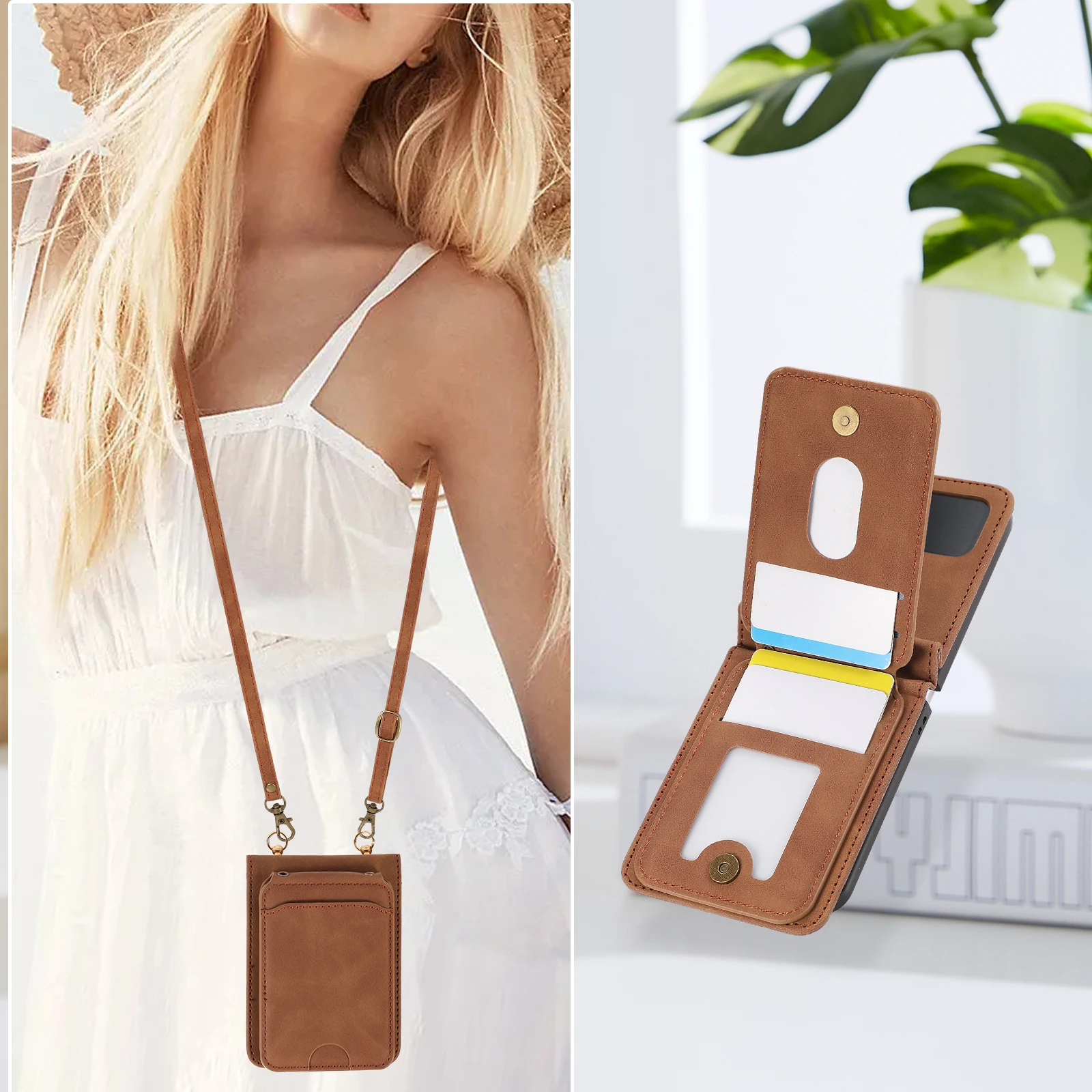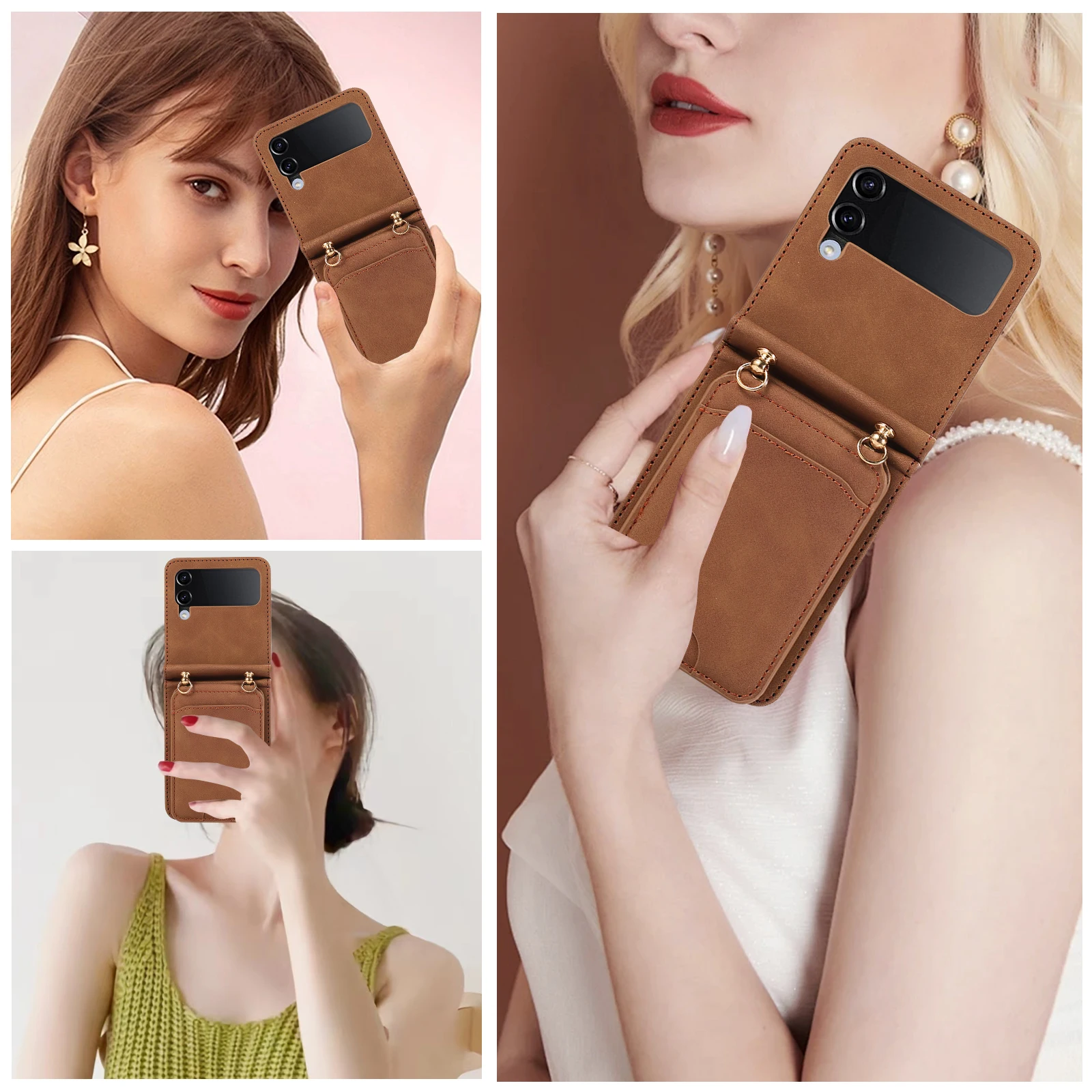 Comprar Funda de cuero para Samsung Galaxy Z Flip 6 5 4 3 5G Flip6 Flip5, funda larga con cordón para tarjetas verticales