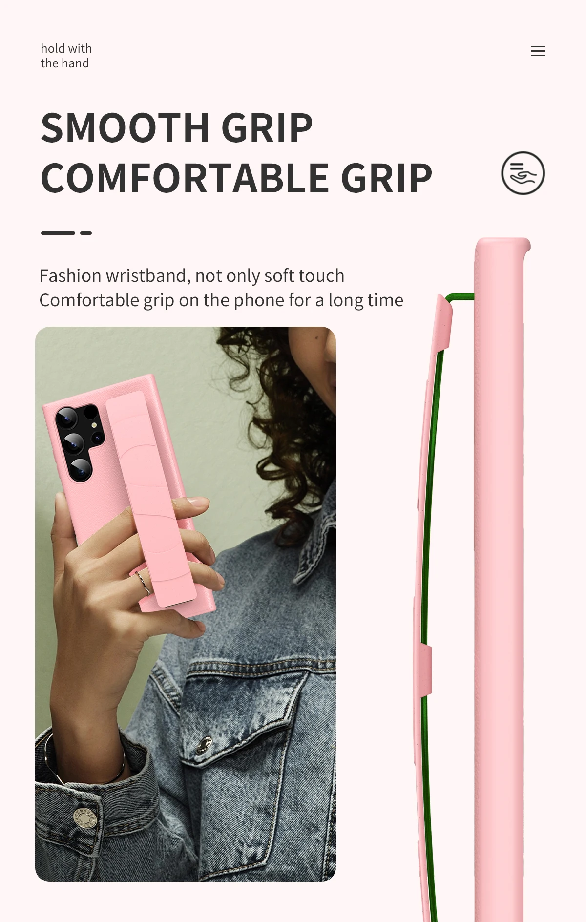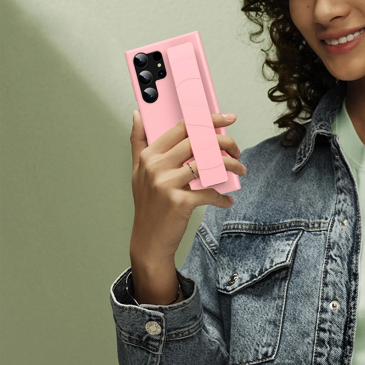Funda de cuero con soporte de pulsera para Samsung S22 Plus S23 Ultra, funda con correa para la muñeca, agarre, sensación de piel, cubierta Lisa a prueba de golpes