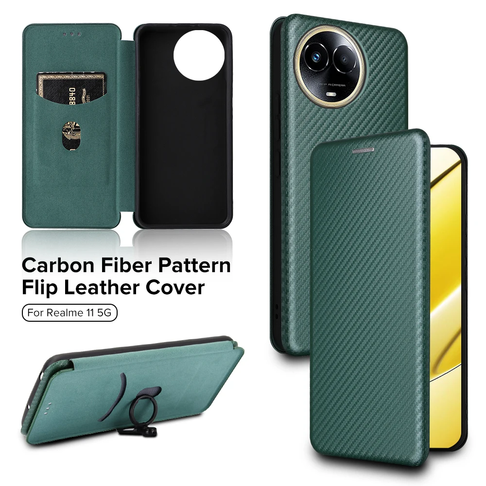 Para 11 5G versión Global funda de fibra de carbono textura Flip Funda de cuero Realme11 Pro Plus 11 Pro + ranura para tarjeta soporte de anillo Capa