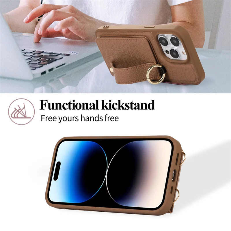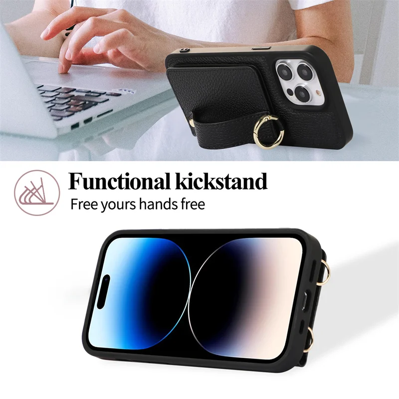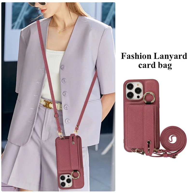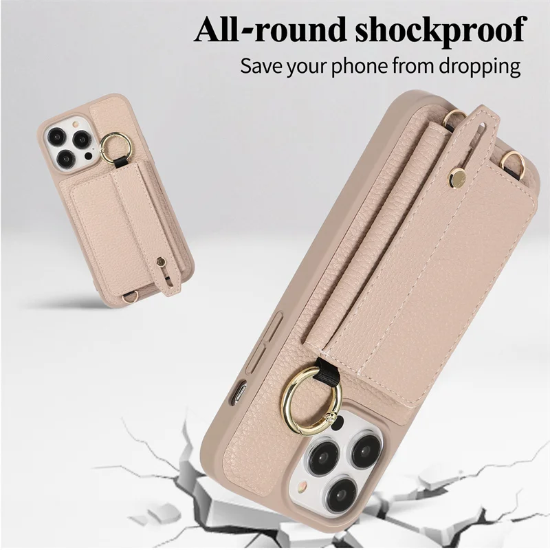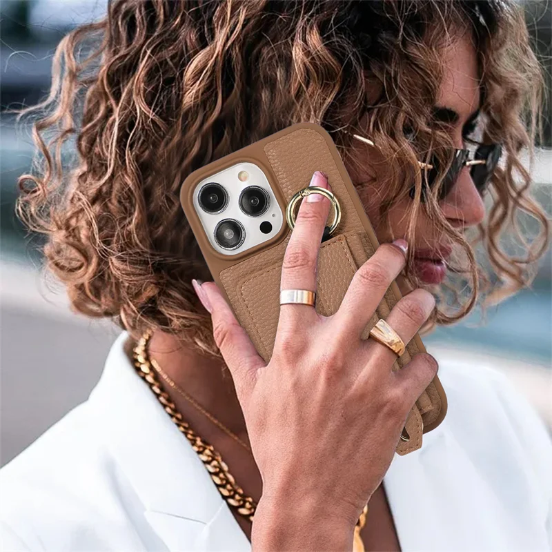 Funda de cuero con textura de lichi y cordón largo para iPhone 15, 14 Plus, 15, 13, 12, 11 Pro Max, funda trasera con soporte para correa para la muñeca