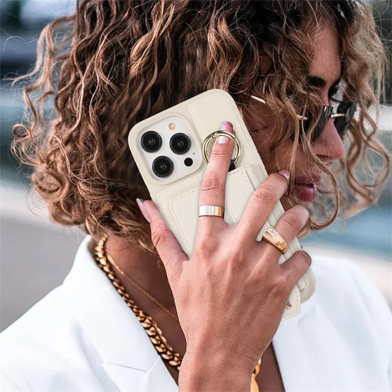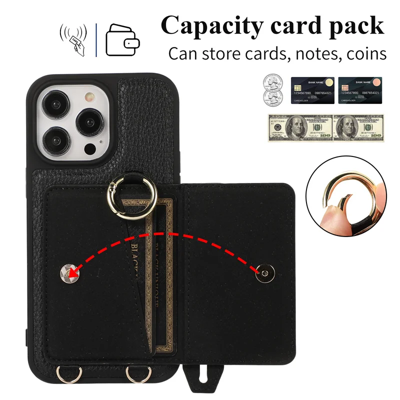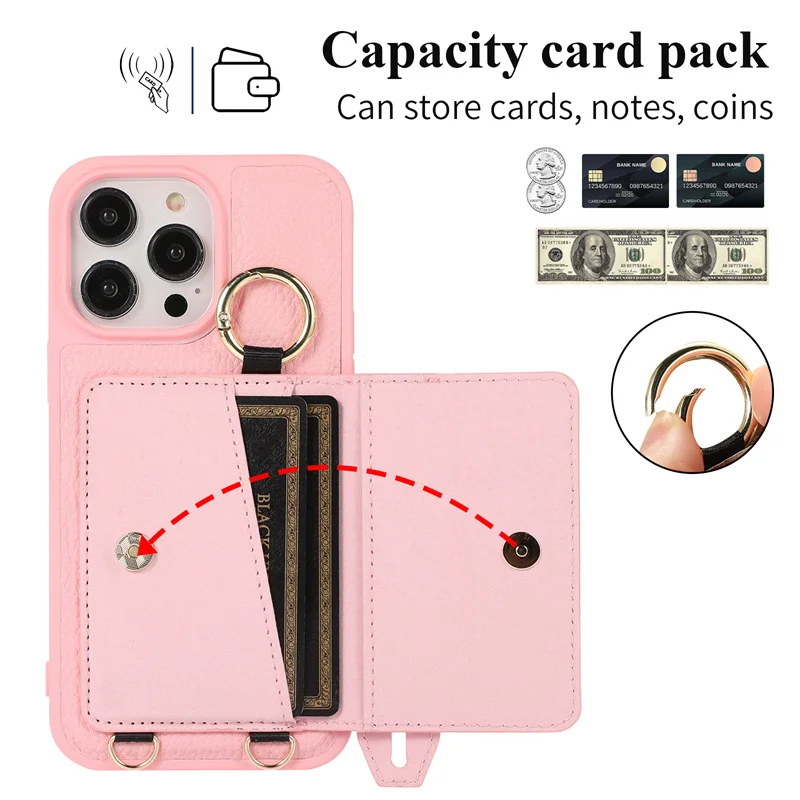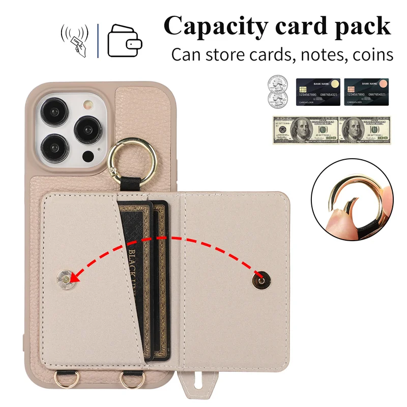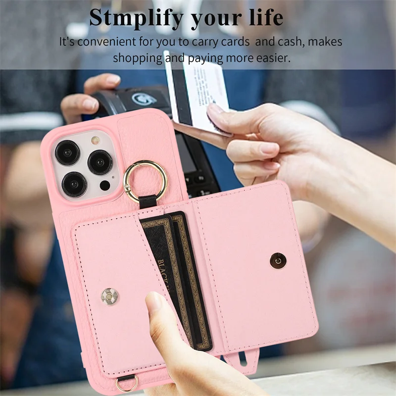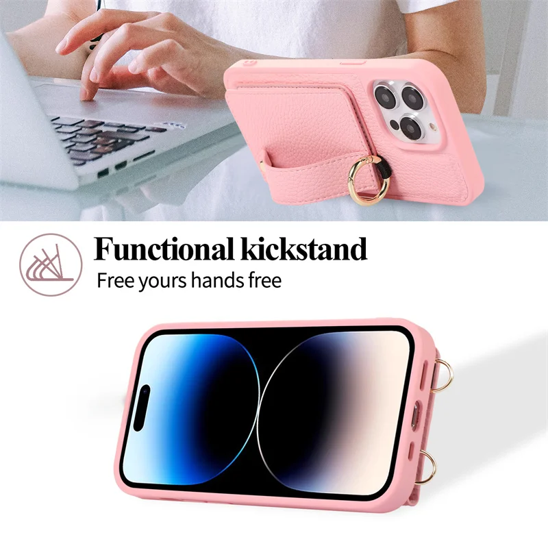 Funda de cuero con textura de lichi y cordón largo para iPhone 15, 14 Plus, 15, 13, 12, 11 Pro Max, funda trasera con soporte para correa para la muñeca