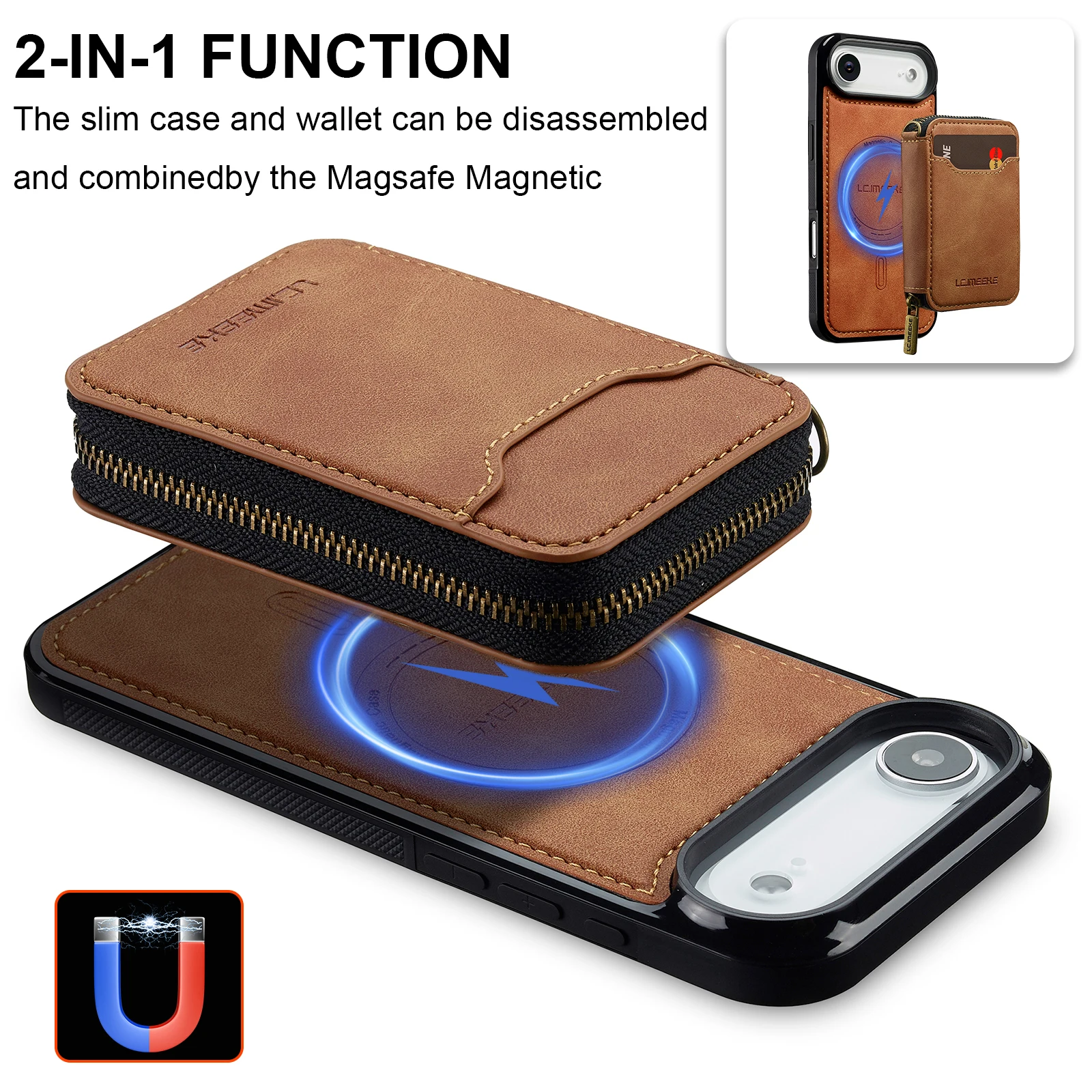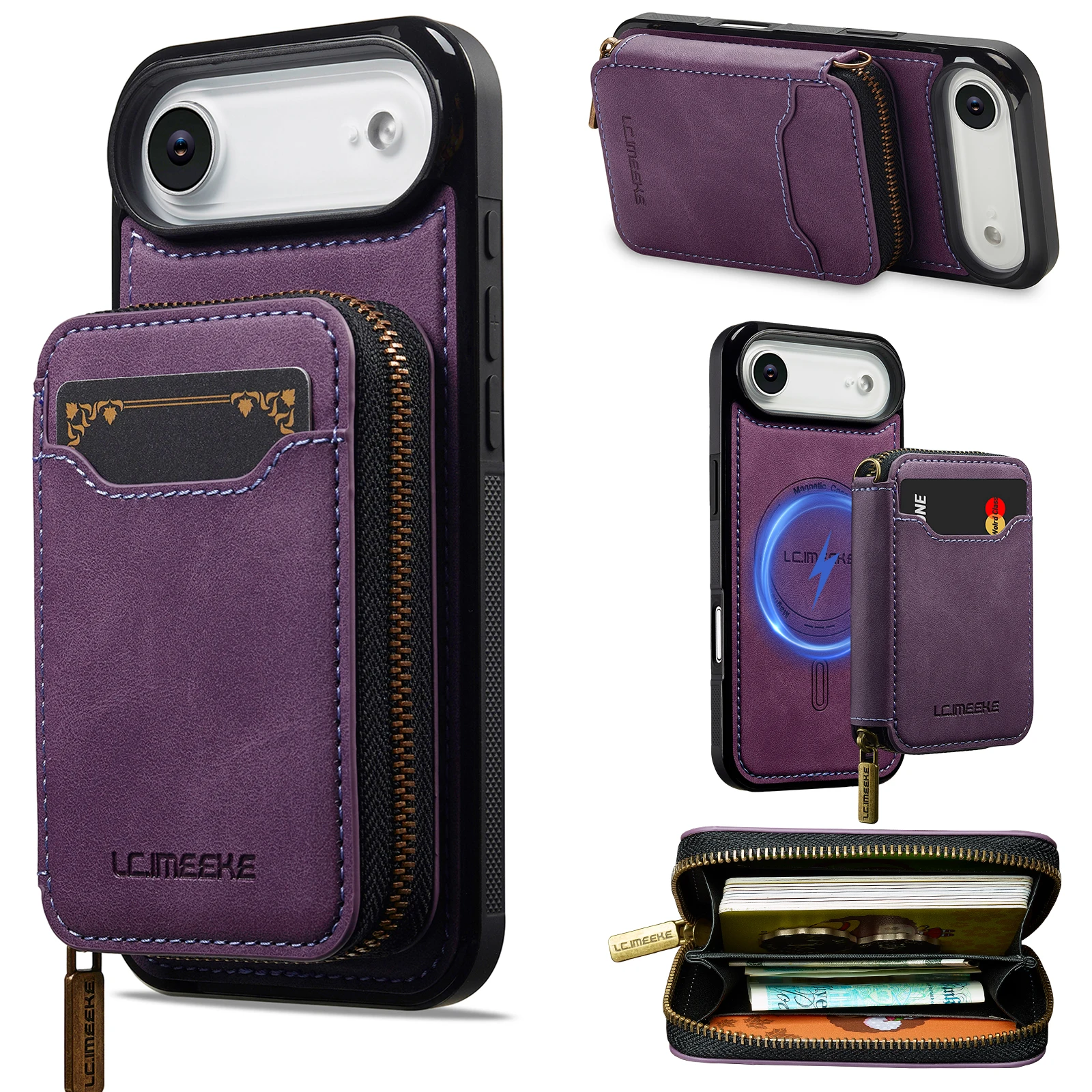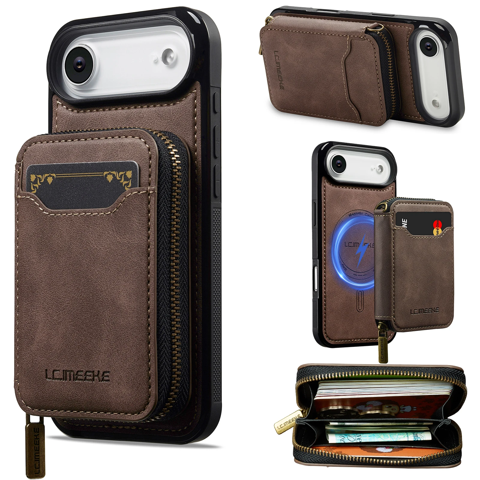 Funda de cuero tipo billetera con cremallera magnética desmontable 2 en 1 para iPhone 17 Pro Max 16 Plus 15 14 13 12 para funda de bolsa Magsafe