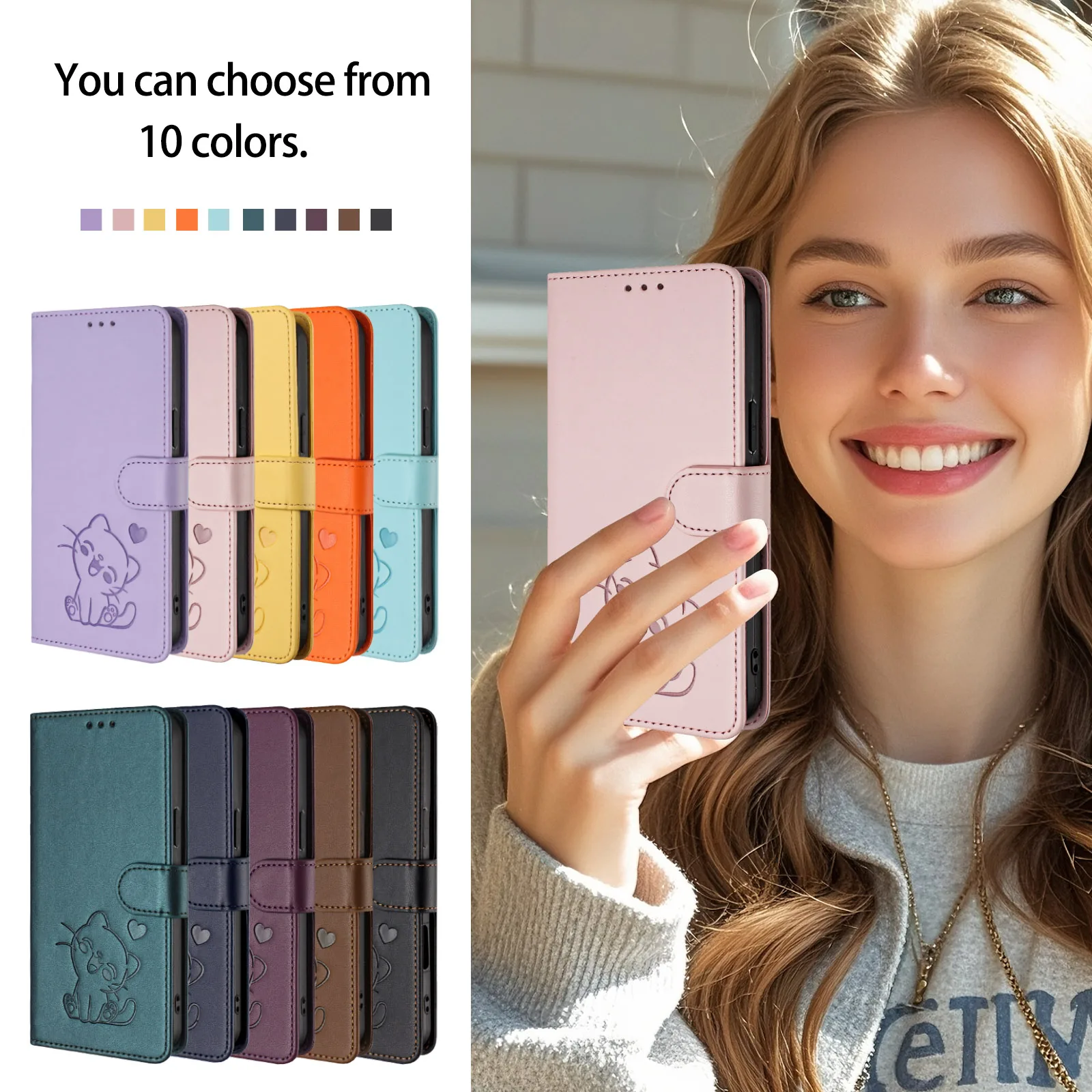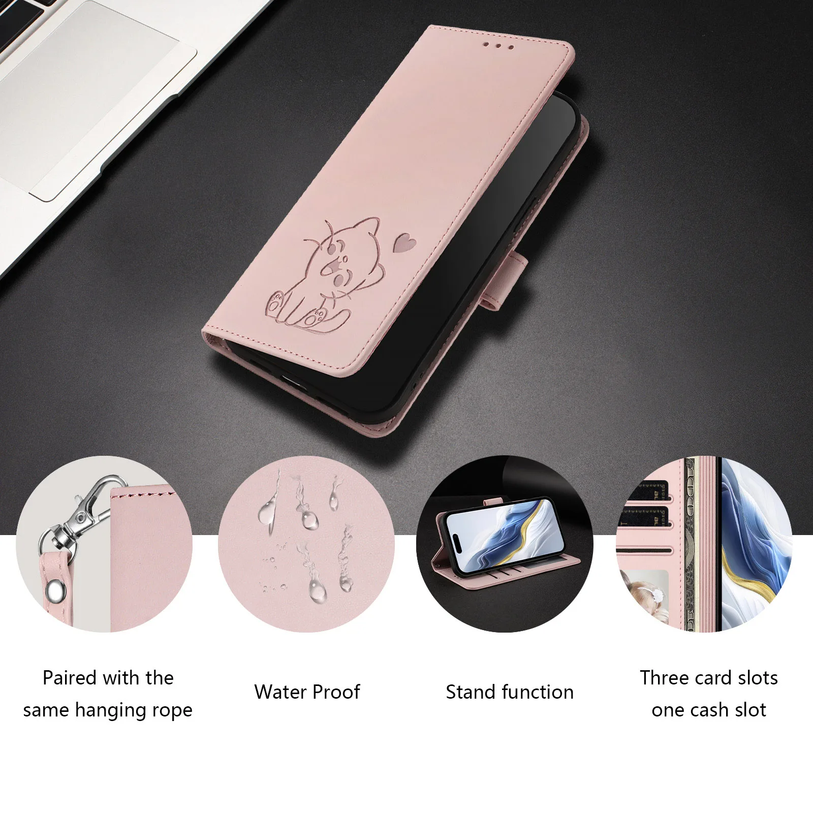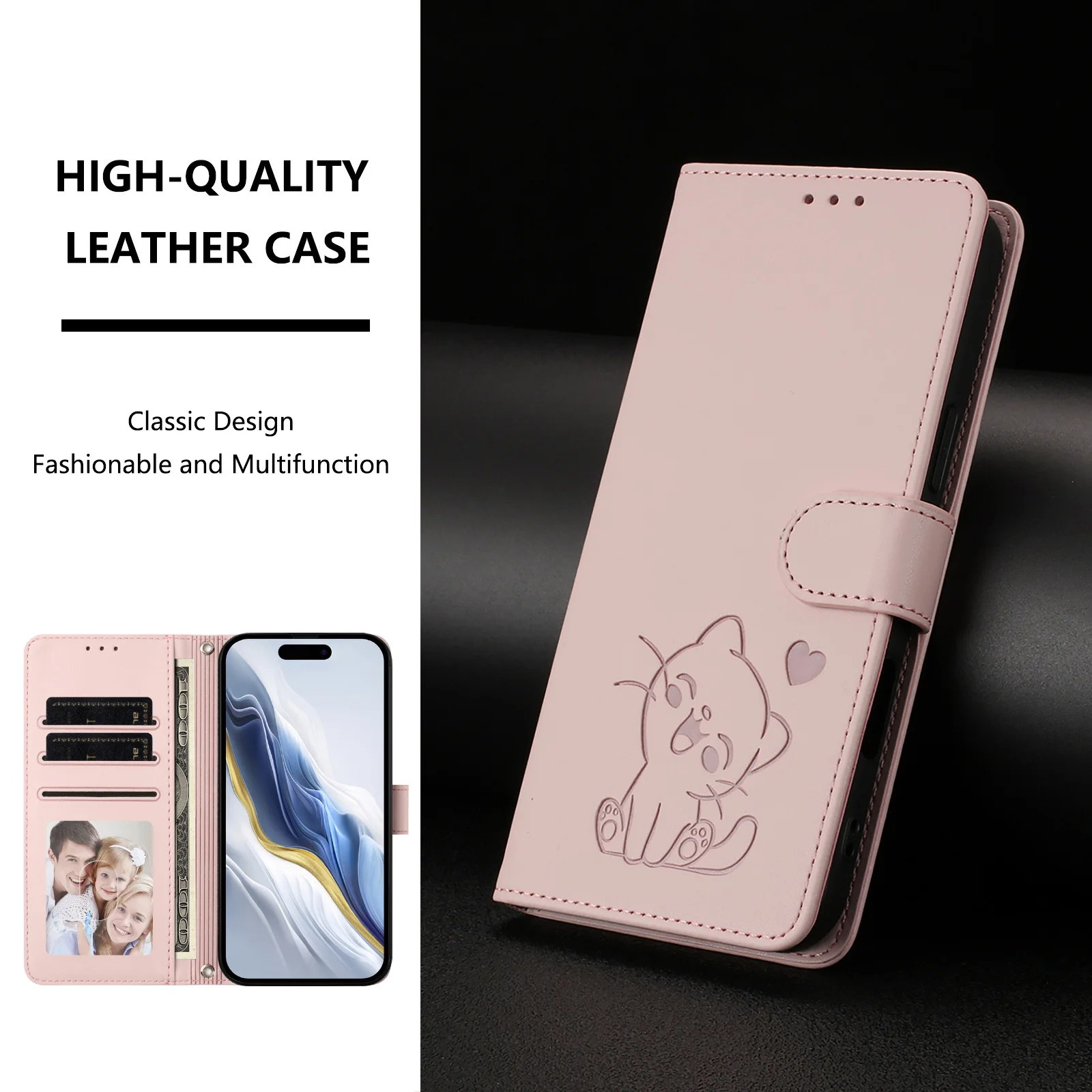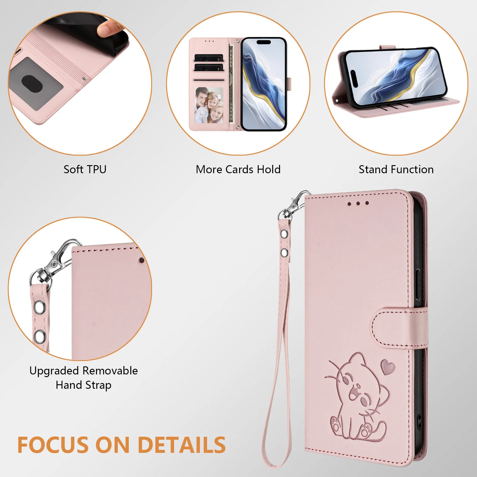 Funda de cuero tipo billetera Solt con tarjetas de gato lindas en relieve para iPhone 17 Pro Max 16 Plus 16E 15 14 13 12 11, funda con correa para bolso