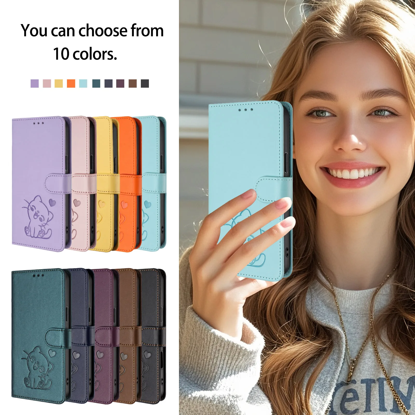 Funda de cuero tipo billetera Solt con tarjetas de gato bonito en relieve para iPhone 17 Pro Max 16 Plus 16E 15 14 13 12 11 funda de libro con correa y soporte