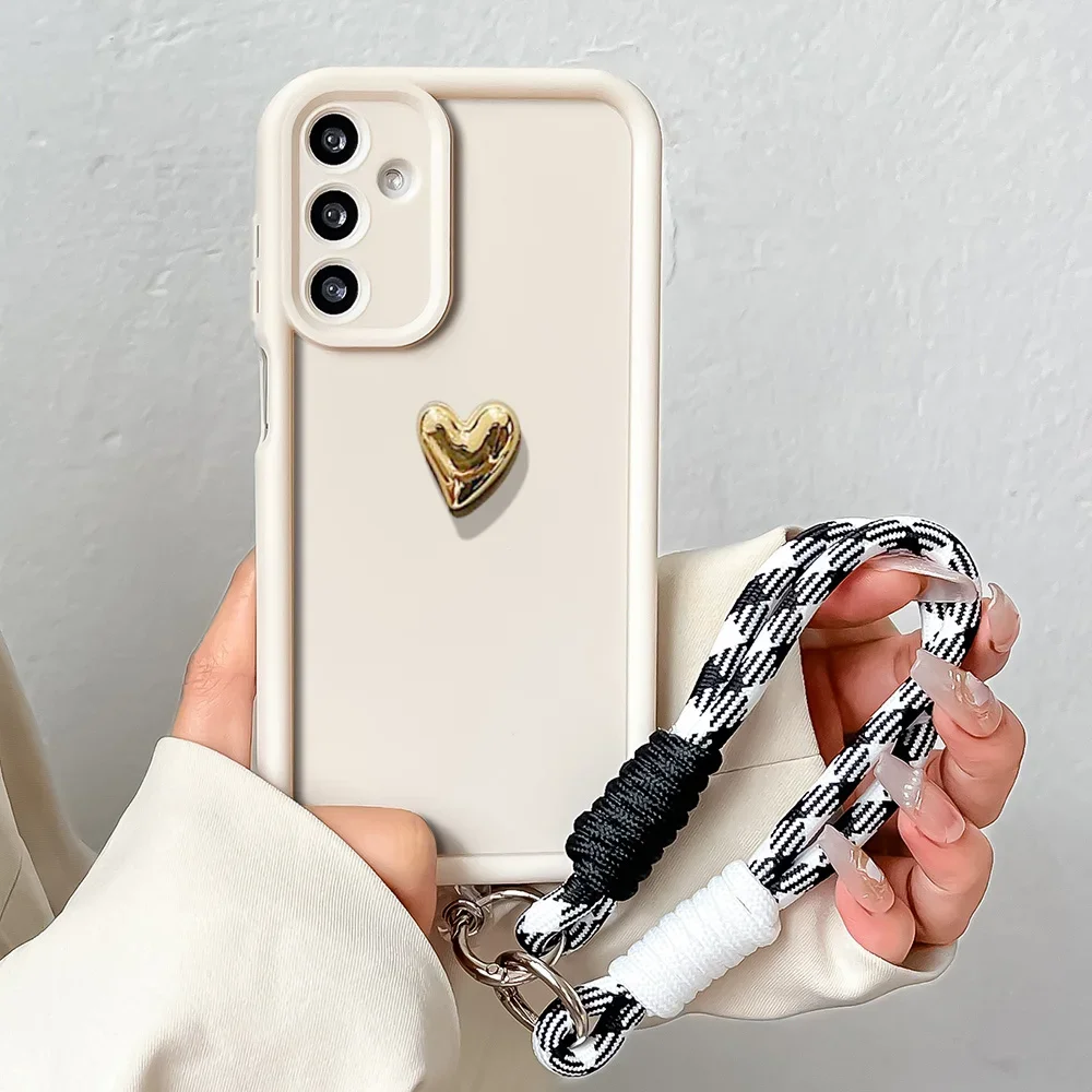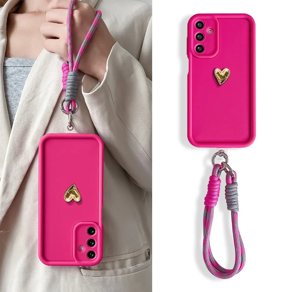 Funda dorada con cordón de muñeca y corazón de amor para Samsung Galaxy M55 M54 M34 M33 M15 M14 M12 M13 M22 M32 4G 5G funda de silicona