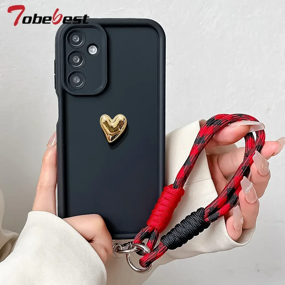 Funda dorada con cordón de muñeca y corazón de amor para Samsung Galaxy M55 M54 M34 M33 M15 M14 M12 M13 M22 M32 4G 5G funda de silicona