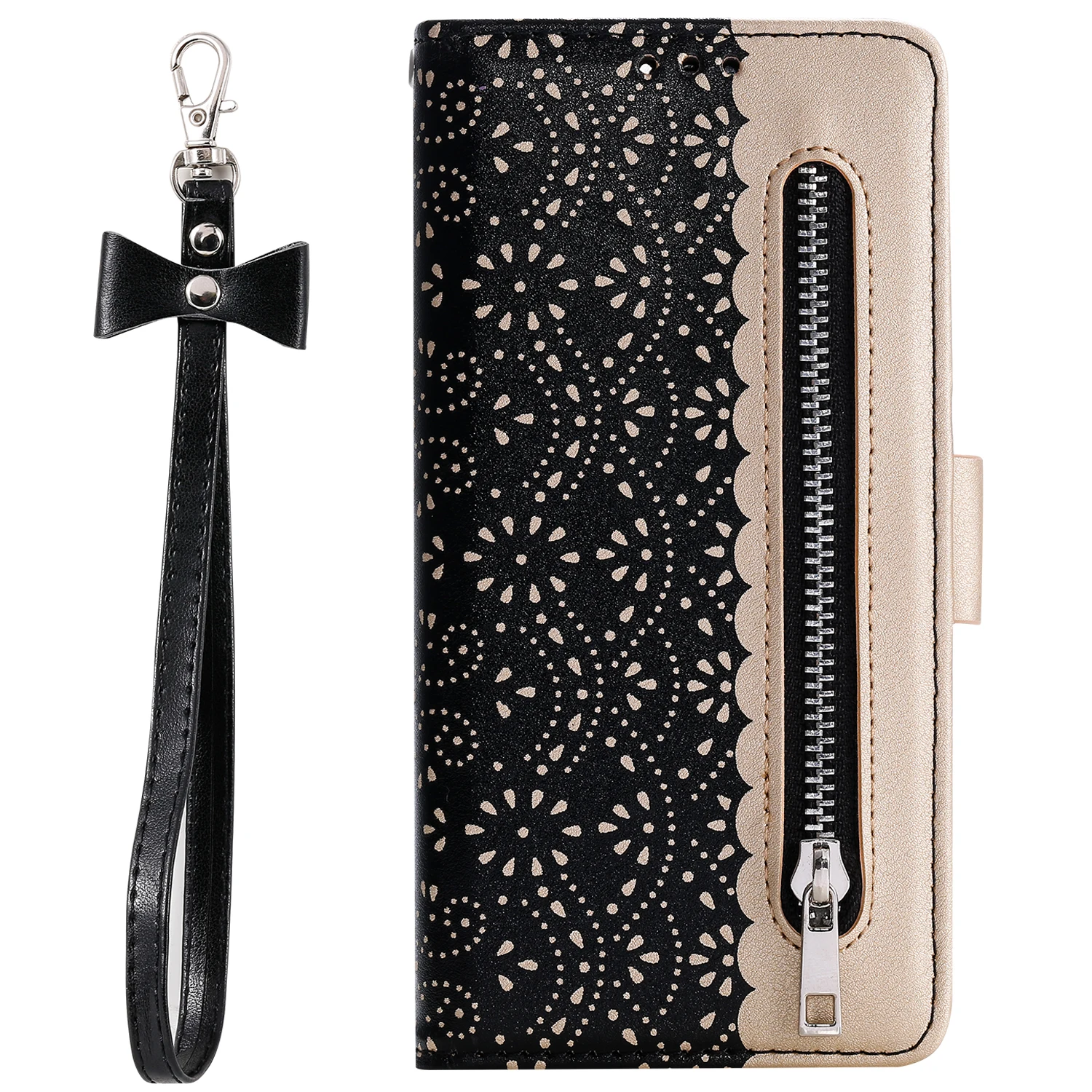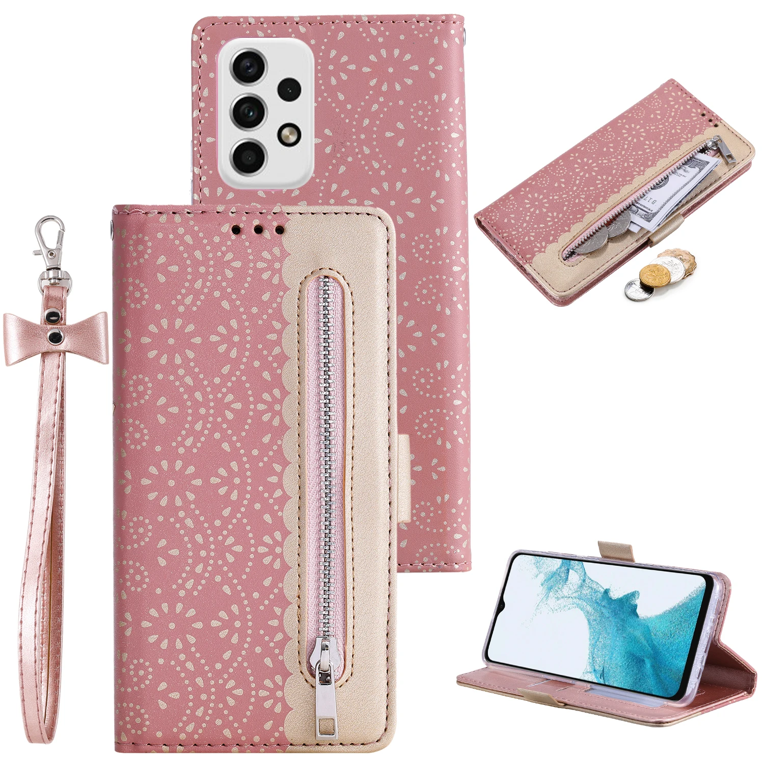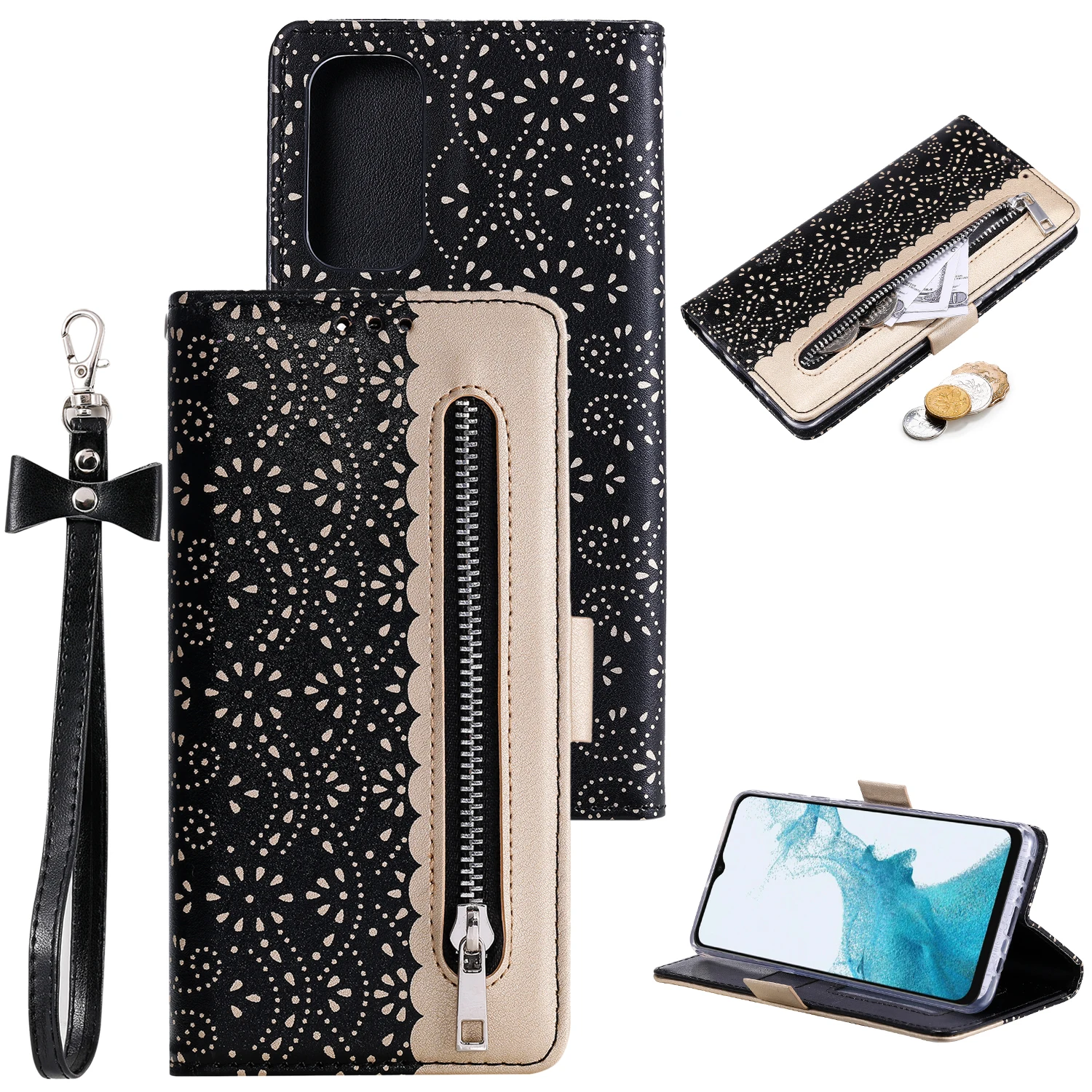 Comprar Funda de encaje tipo billetera de cuero con cremallera para Samsung A23 S23 Ultra S22 Plus S21 FE A54 A14 A34 tarjetero funda con soporte magnético Fundas