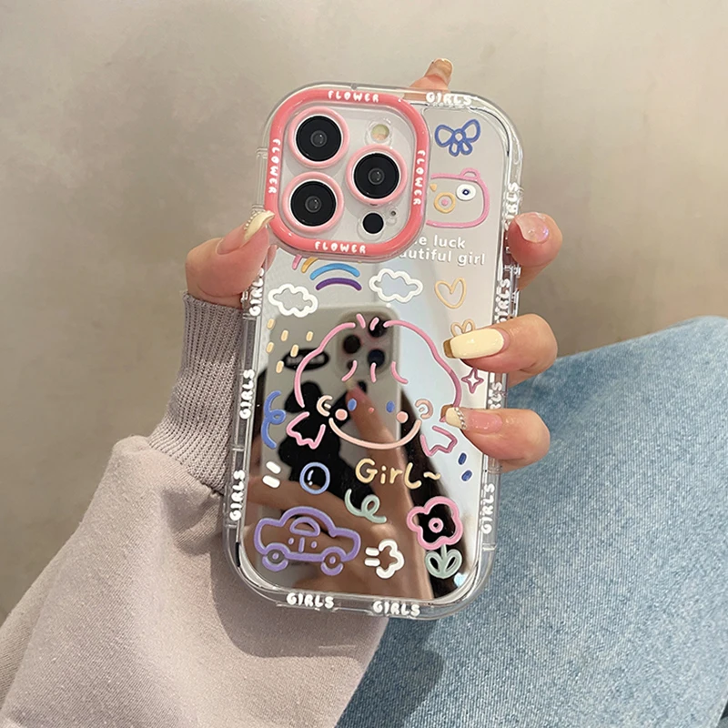 Comprar Funda de espejo chapada con dibujos animados para iPhone, carcasa trasera dura de parachoques suave, linda chica de la suerte, para iPhone 14, 13 Pro Max, 11, 12