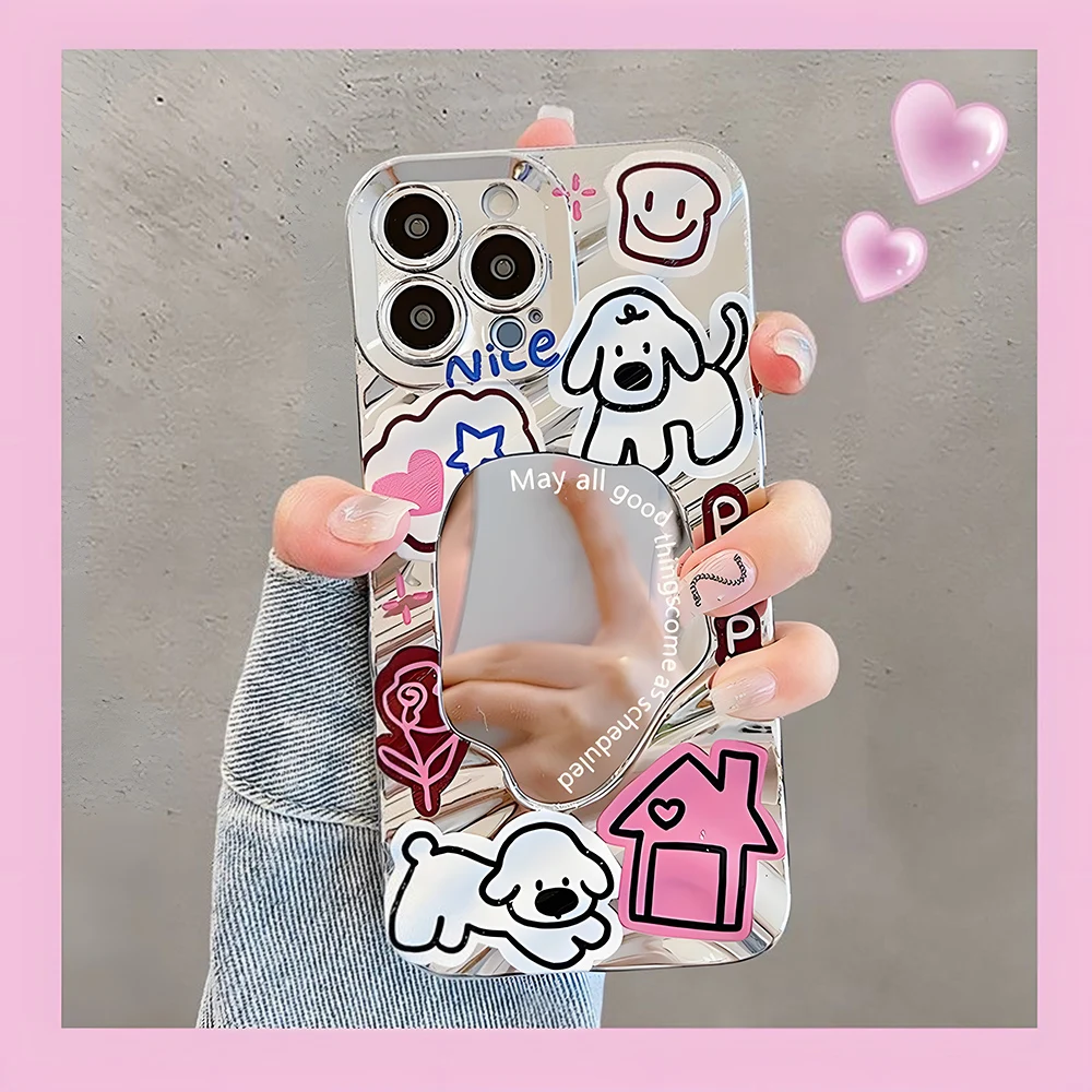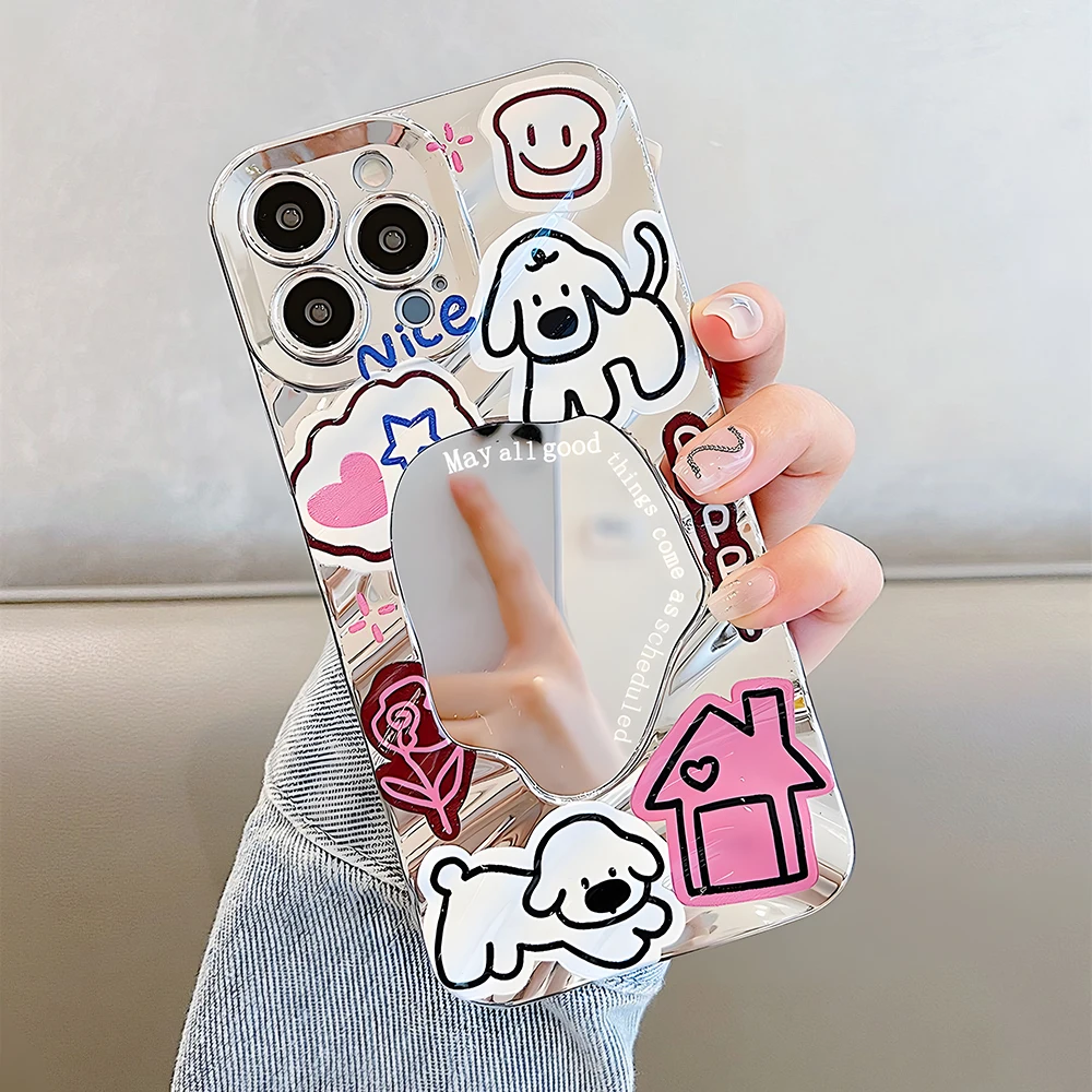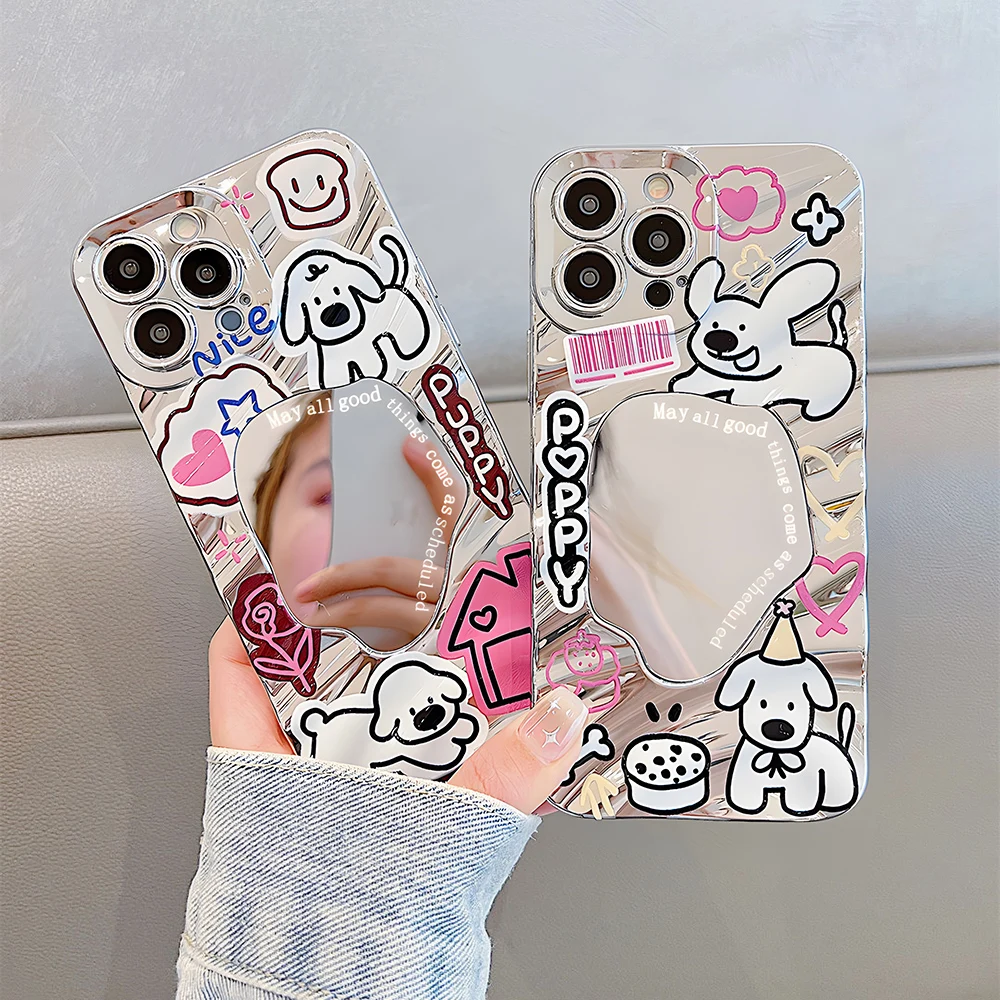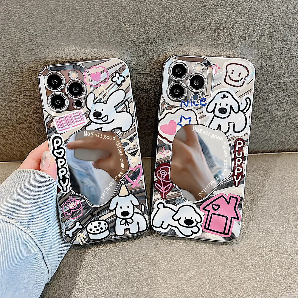 Funda con espejo con patrón de onda de perro y cachorro de dibujos animados para iPhone 16 15 14 13 12 11 Pro Max, parachoques duro, cubierta con revestimiento elegante 16Promax
