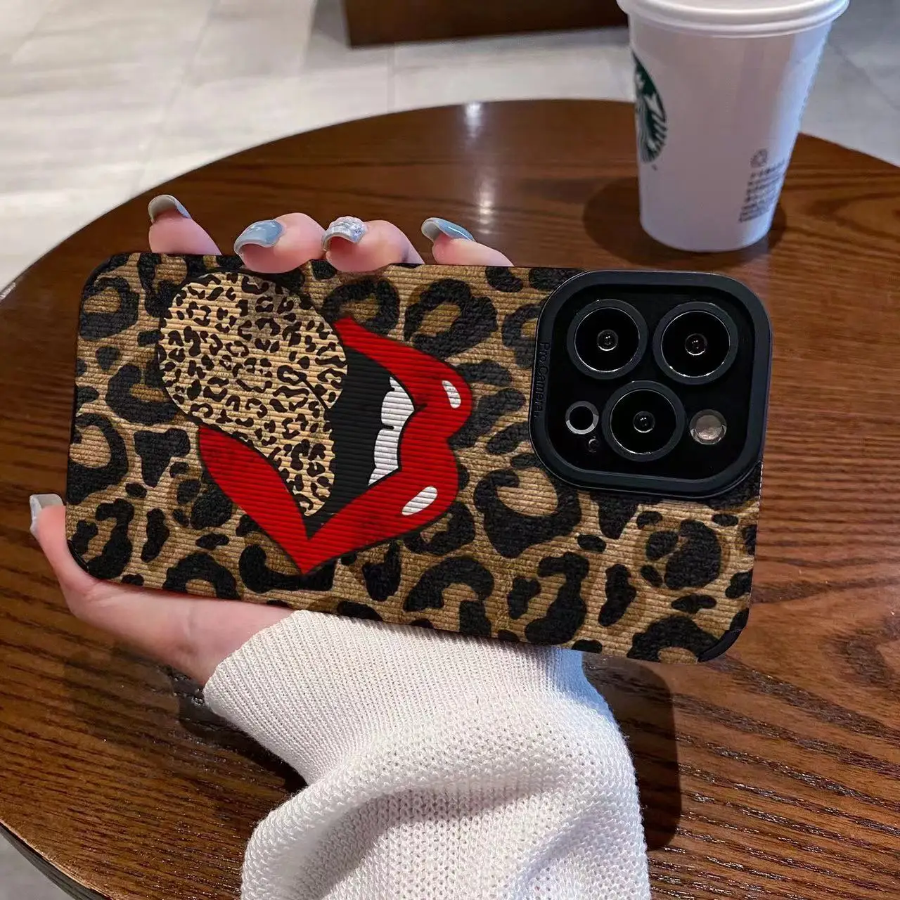 Funda con estampado de leopardo y labios rojos a la moda para iPhone 15 Pro Max 11 12 14 13 Mini 7 8 Plus X XS XR, funda de silicona con lengua grande para mujer