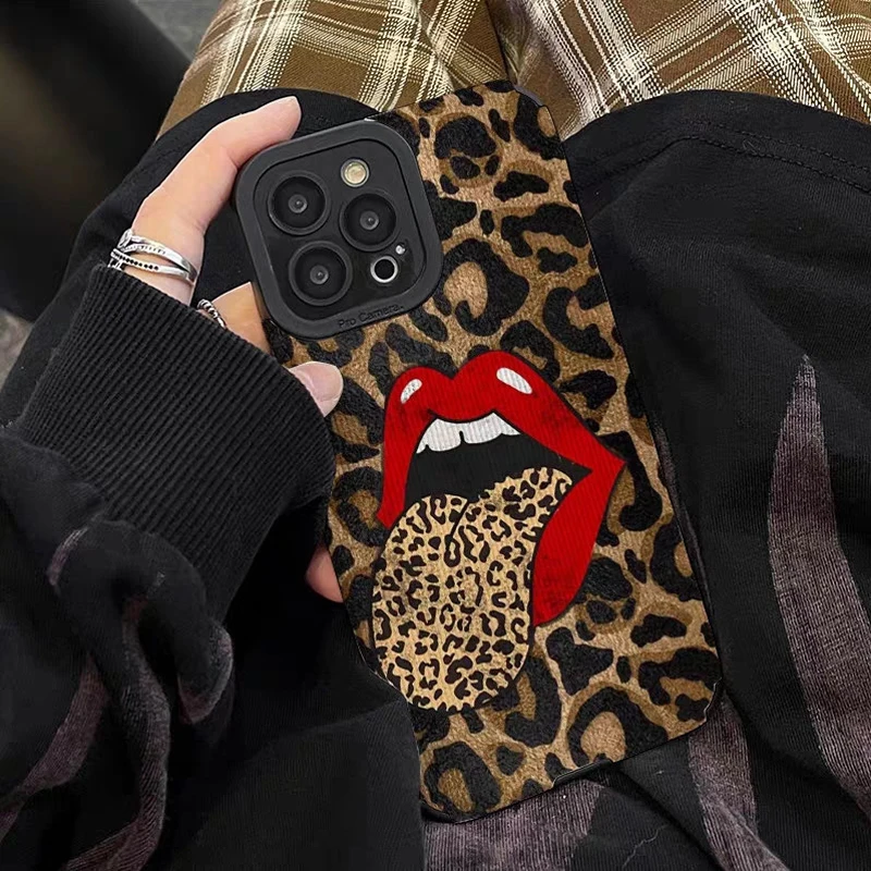 Funda con estampado de leopardo y labios rojos a la moda para iPhone 15 Pro Max 11 12 14 13 Mini 7 8 Plus X XS XR, funda de silicona con lengua grande para mujer