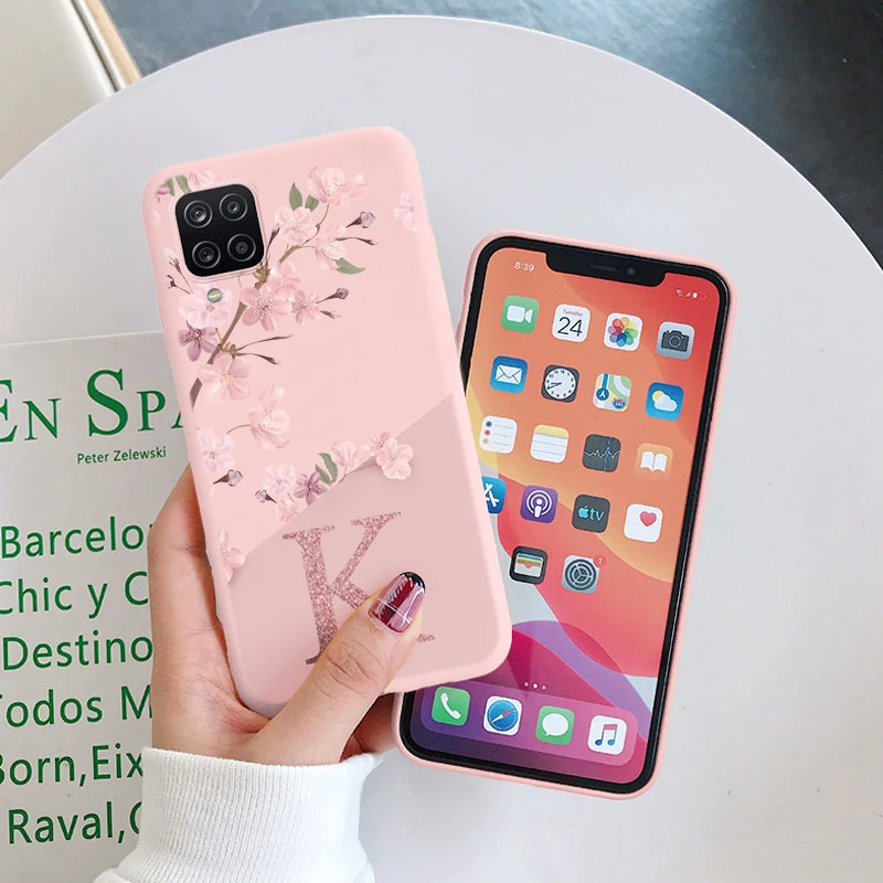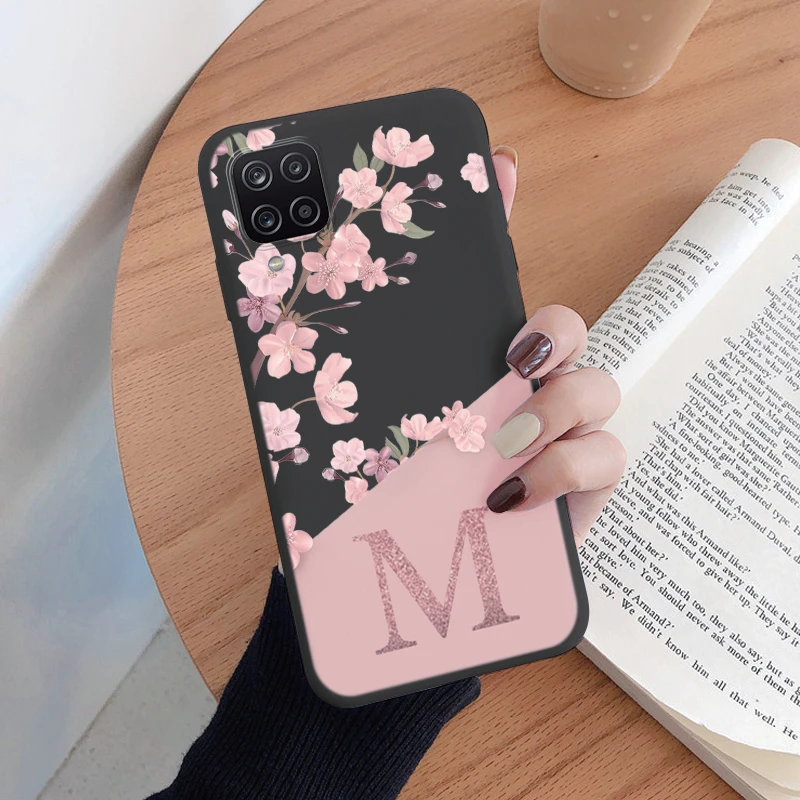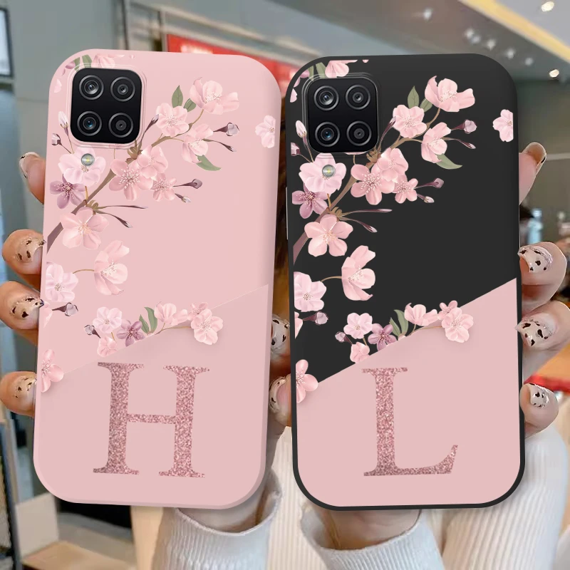 Funda de flor rosa para Samsung Galaxy A12 5G M12 F12, funda de teléfono de silicona suave con letras iniciales, Coque de moda para Samsung A 12
