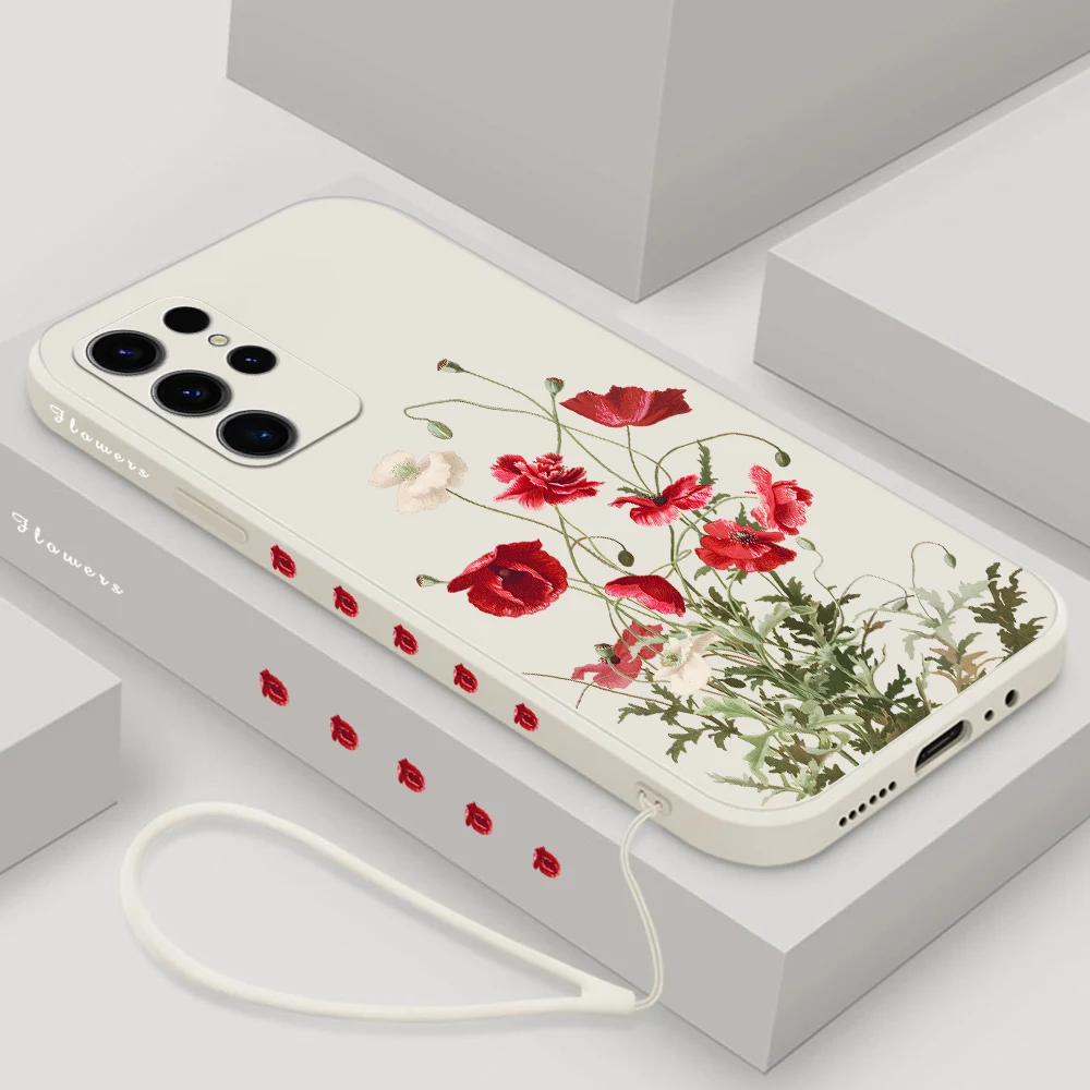 Funda de flores Retro Para Samsung Galaxy S23 S22 S21 S24 Ultra S24 Plus S20 S23 S21 FE 5G, funda de silicona líquida con cordón