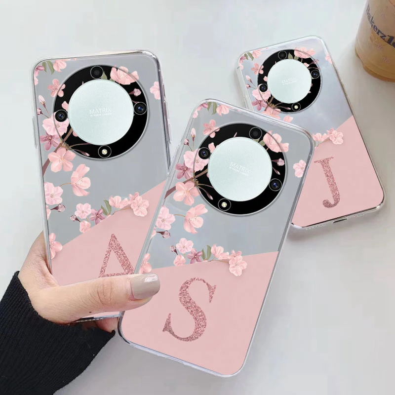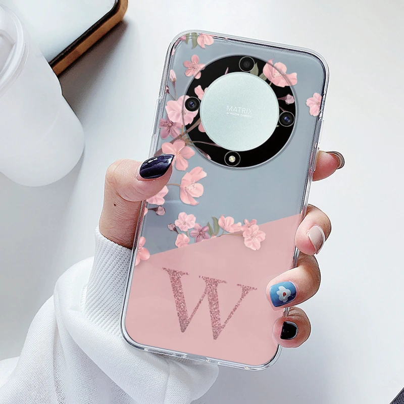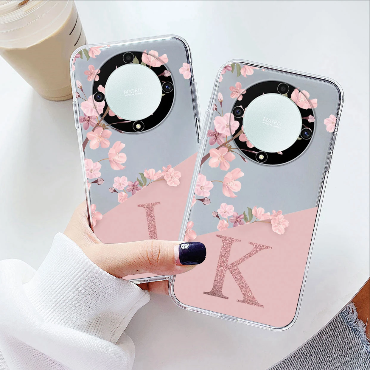 Funda de flores rosas a la moda para Honor X9A Magic5 Lite 5G, funda trasera con letras iniciales, Fundas transparentes de TPU suave para HonorX9A