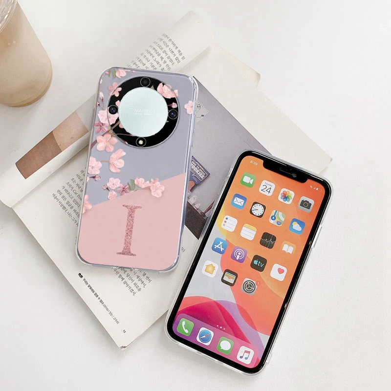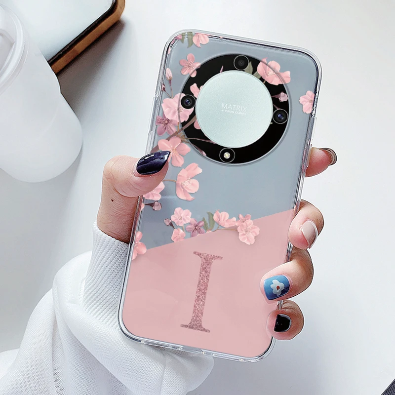 Comprar Funda de flores rosas a la moda para Honor X9A Magic5 Lite 5G, funda trasera con letra inicial, Fundas transparentes suaves de TPU para HonorX9A Coque
