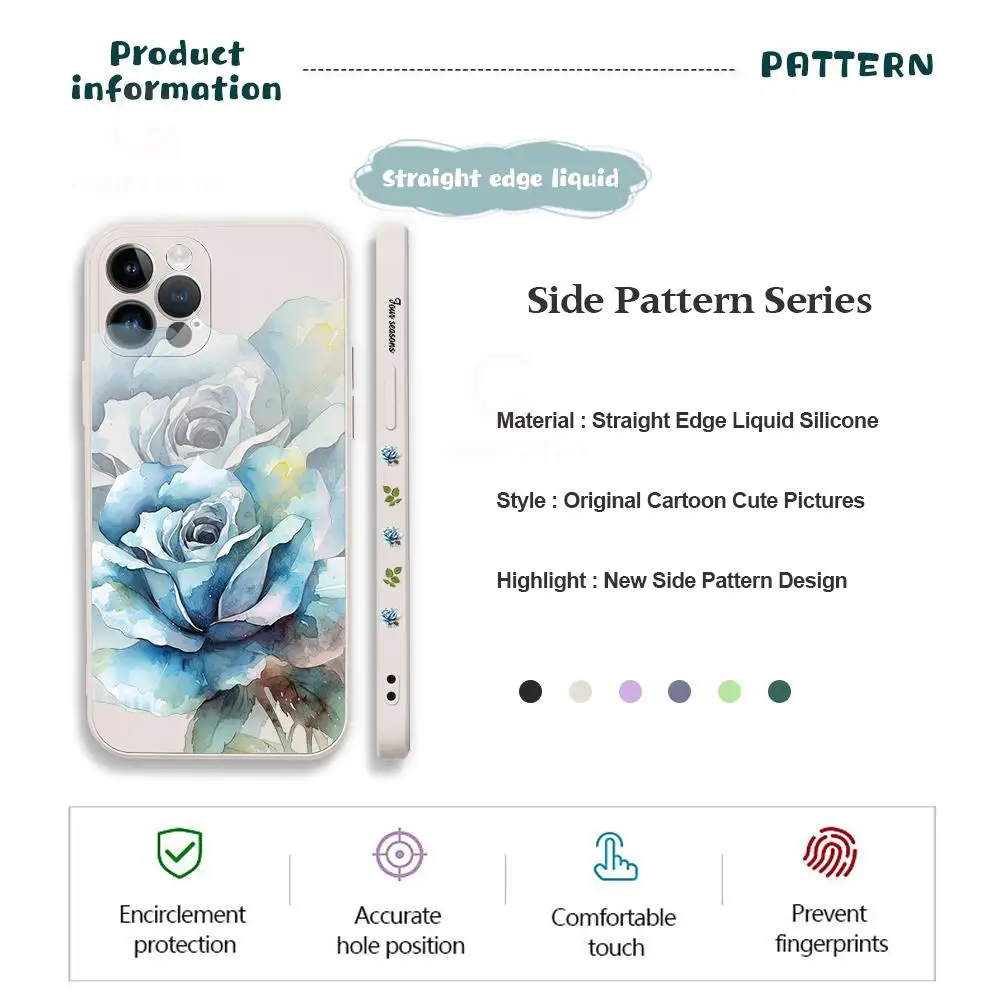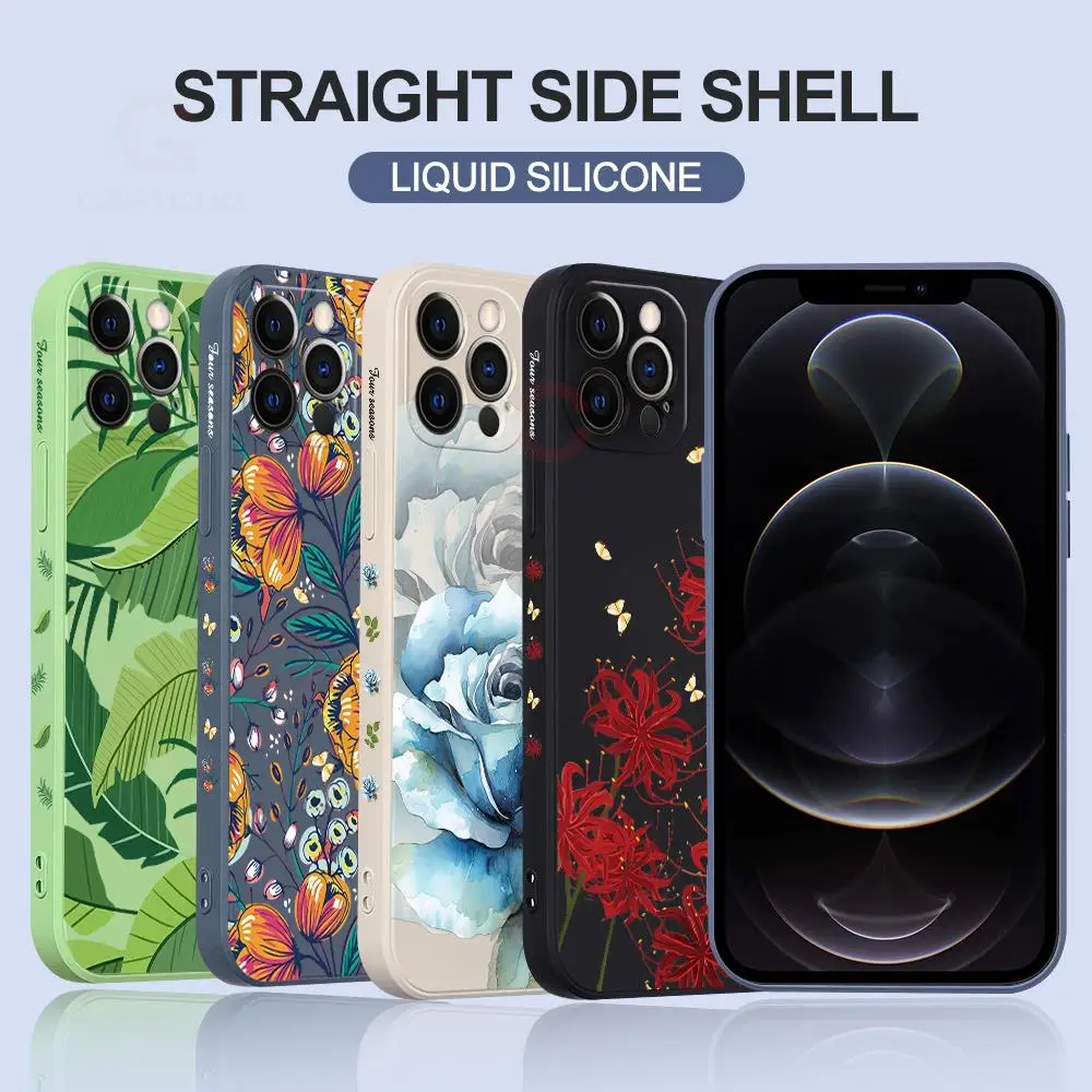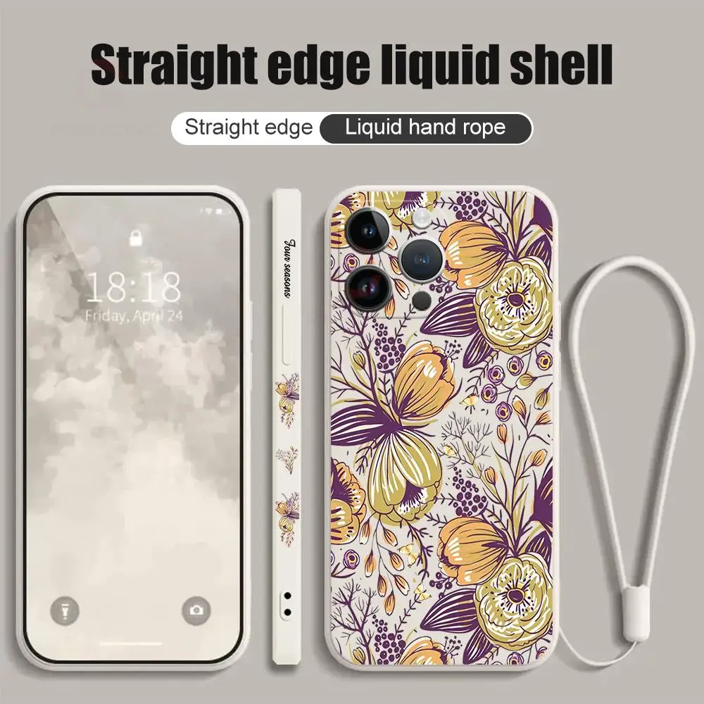 Nombre: funda de teléfono suave con patrón de flores. Característica A: funda de teléfono de silicona líquida. Forro de franela. Característica B: con cordón de soporte de mano. Característica C: piel de bebé, tacto cómodo. Característica D: a prueba de caídas. a prueba de golpes, a prueba de arañazos, protección de lentes