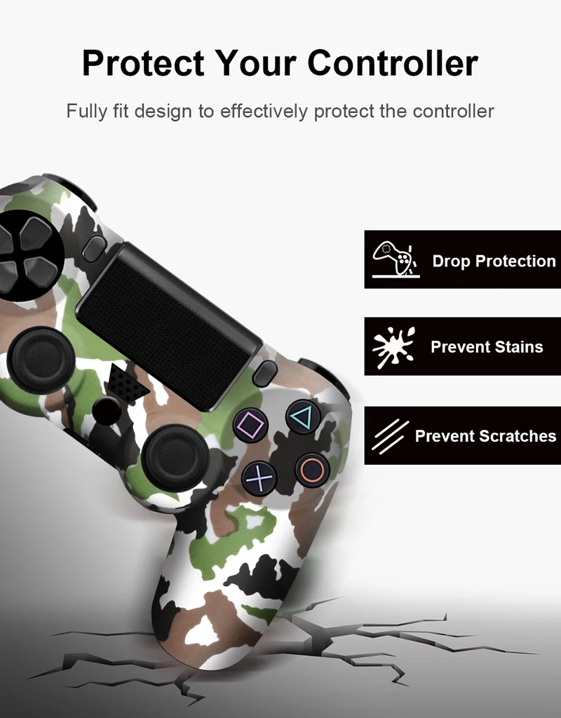 Evita cualquier daño al controlador PS4 por golpes, arañazos. La fricción de Silicona proporciona un agarre cómodo, evita el deslizamiento mientras se juega, no más preocupaciones por las manos sudorosas. Muy fácil de instalar y quitar, se adapta perfectamente al mando de la PS4, no afecta a ninguna función. Camuflaje de tecnología de impresión de transferencia de agua en el controlador PS4, más aspecto de moda.