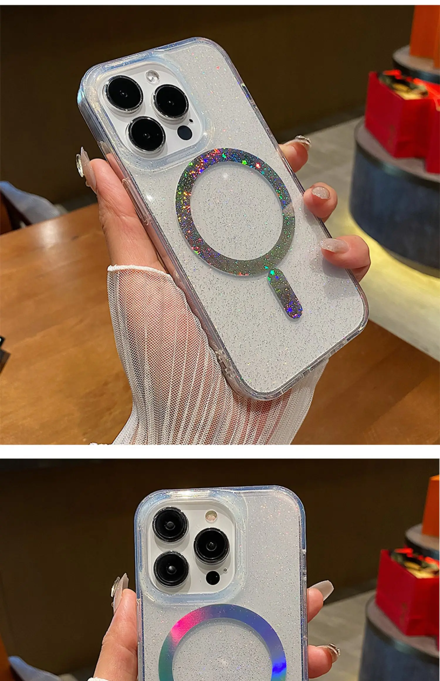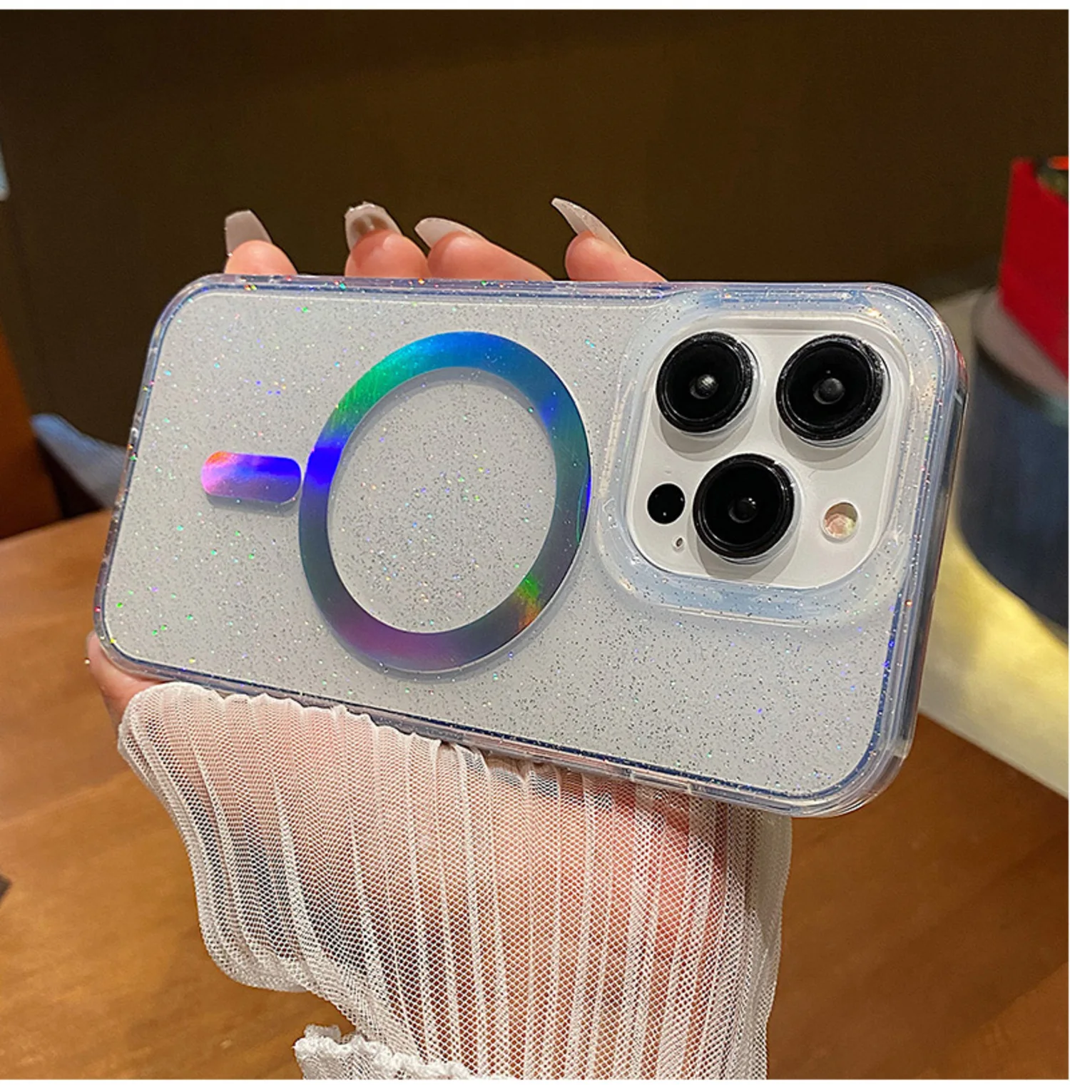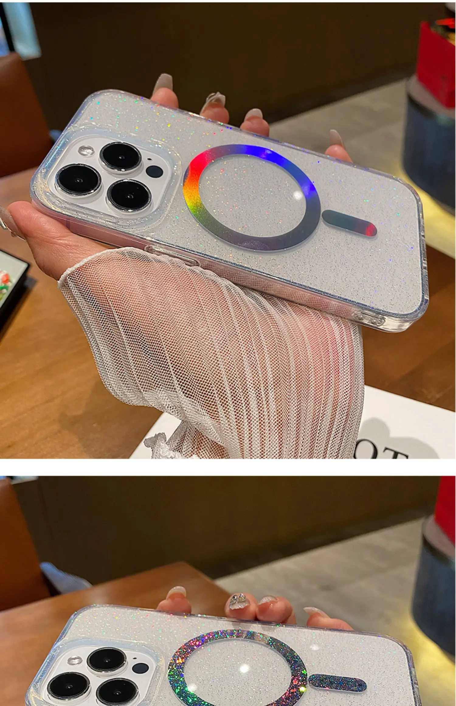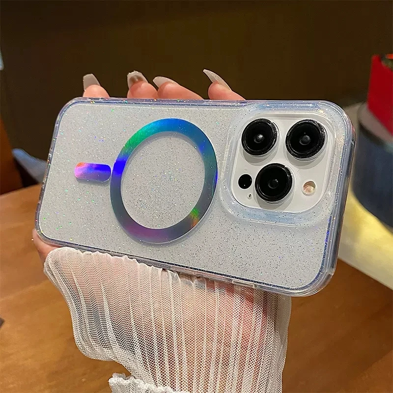 Comprar Funda holográfica magnética para iPhone 15 Pro Max, 11, 12, 13, 14 Pro Max, 14, 15 Plus, purpurina transparente para carga Magsafe, cubierta suave
