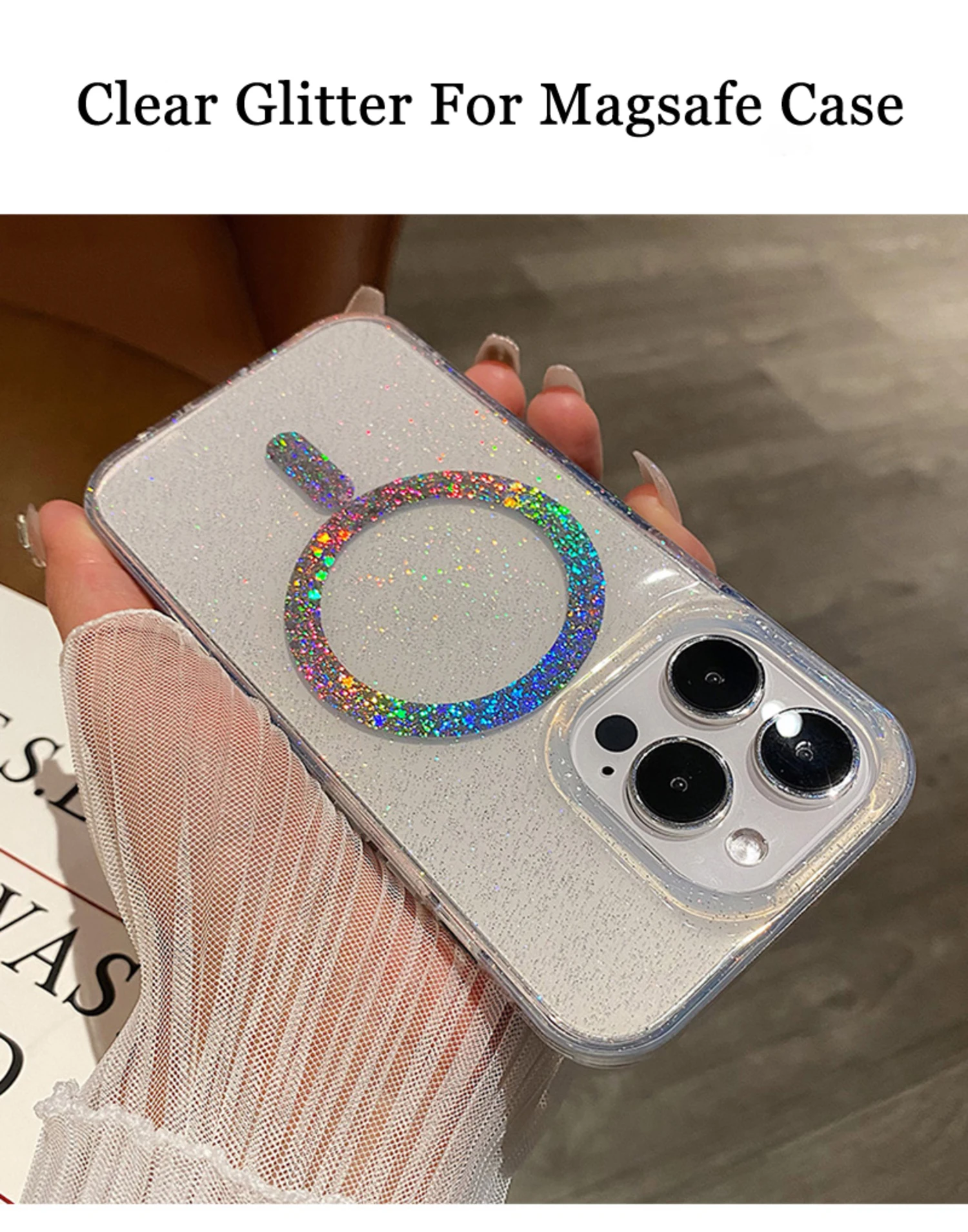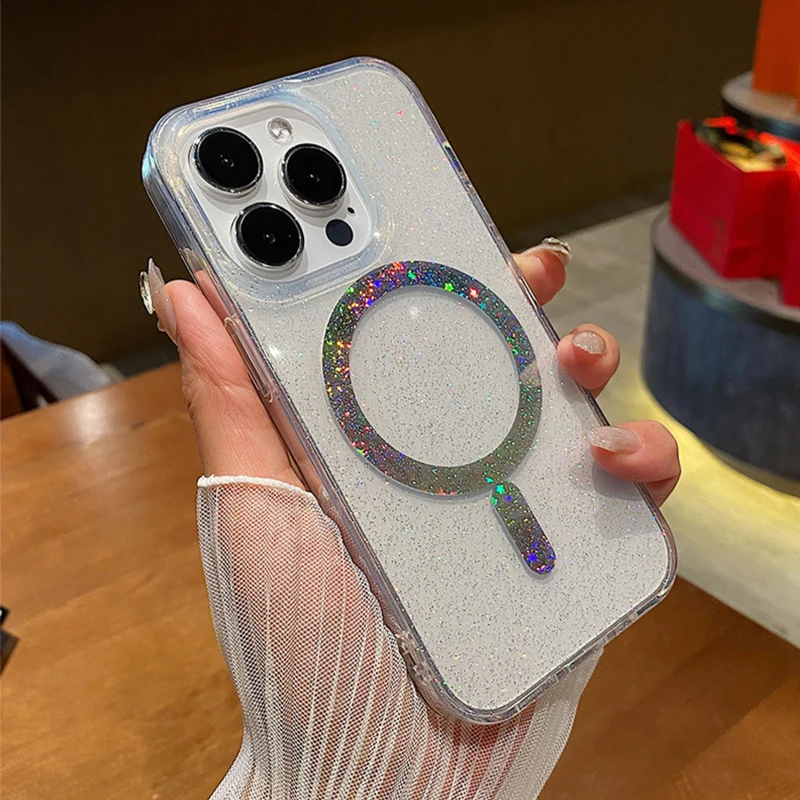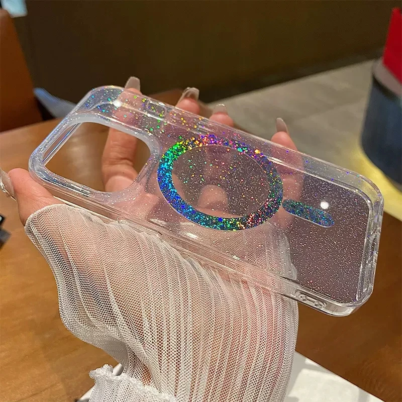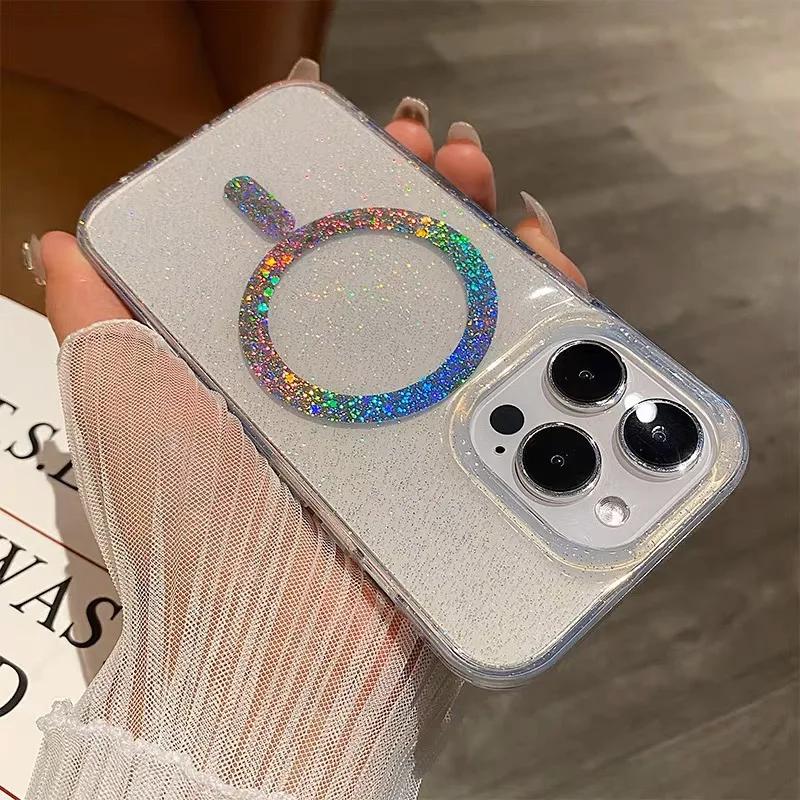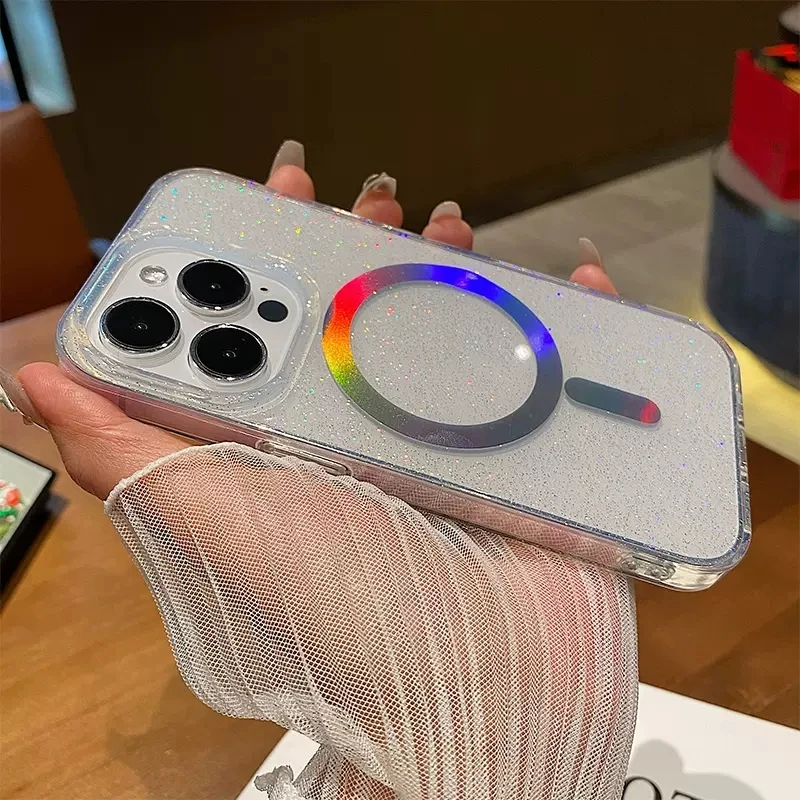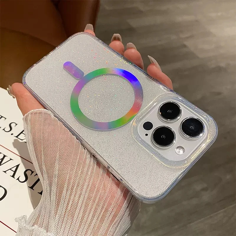 Comprar Funda holográfica magnética para iPhone 15 Pro Max, 11, 12, 13, 14 Pro Max, 14, 15 Plus, purpurina transparente para carga Magsafe, cubierta suave