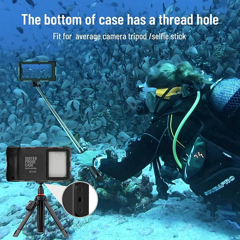 [La imagen/vídeo es clara] El diseño completamente sellado evita que el agua entre en el teléfono. Hay un orificio de tornillo de 1/4 pulgadas-20 pulgadas en la parte inferior de la carcasa del teléfono, puede usar el palo de selfie para tomar fotos/videos bajo el agua.