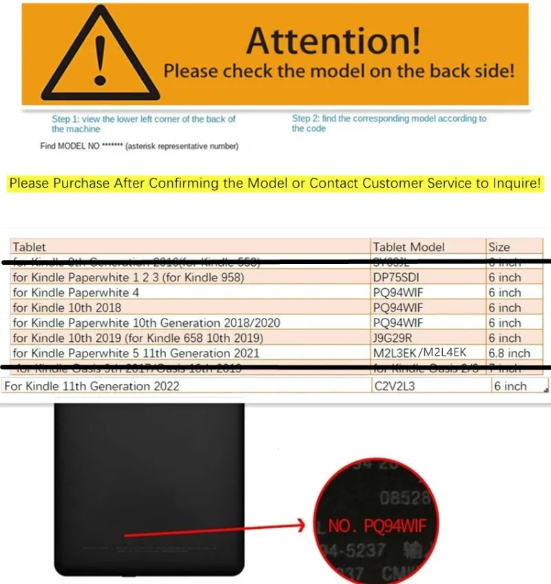 For Amazon All-new Kindle Paperwhite (11th generation released in 2022,Model No.C2V2L3)For Kindle Paperwhite 5 (11th generation 2021 released, Model No.M2L3EK/M2L4EK)For Kindle Paperwhite 4 (10th Gen, 2018 released, Model No. PQ94WIF)For Kindle Paperwhite 1/2/3 (prior to 2015, Model No. EY21 & DP75SDI),For Kindle (10th Gen, 2019 Released, Model No. J9G29R).