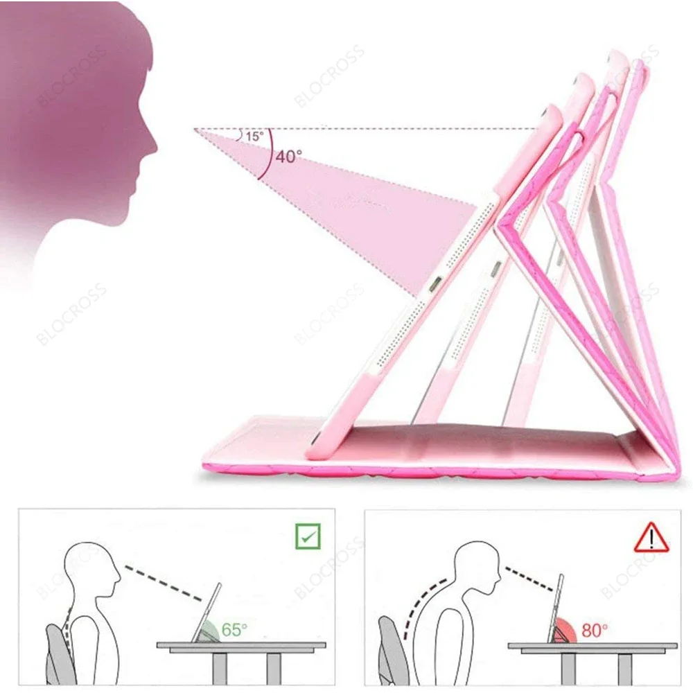 4.Posiciones del soporte: este estuche le permite ajustar su iPad en múltiples ángulos.La funda cuenta con una hebilla magnética que se coloca fácilmente cuando está cerrada. Compatibilidad: