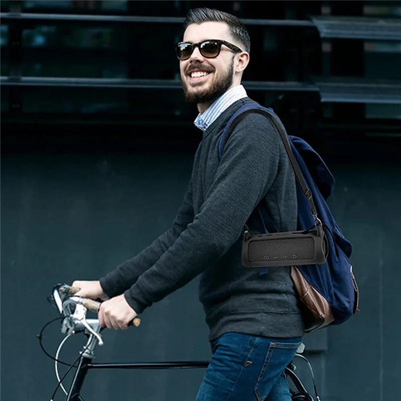 4.Diseño conveniente: está diseñado principalmente para facilitar su transporte al aire libre, está diseñado con 2 ganchos en el costado, con este lazo de goma puede sujetar el altavoz a casi cualquier cosa, también puede abrochar la correa para el hombro, lo que le permite llevarlo fácilmente a cualquier lugar. Viene con un mosquetón conveniente para llevarlo a la mochila, bicicleta y más, sin importar lo que esté caminando, sujetando, etc.