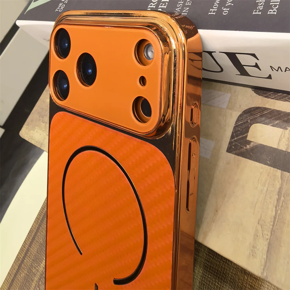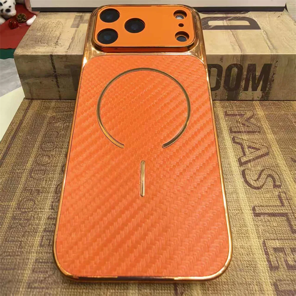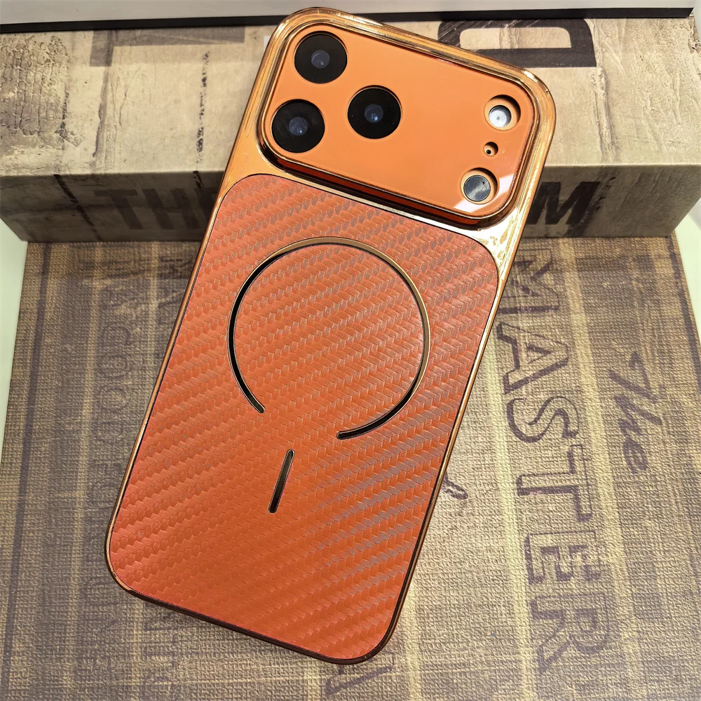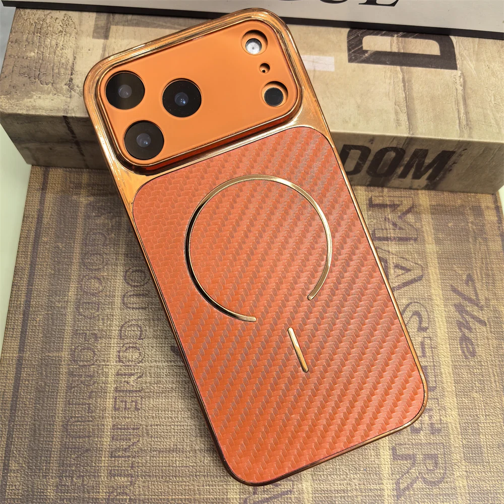 Funda de ventana grande de fibra de carbono de lujo para iPhone 17 Air 16 15 14 13 Pro Max Plus para Magsafe cubierta de armadura chapada en carga inalámbrica