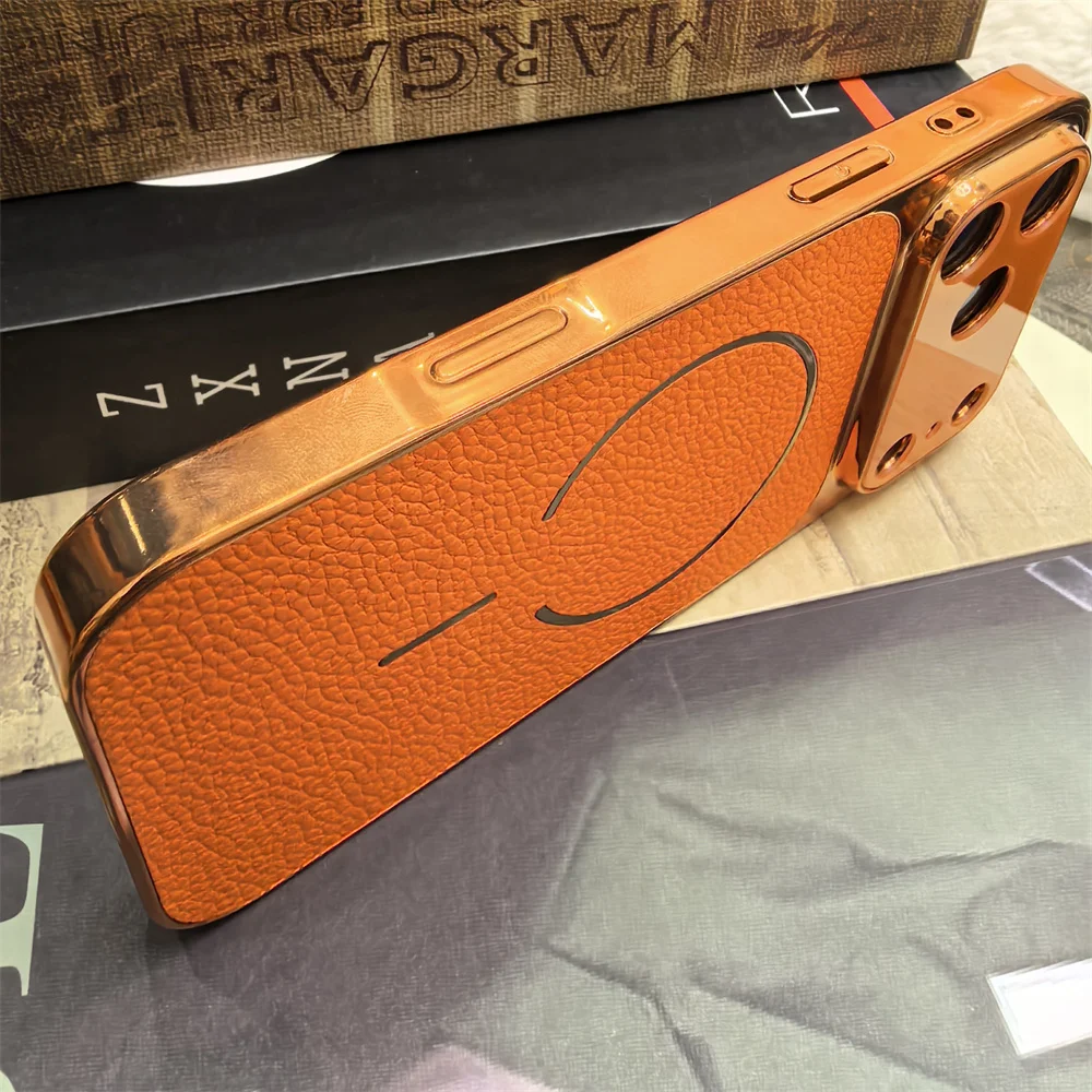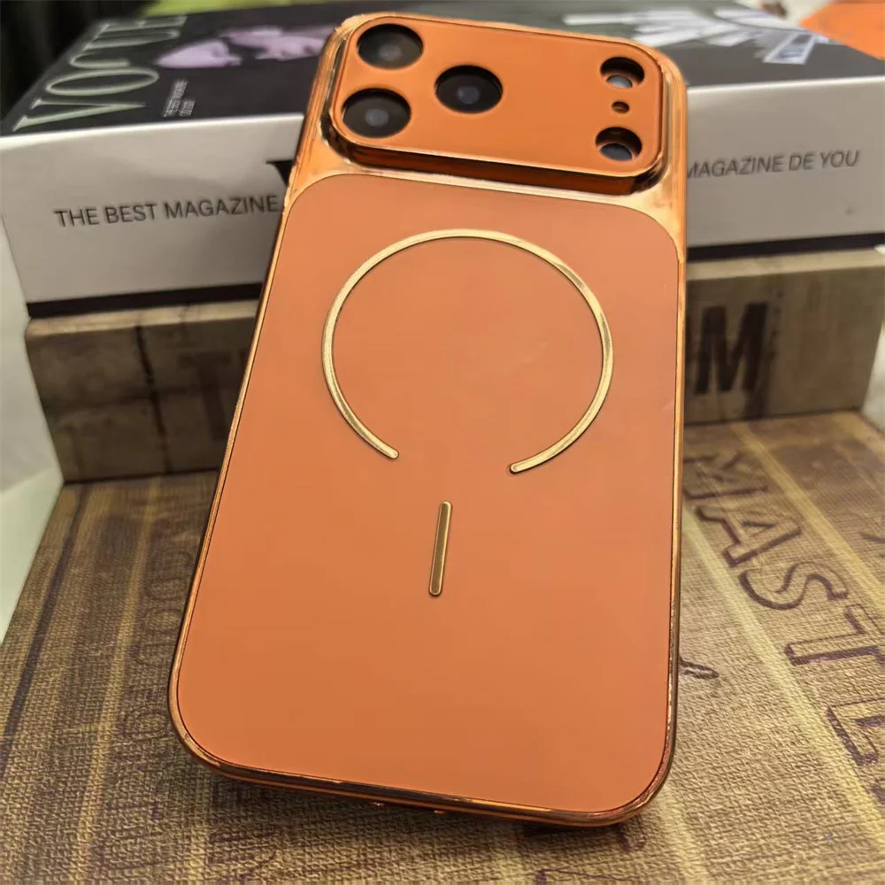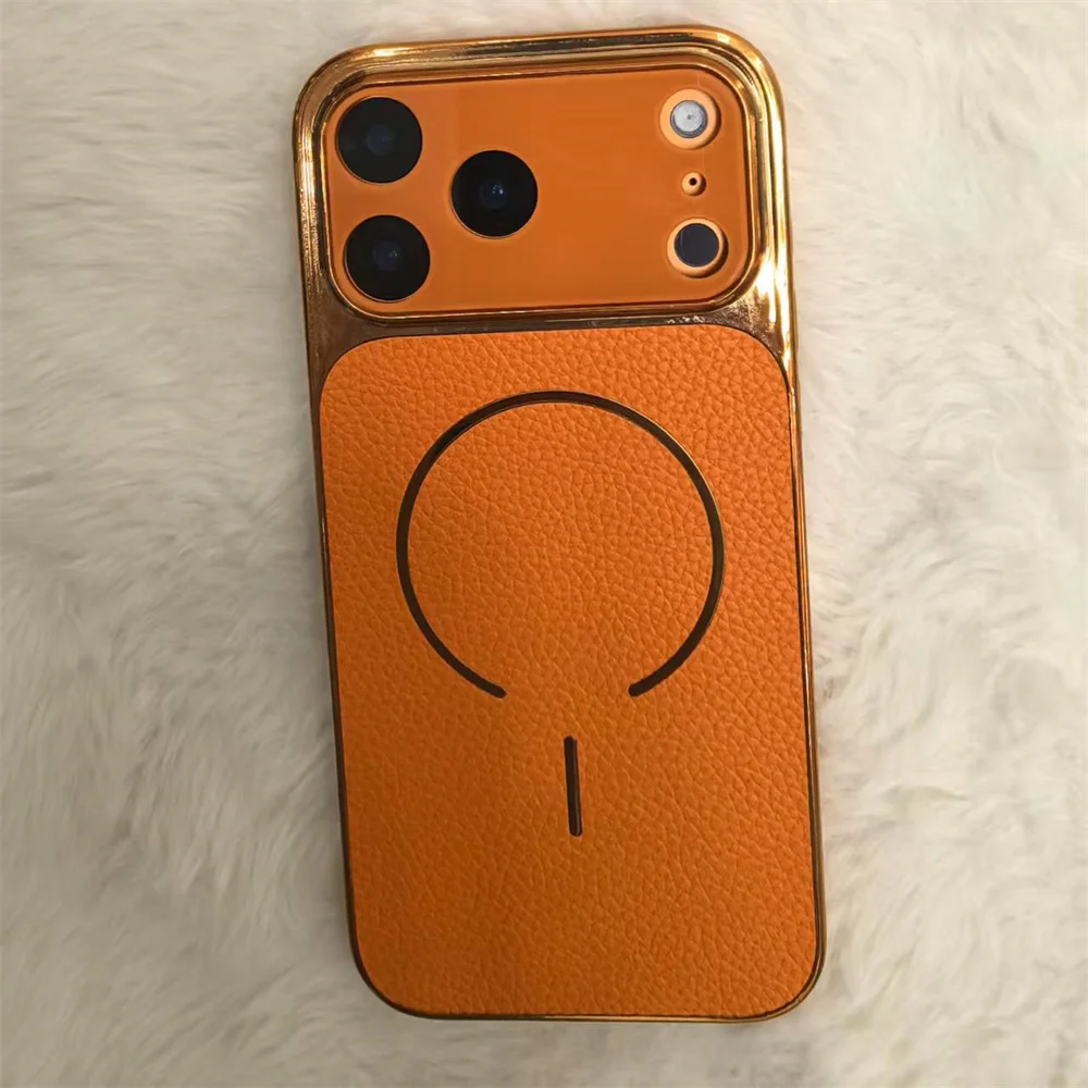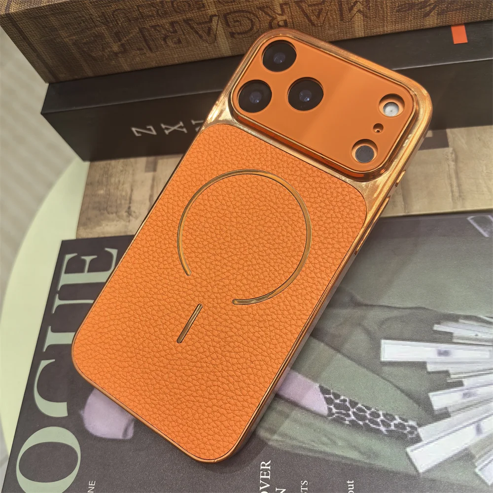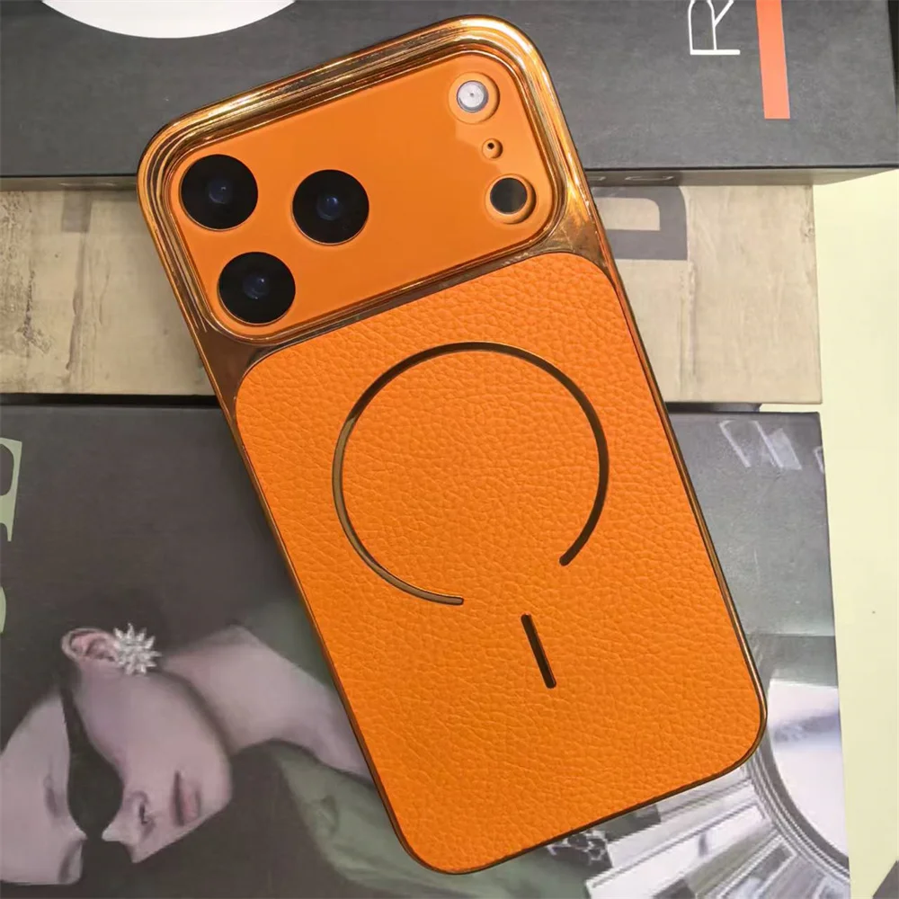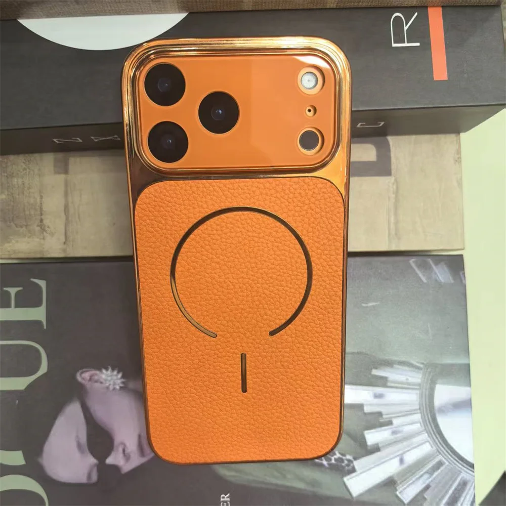 Funda de ventana grande con textura de cuero de lujo para iPhone 17 Air 16 15 14 13 Pro Max Plus, funda chapada en carga inalámbrica Magsafe