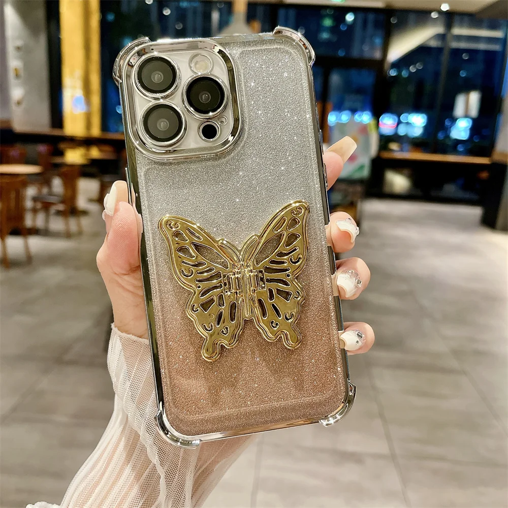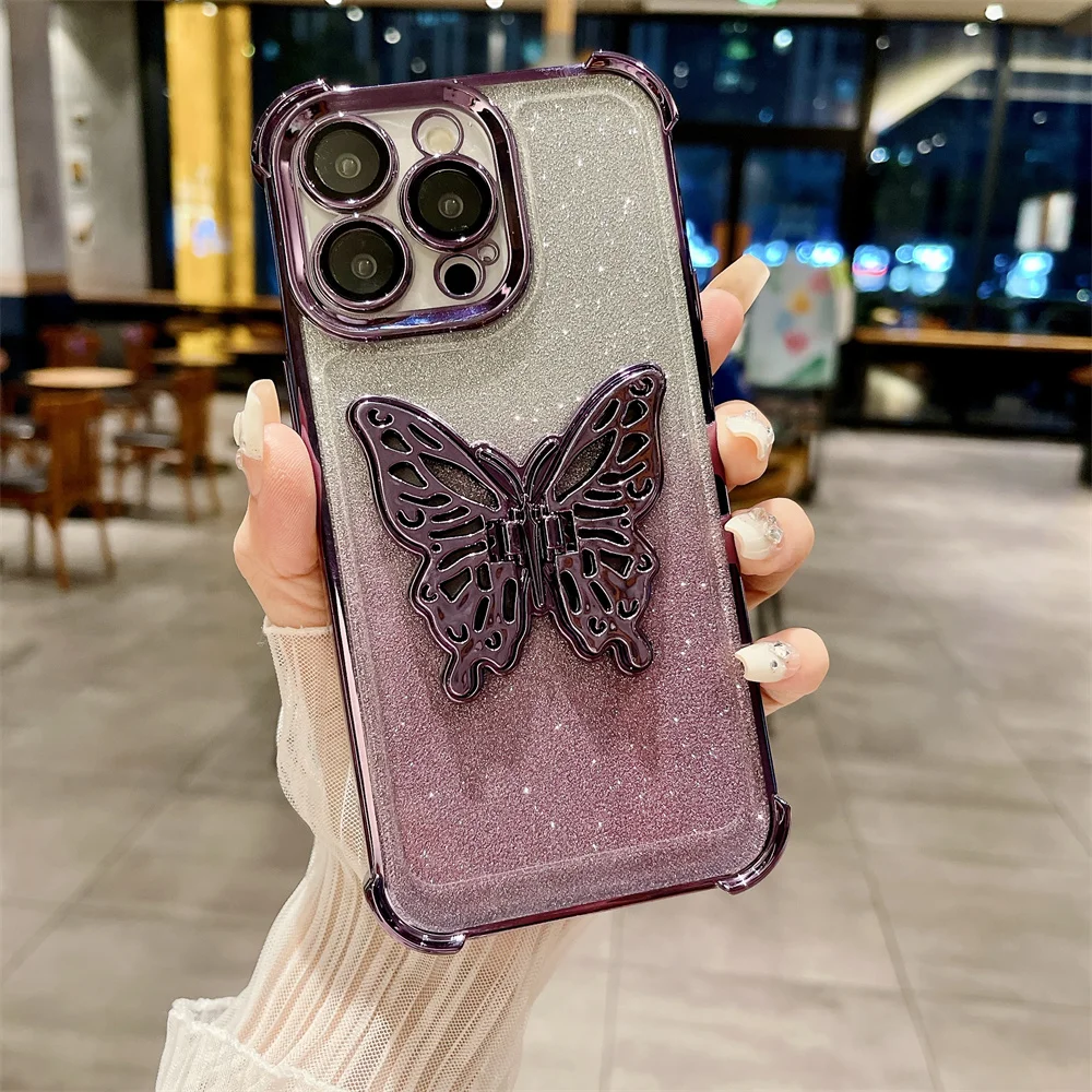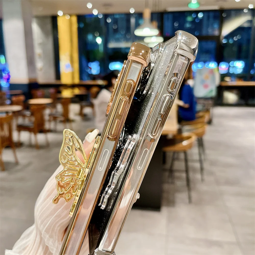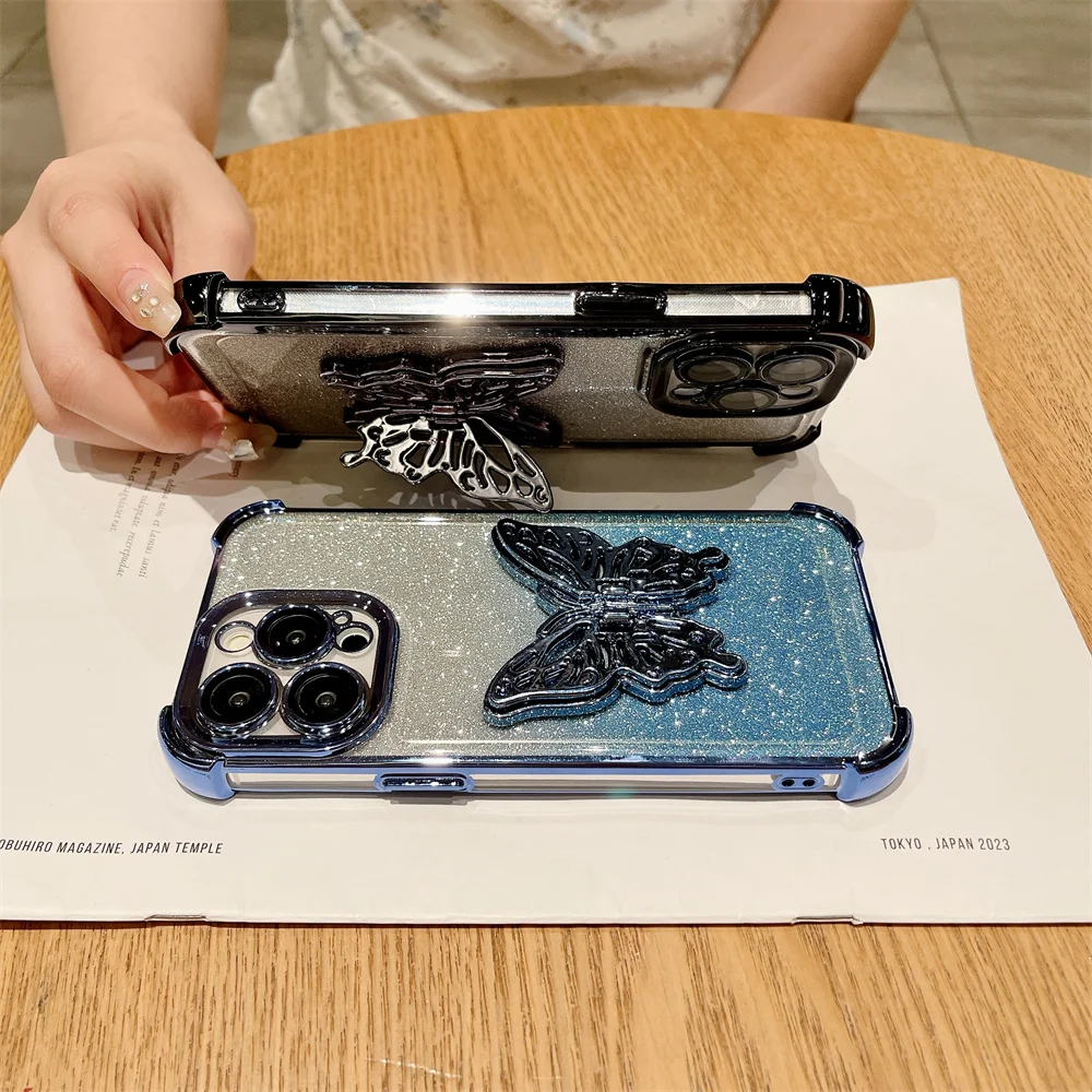 Comprar Funda de lujo con soporte de mariposa chapado en Airbag para iPhone 15 Pro Max 14 Plus, funda con purpurina para iPhone 13 12 11 Pro Xs Max Xr