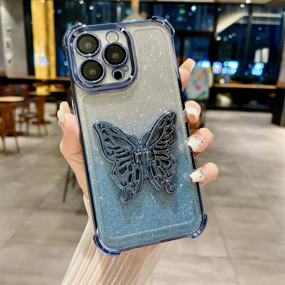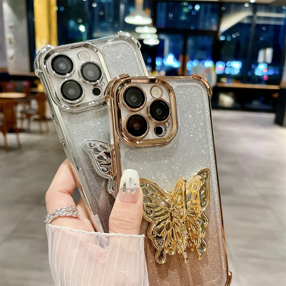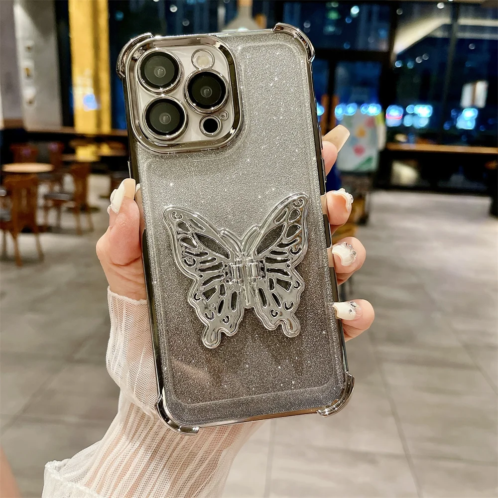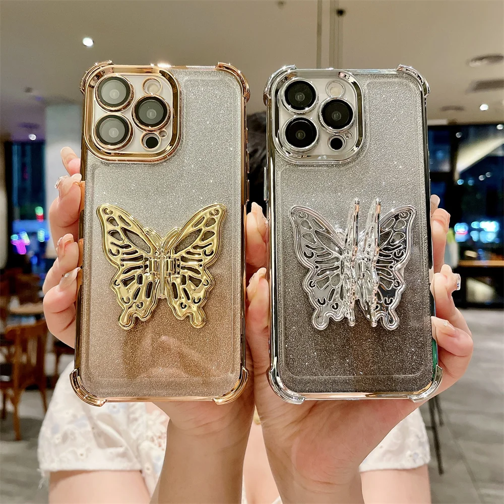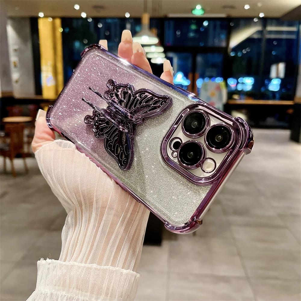 Comprar Funda de lujo con soporte de mariposa chapado en Airbag para iPhone 15 Pro Max 14 Plus, funda con purpurina para iPhone 13 12 11 Pro Xs Max Xr