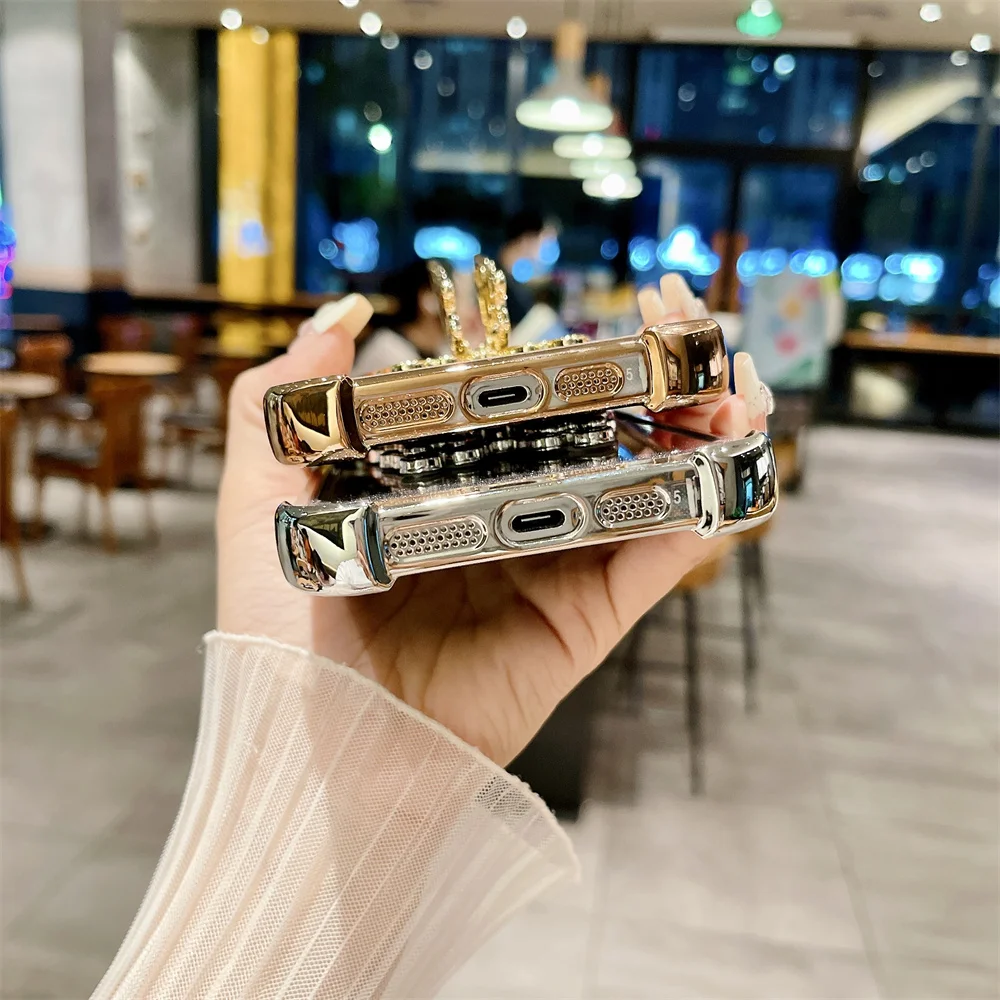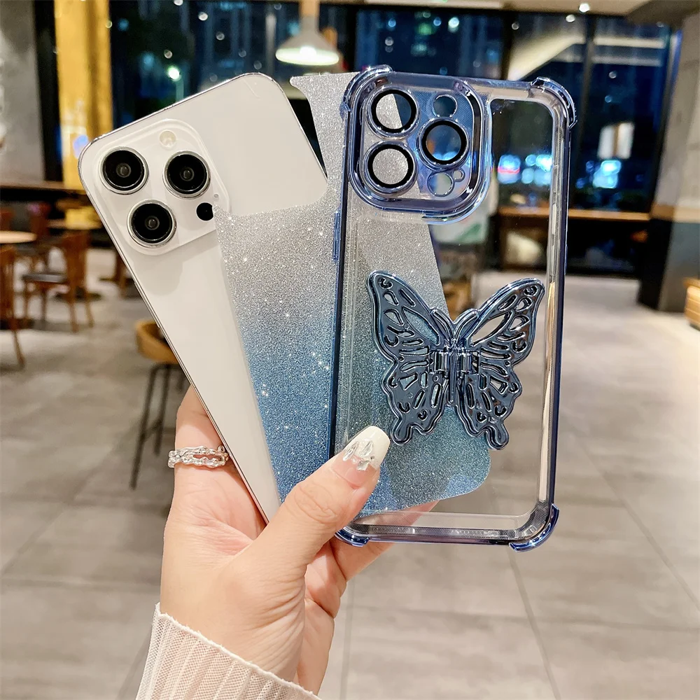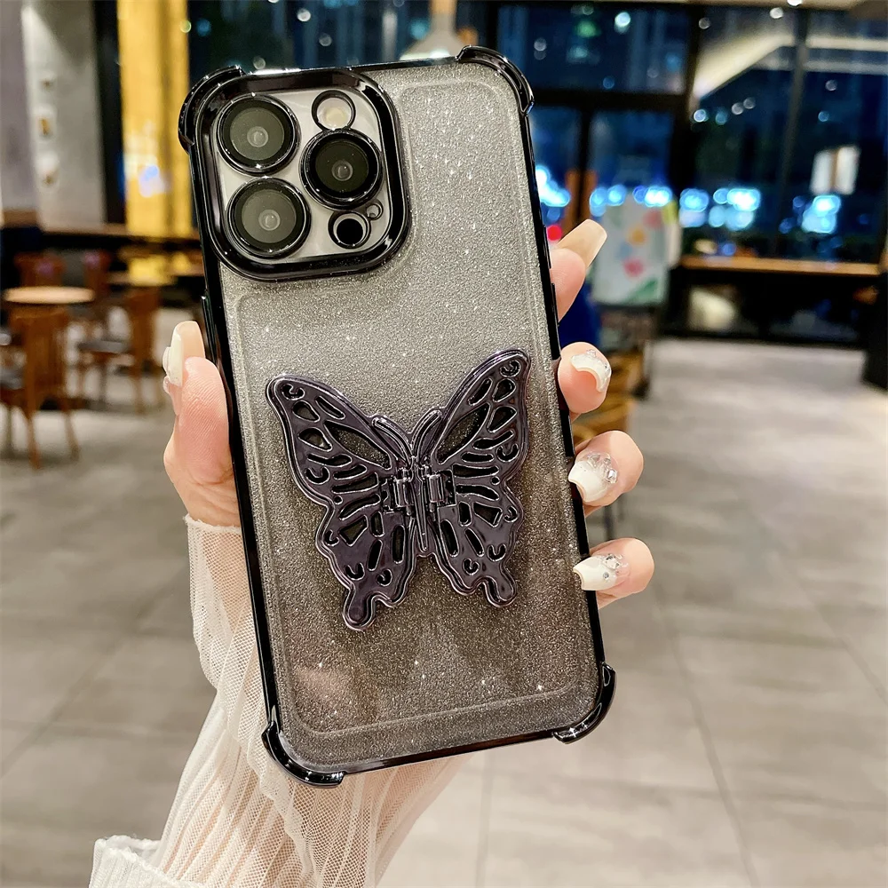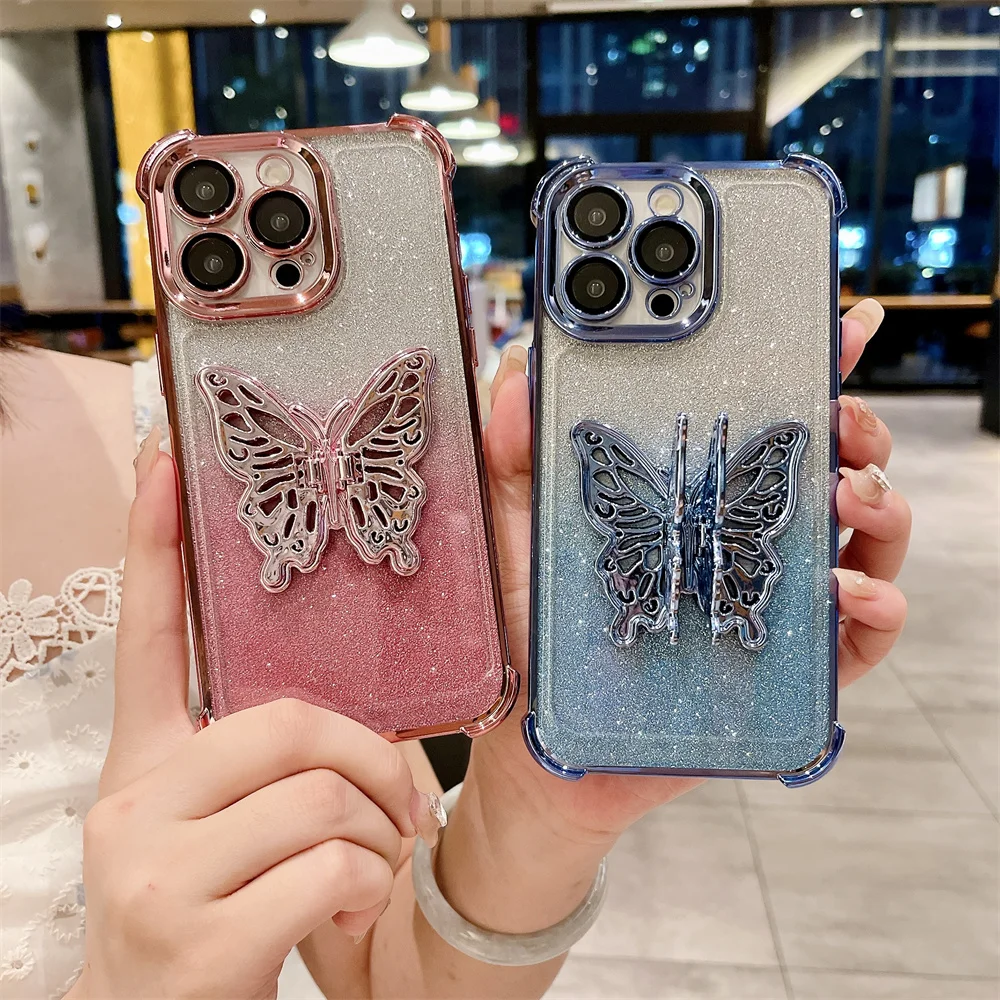 Comprar Funda de lujo con soporte de mariposa chapado en Airbag para iPhone 15 Pro Max 14 Plus, funda con purpurina para iPhone 13 12 11 Pro Xs Max Xr
